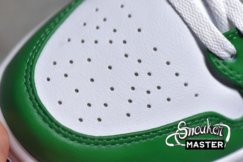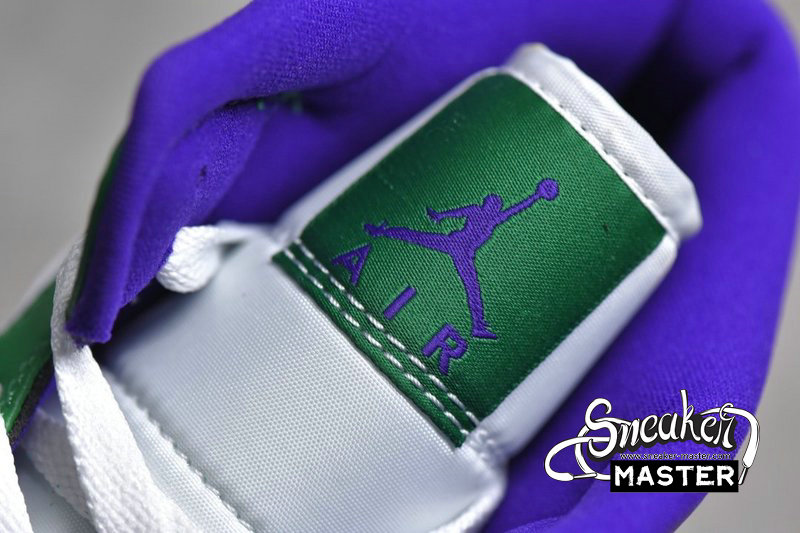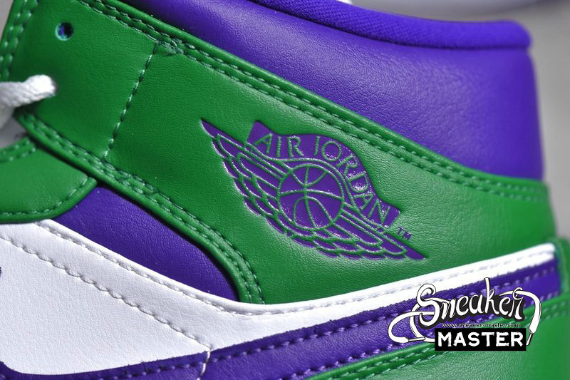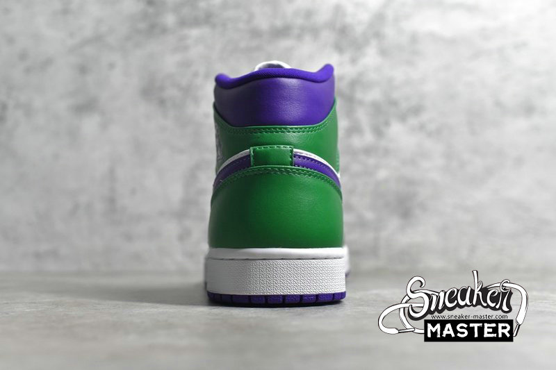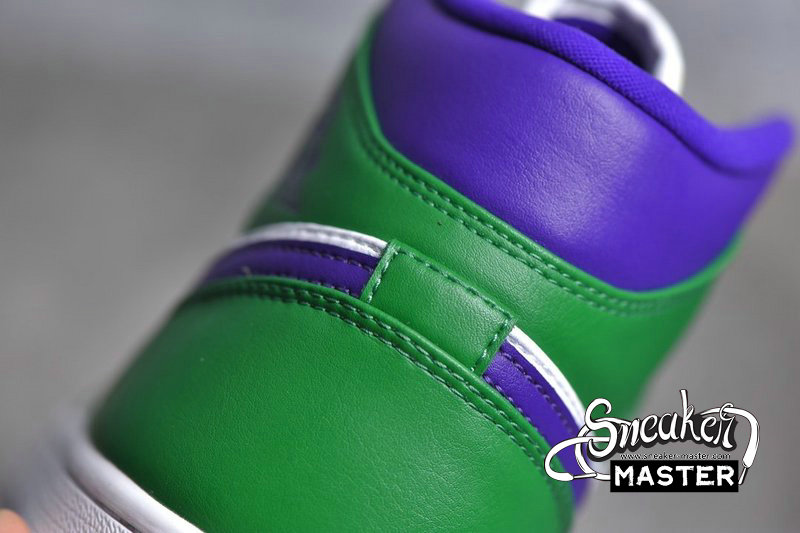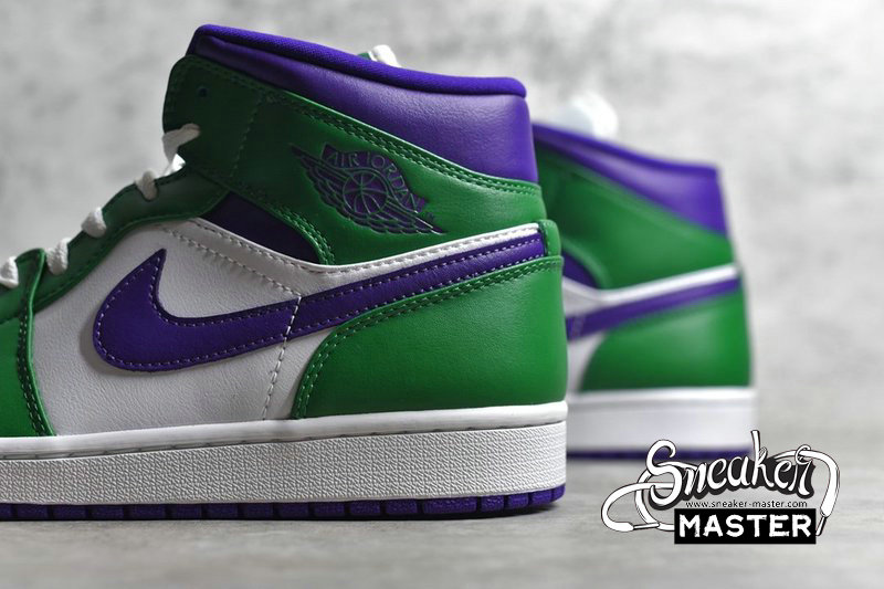 - Looking closer this mid-top Air Jordan 1 comes with White leather across the panels and toe while Green leather is applied to the leather overlays. Connecting the theme is the use of Purple which lands on the ankle collar, tongue label, Swoosh and rubber outsole.