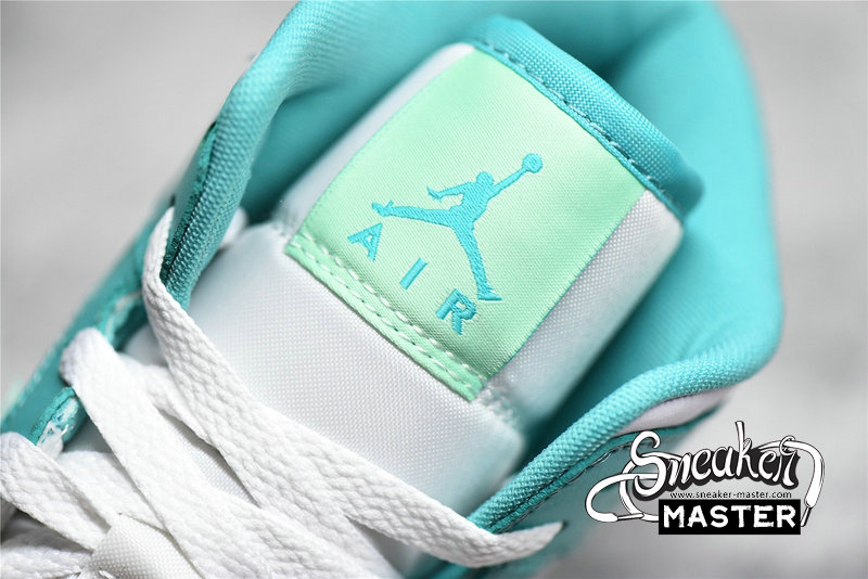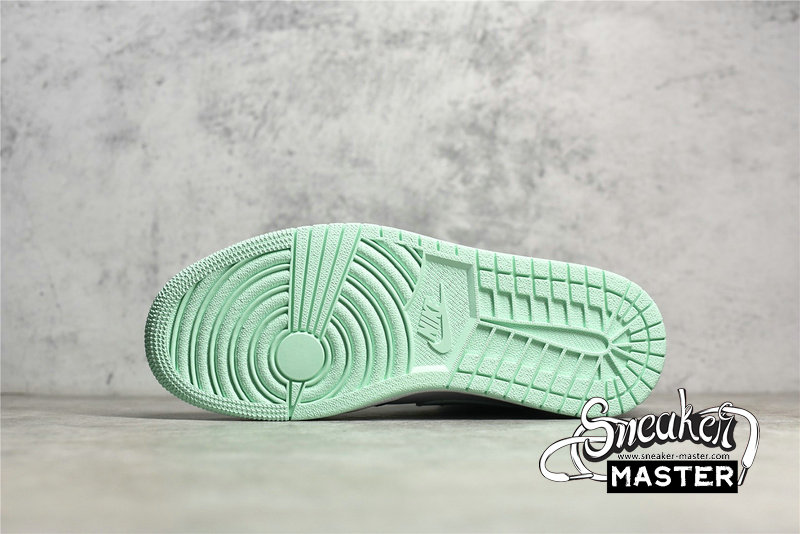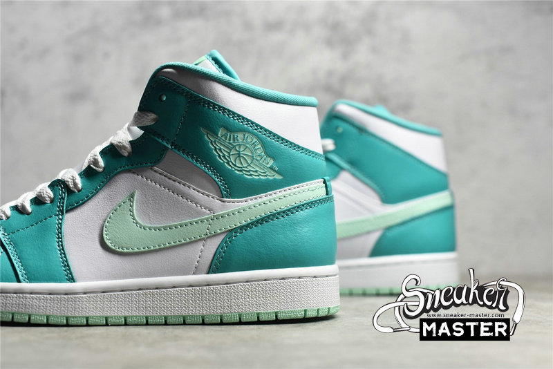 - This offering of the Air Jordan 1 Mid comes constructed in a full leather build featuring a White base with Green overlays and a pastel shade of Green on the Swooshes, tongue tags, Wings, and rubber outsole. White nylon tongues, laces, and midsole completes the design.