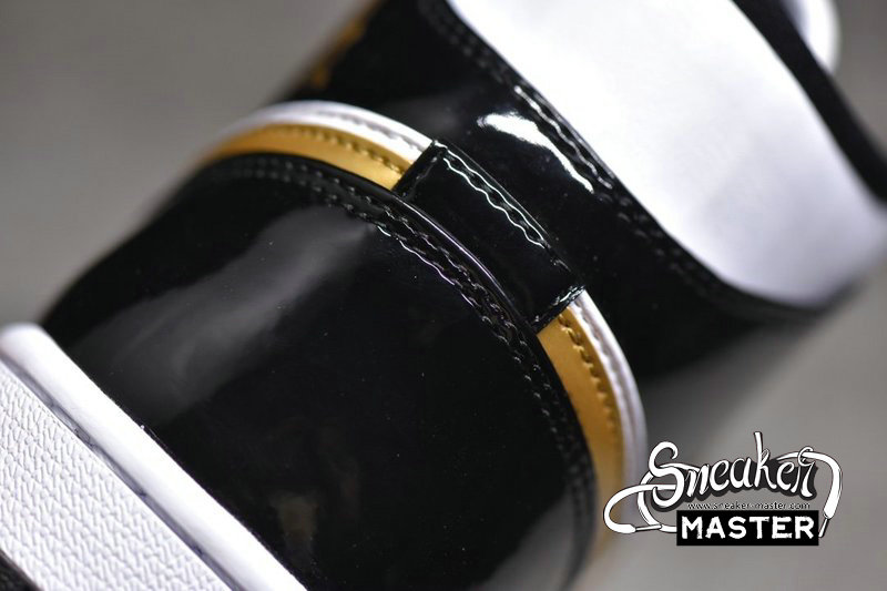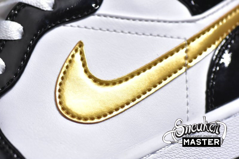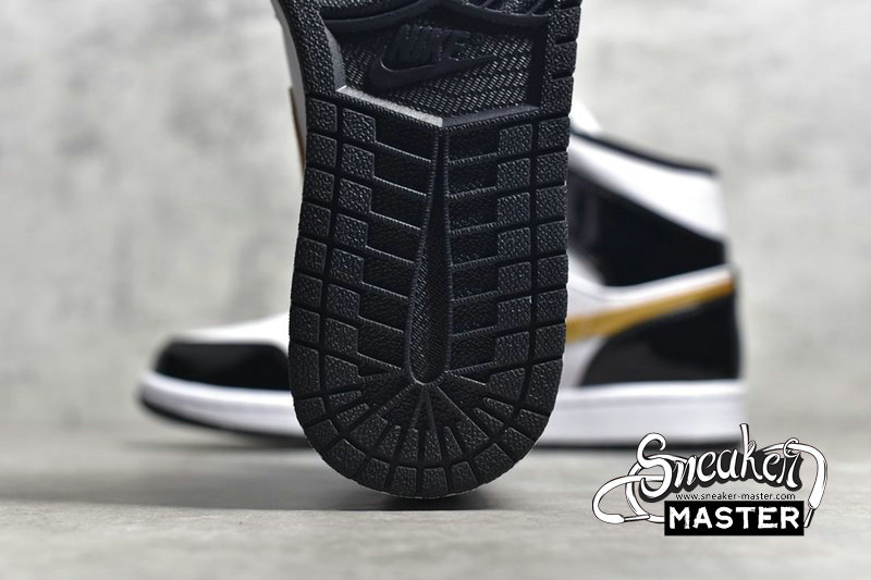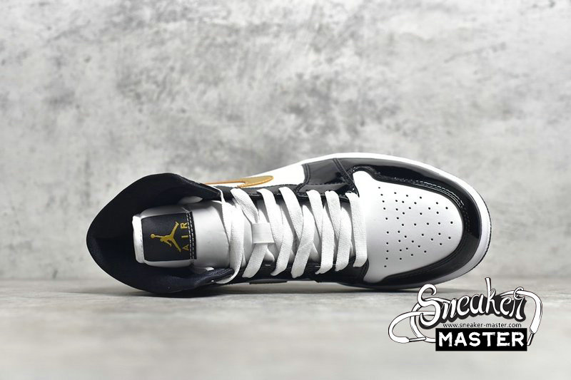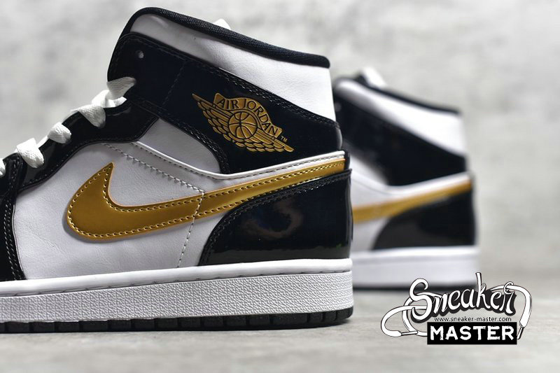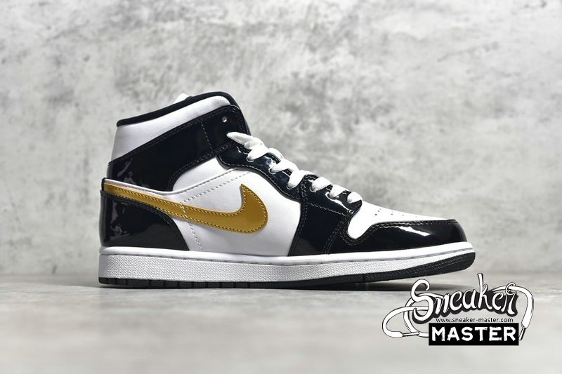 - Boasting familiar design ingredients from previously released Air Jordan 1s, the Air Jordan 1 Mid Patent ‘Black Gold’ features patent leather and metallic gold accents. The first emerges on the overlays that stand out against a classic white leather base. The second makes its appearance on the Swoosh and branding components that deck out the shoe’s collar, tongue tag, and sockliner.