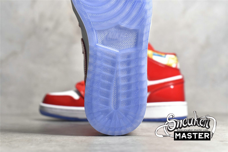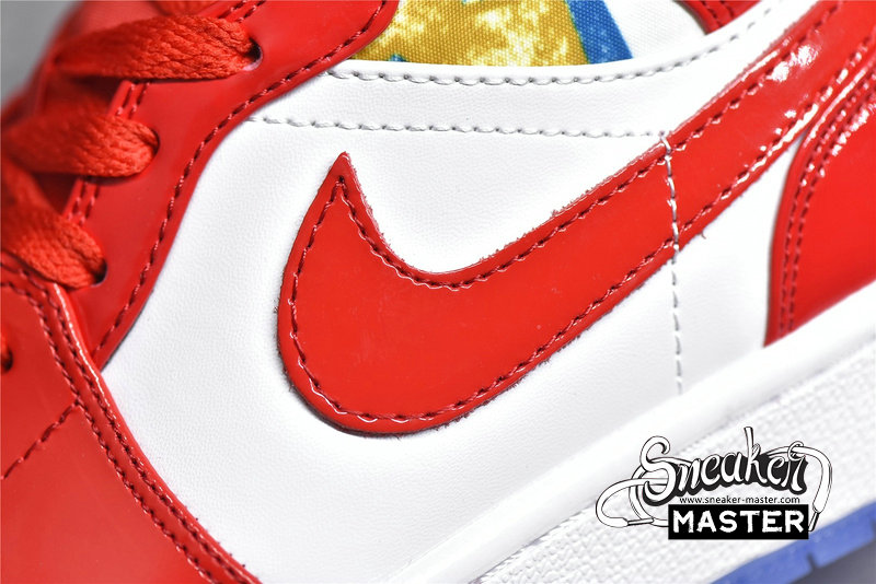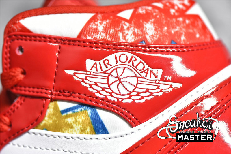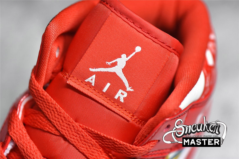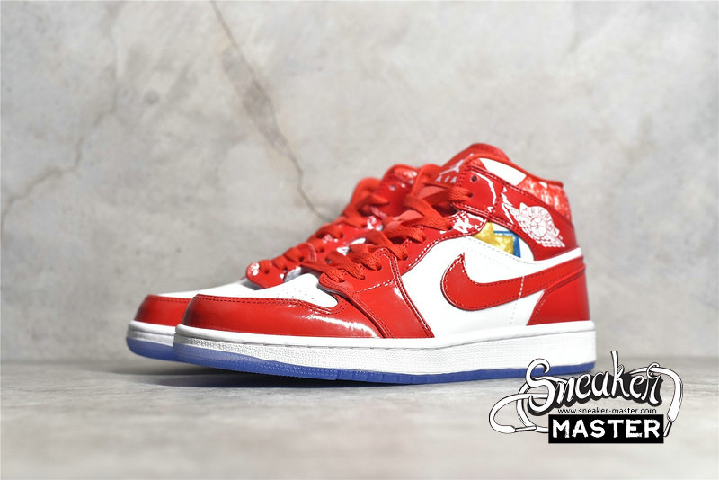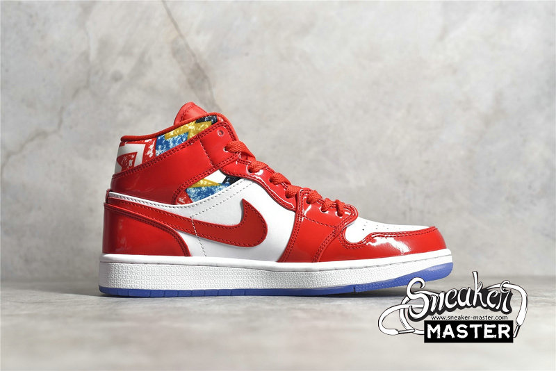 - This offering of the mid-top Air Jordan 1 features a White leather base with Red patent leather overlays and Swooshes. Red continues onto the tongue labels, laces, liner and insoles along with White Jumpman logos and matching midsole. Geometric print around the collar atop an icy outsole completes the design.