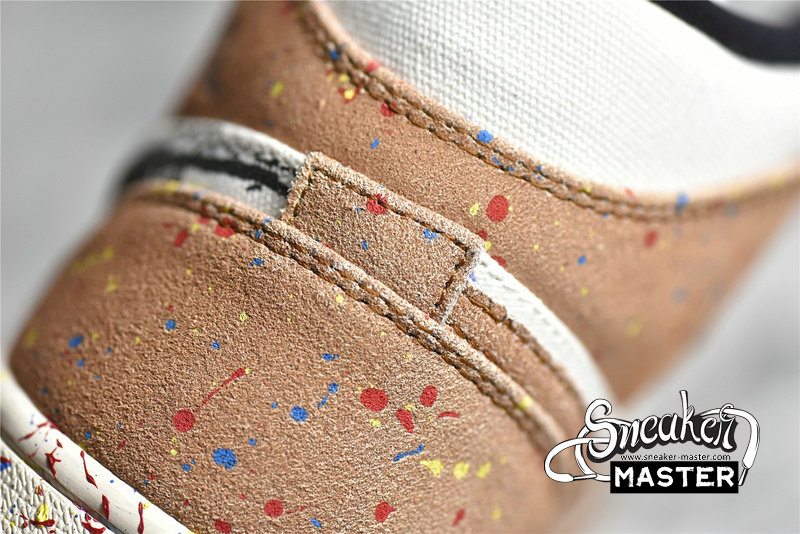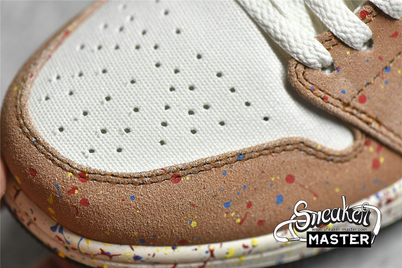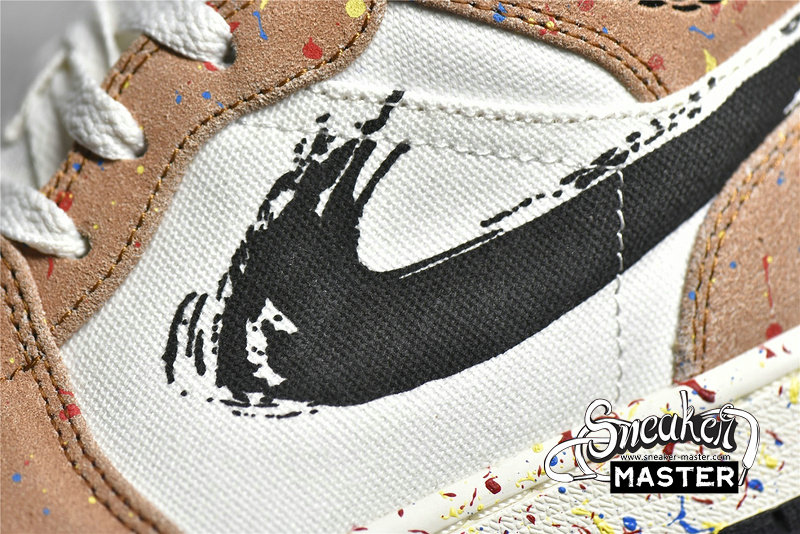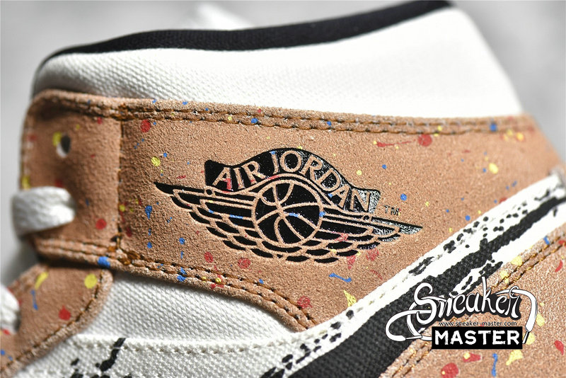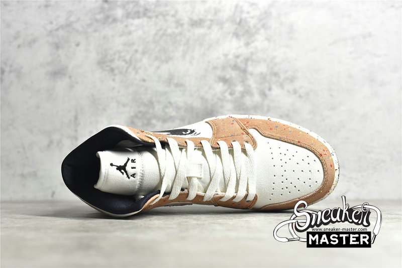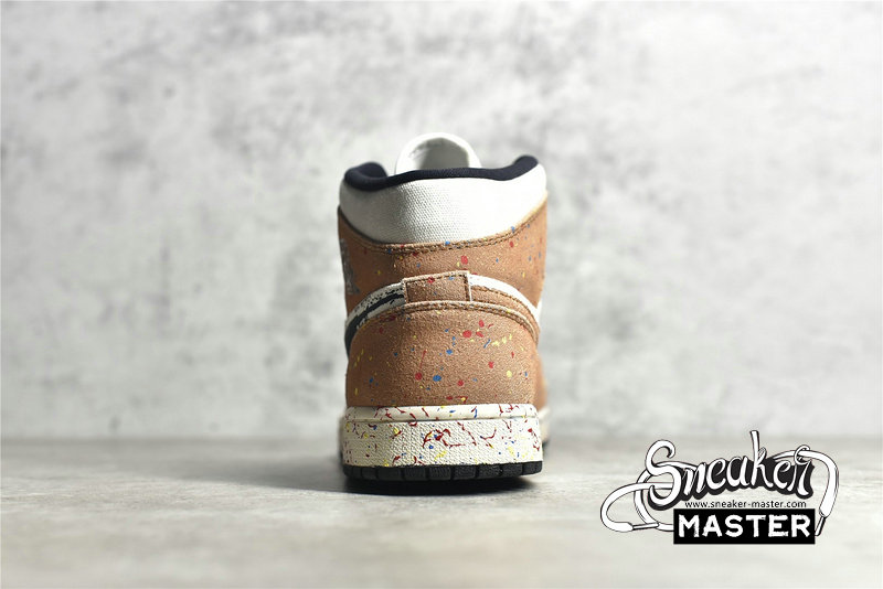 - The Air Jordan 1 Mid SE 'Brushstroke Paint Splatter' brings various art styles to its classic basketball build. The shoe's canvas upper appears with a white base, complemented by Cider overlays that sport multicolor paint drops. The mismatched Swoosh branding includes suede on the medial side and a painted-on black Swoosh on the lateral, while underfoot, more paint splatter appears on the Air midsole, which provides cushioning.