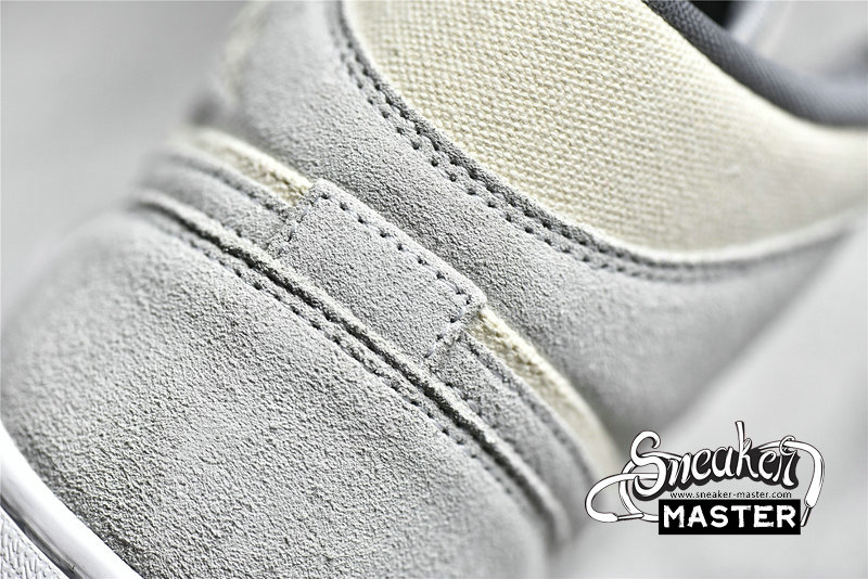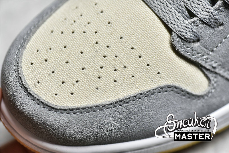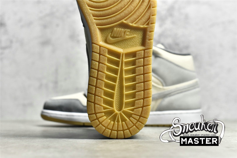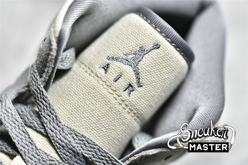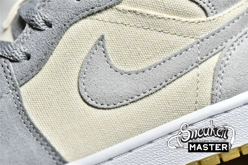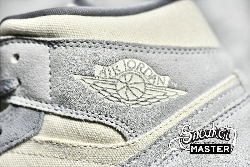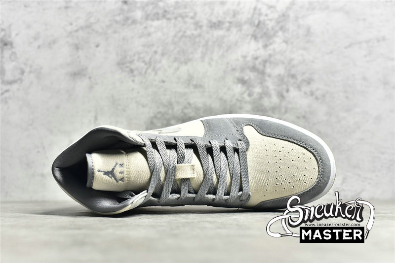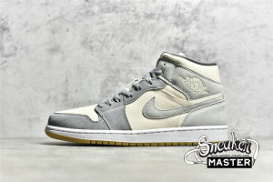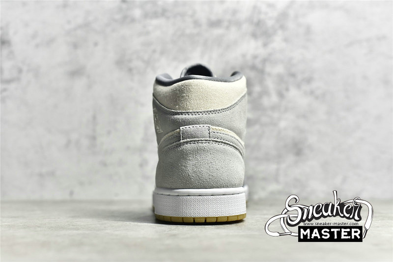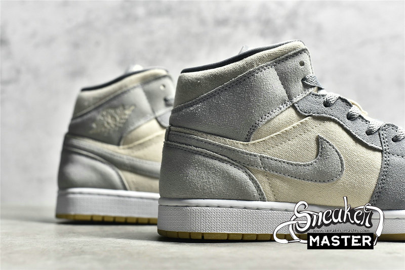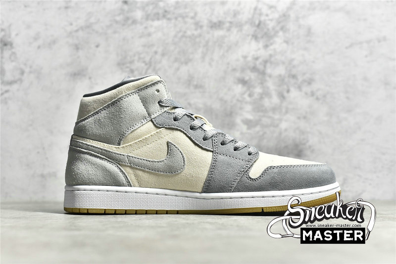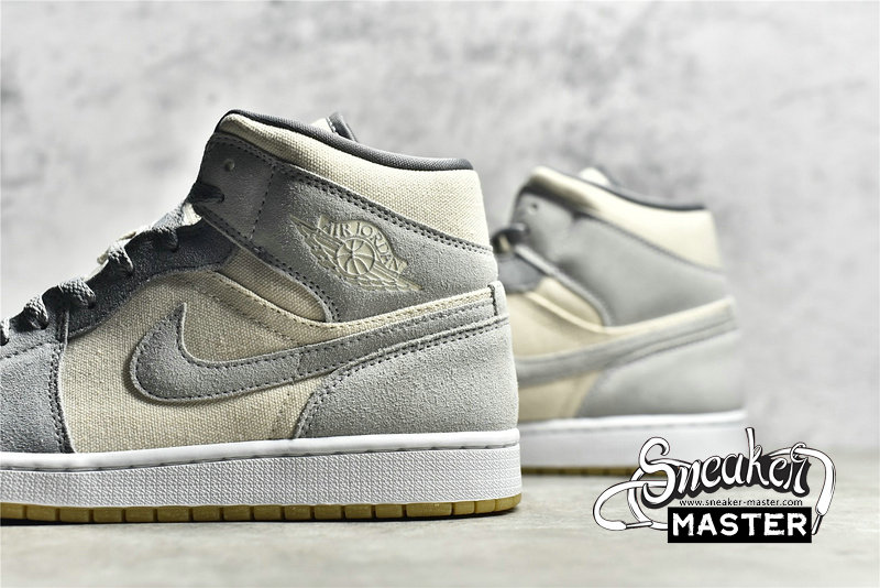 - This offering of the mid-top Air Jordan 1 features a Cream canvas base with Grey suede overlays. Grey continues on the tongue branding, laces and lining while the shoe is completed with a White midsole and Gum rubber outsole.