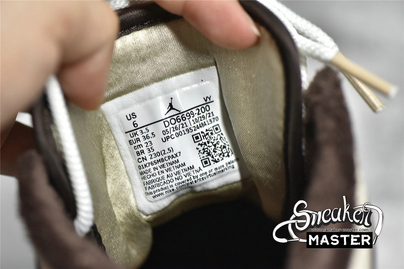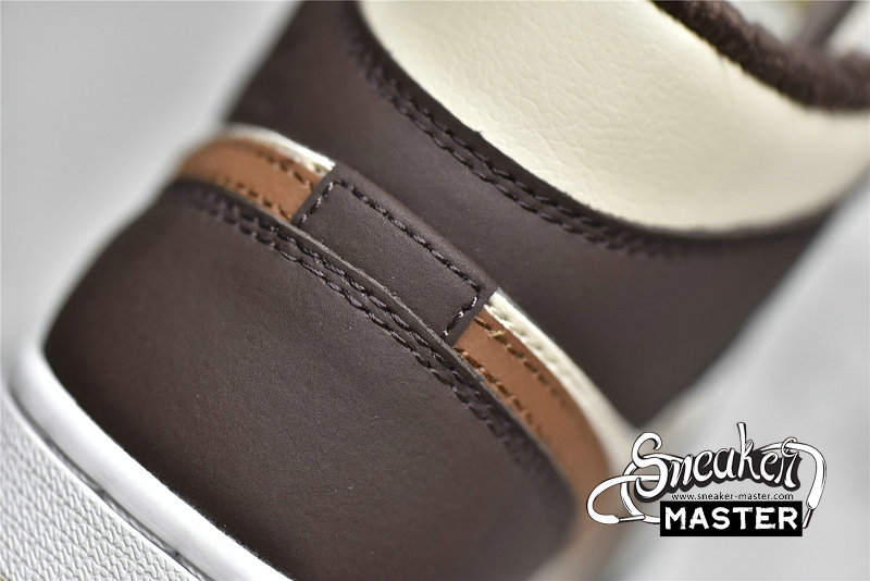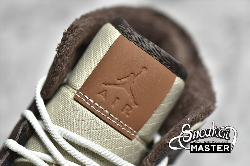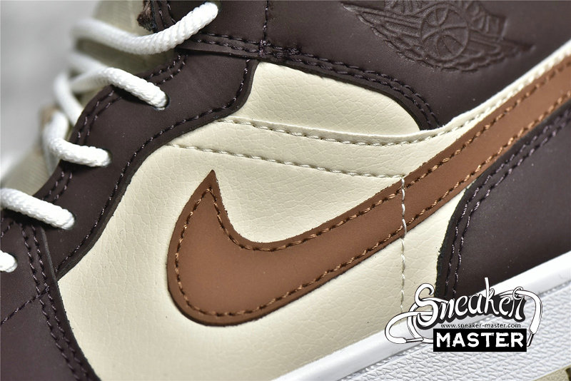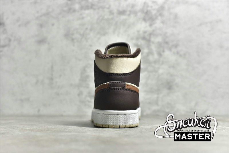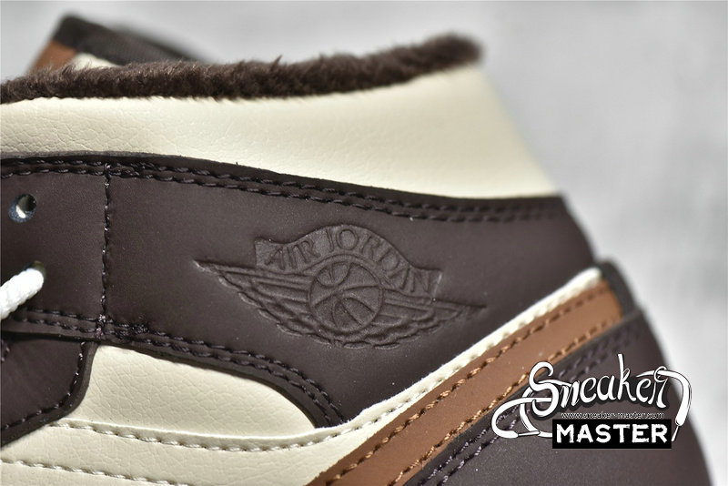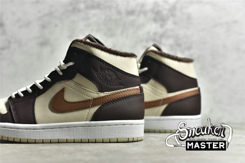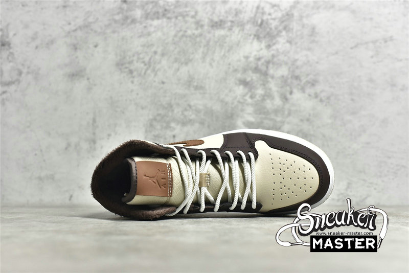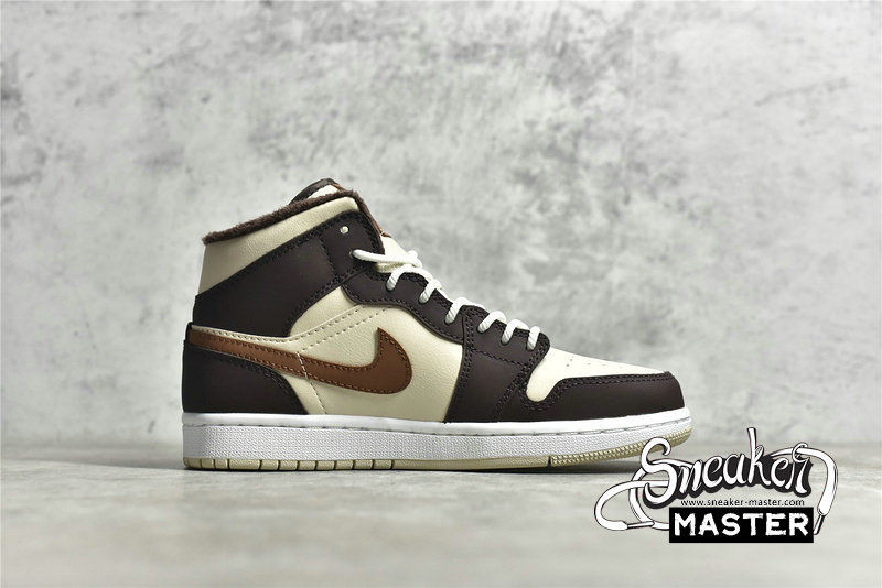 - This offering of the mid-top Air Jordan 1 features Cream tumbled leather upper paired with Dark Chocolate nubuck overlays, Brown leather Swooshes and tongue tags. Additional details includes fur liners, ribbed rope laces atop a White midsole and Cream-colored rubber outsole.