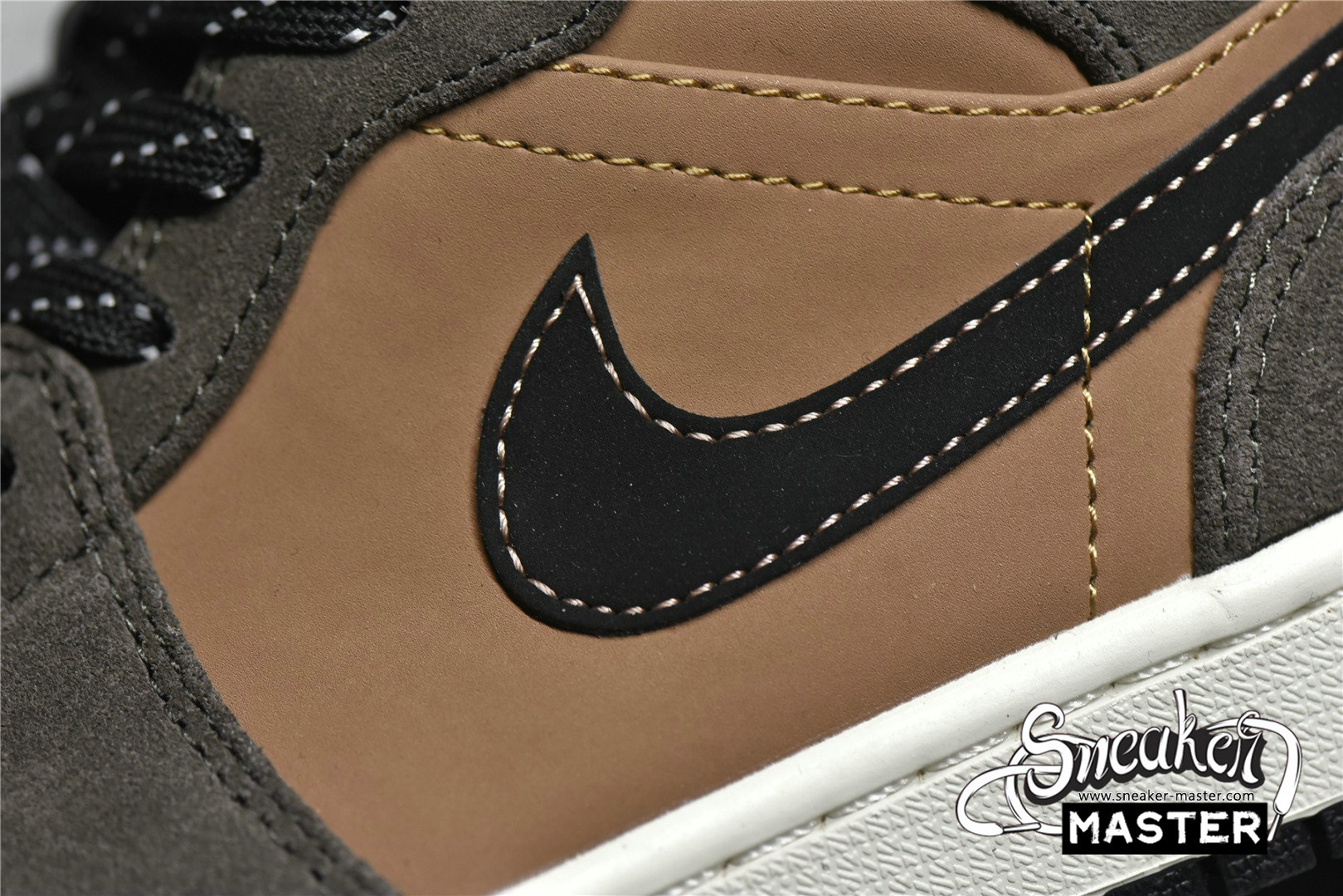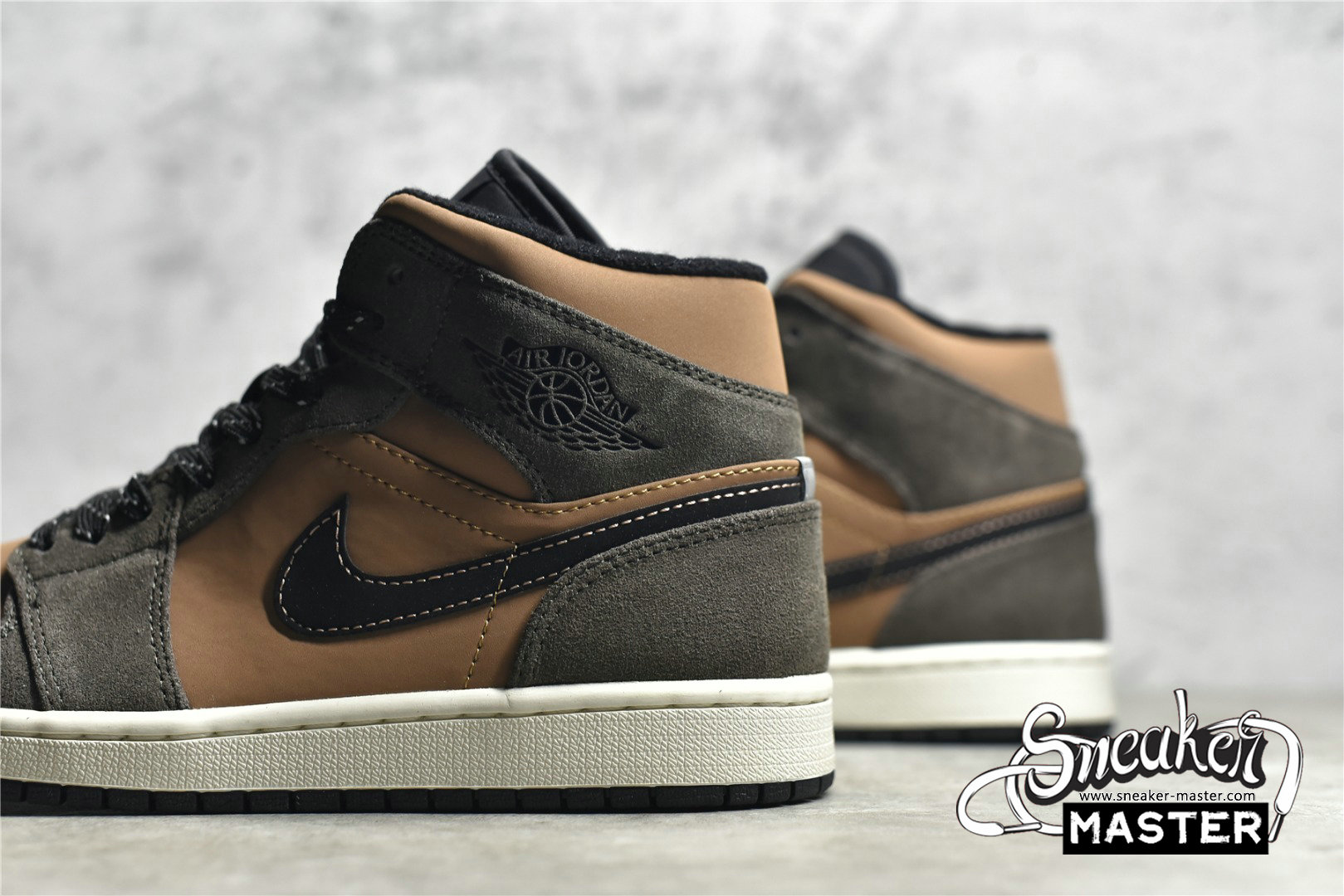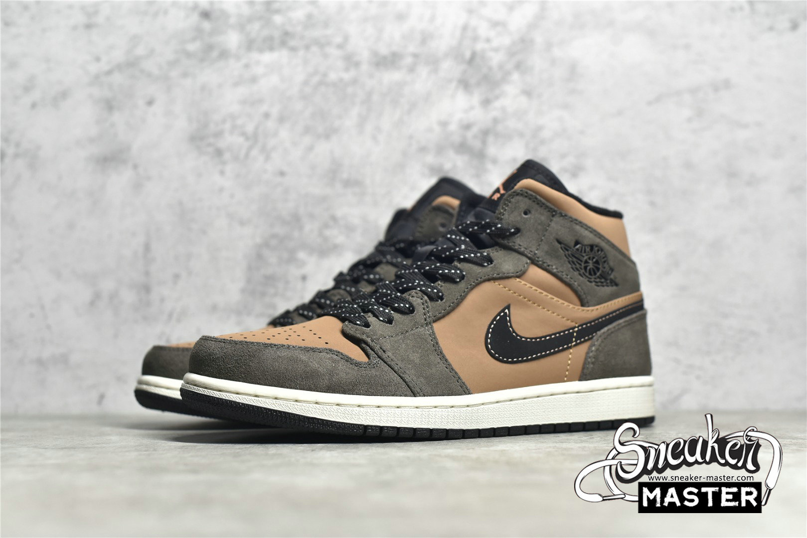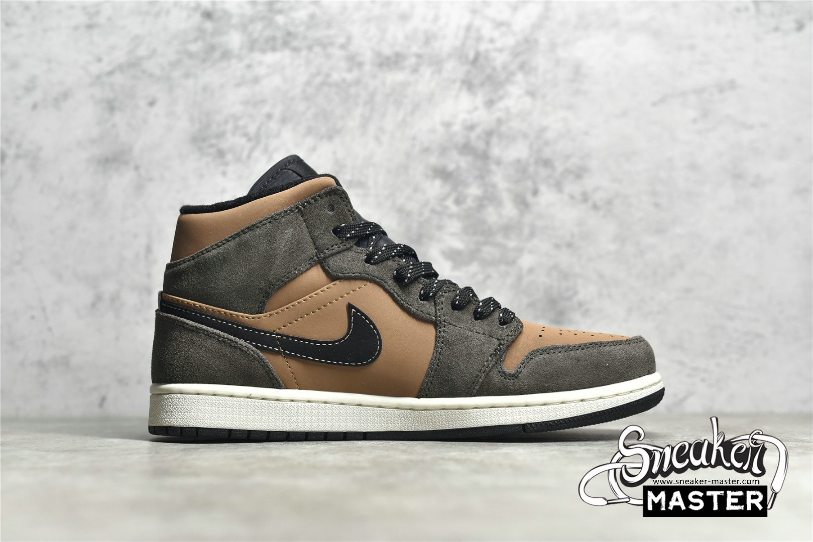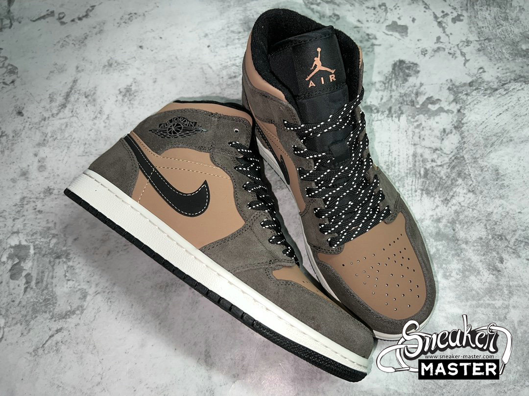 - This mid-top Air Jordan 1 comes replaces its usual leather build for full suede materials. Its entire upper sports a mix of dark and light Brown tones with Black Swooshes, plush sockliner, nylon tongues and matching rubber outsole. Trail-styled speckled laces with 3M reflective detailing in the rear atop a Sail midsole completes the design.