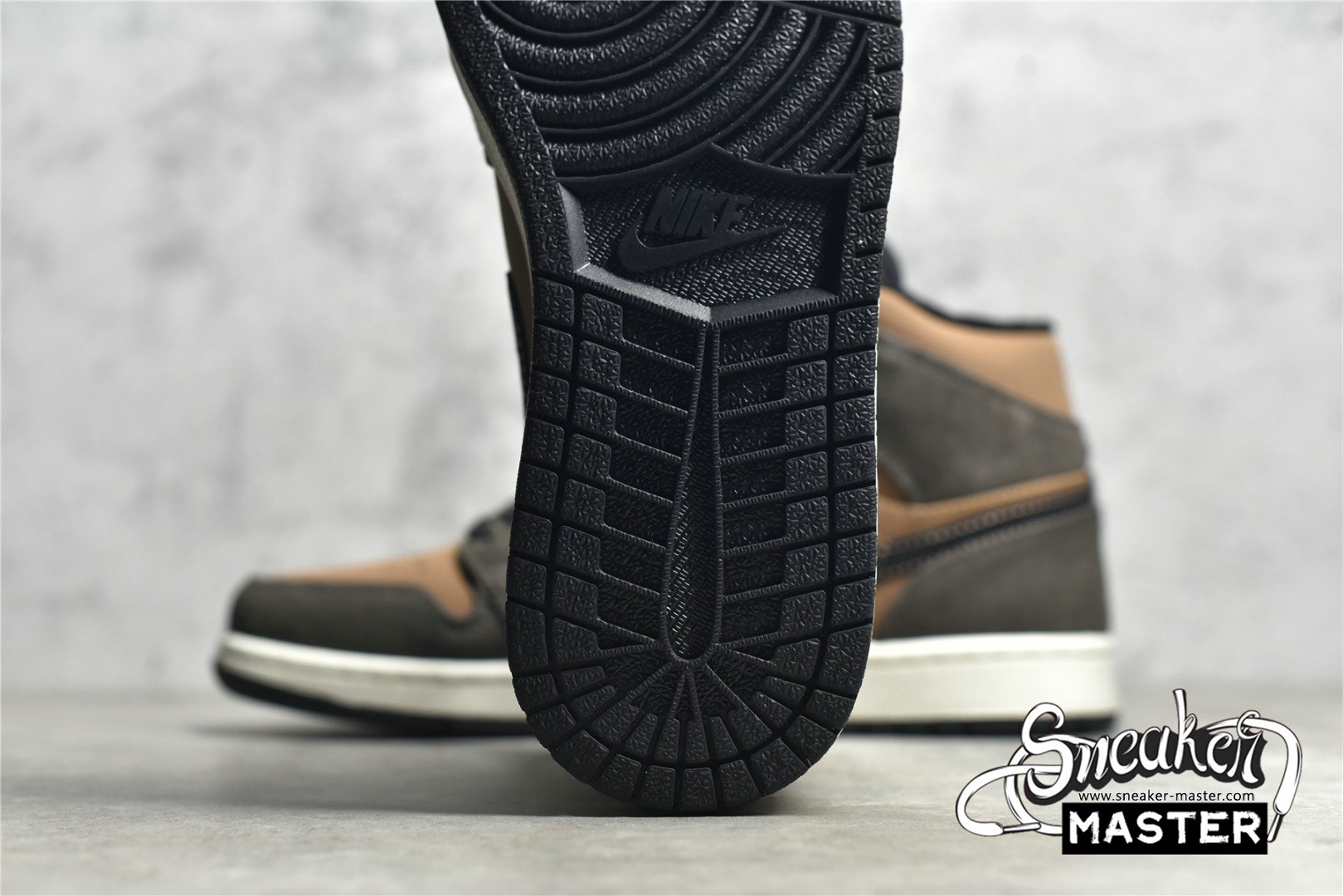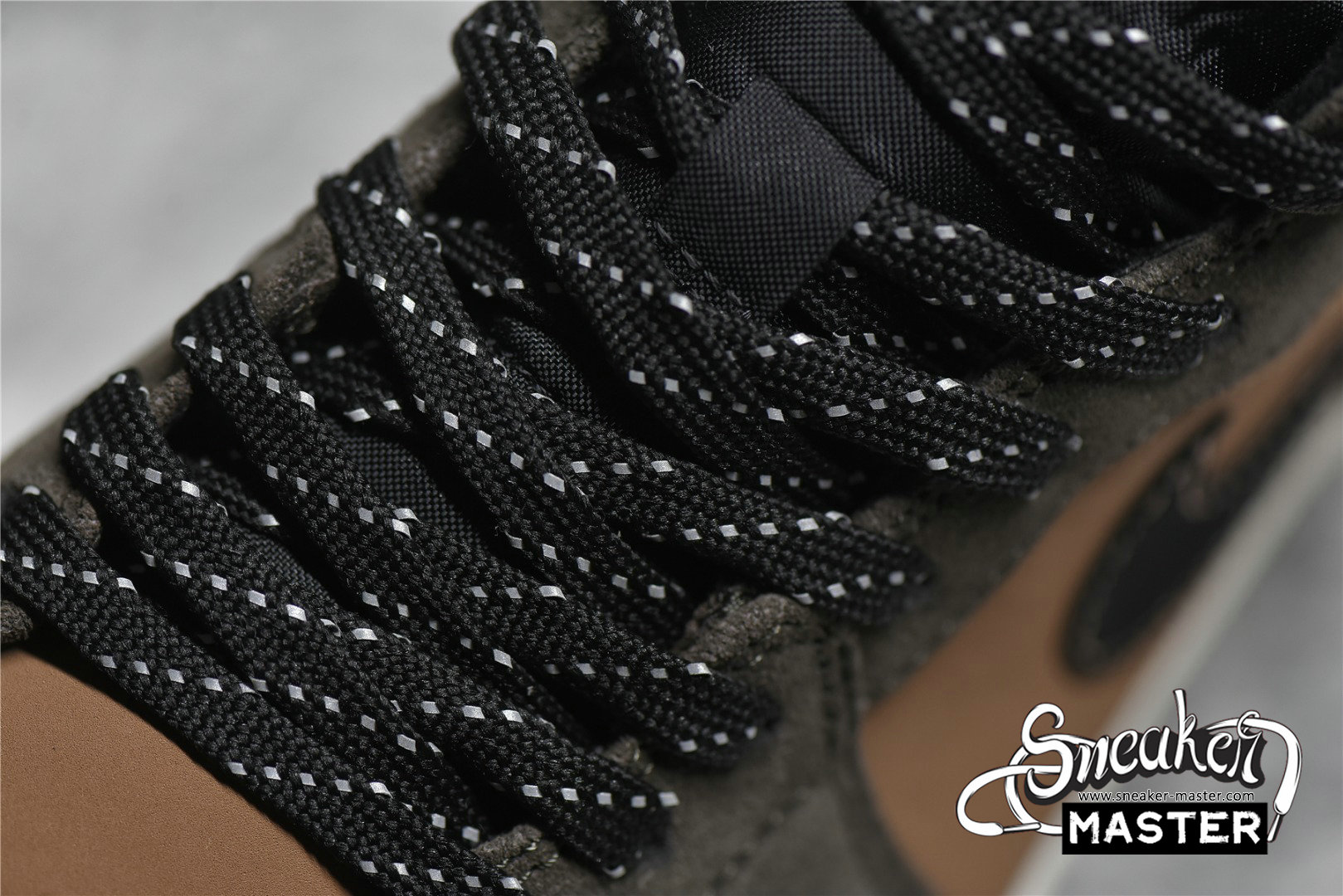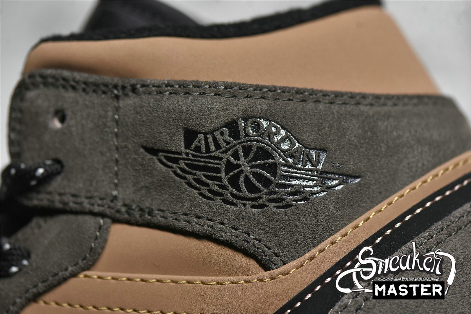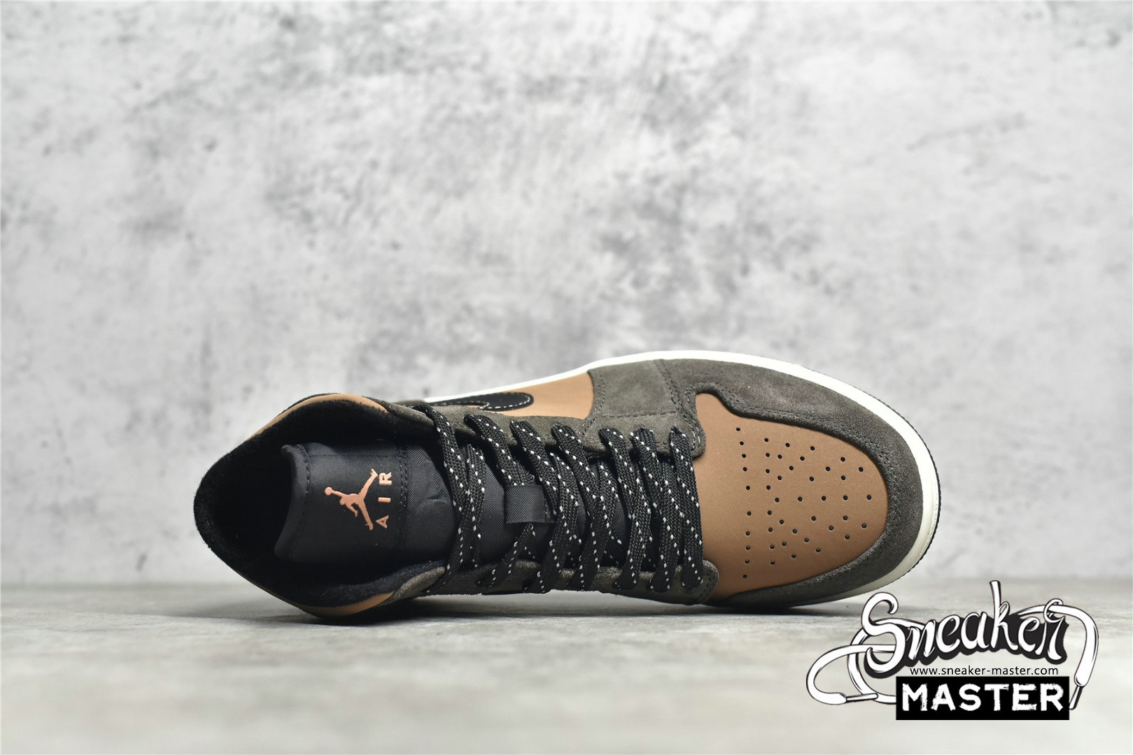 - This mid-top Air Jordan 1 comes replaces its usual leather build for full suede materials. Its entire upper sports a mix of dark and light Brown tones with Black Swooshes, plush sockliner, nylon tongues and matching rubber outsole. Trail-styled speckled laces with 3M reflective detailing in the rear atop a Sail midsole completes the design.