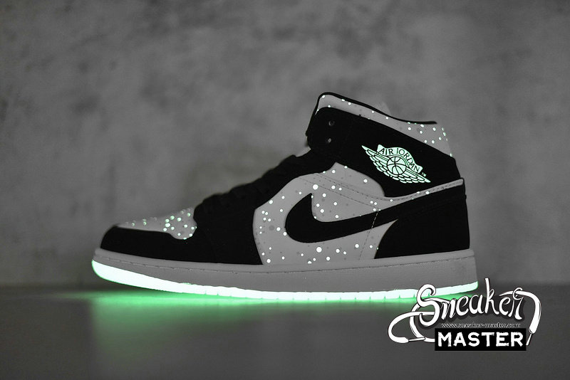 - Unlike the original, this grade school-exclusive comes with a bit of a twist. It features the usual White leather upper with Black nubuck overlays detailed with added Teal Tint on the Wings logo and outsole – which glows in the dark.