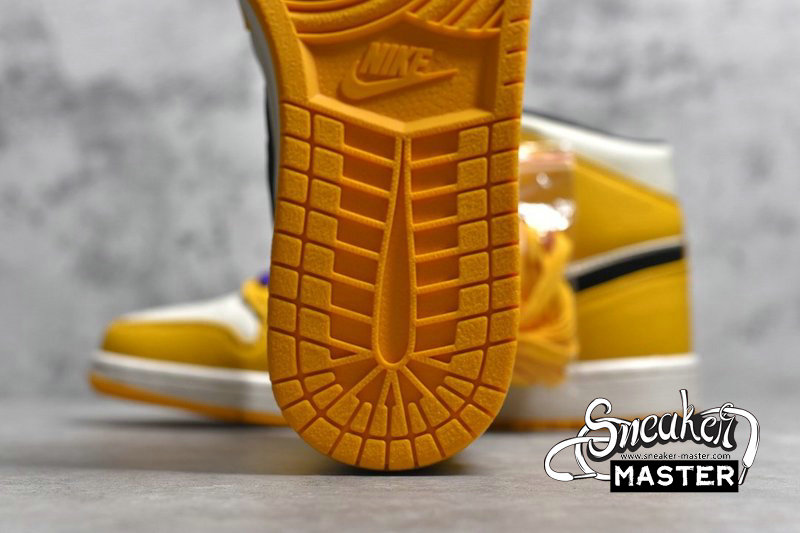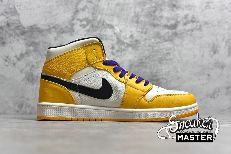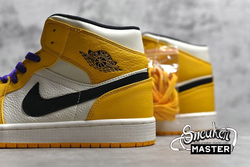 - The Air Jordan 1 Mid 'Lakers' pays tribute to Los Angeles' storied NBA team. The shoe's leather upper features a white base with University Gold tumbled overlays, contrasted by black on the Swoosh and 'Wings' logo. Court Purple laces complete the team look, while underfoot, a white Air midsole provides cushioning. A University Gold concentric outsole provides traction.