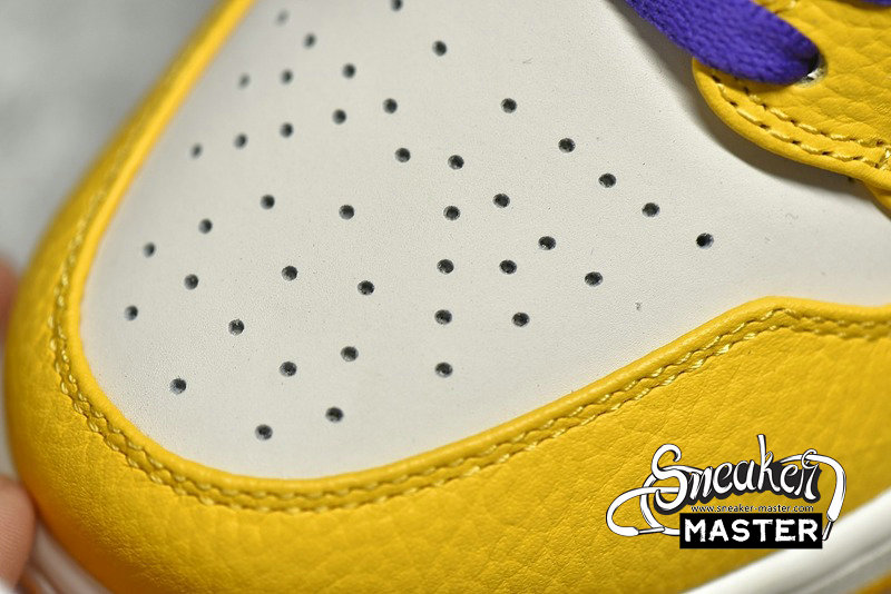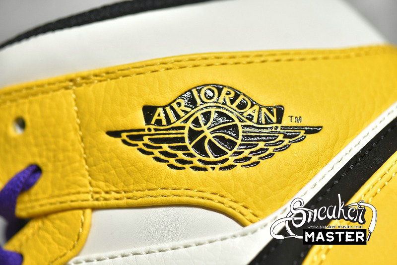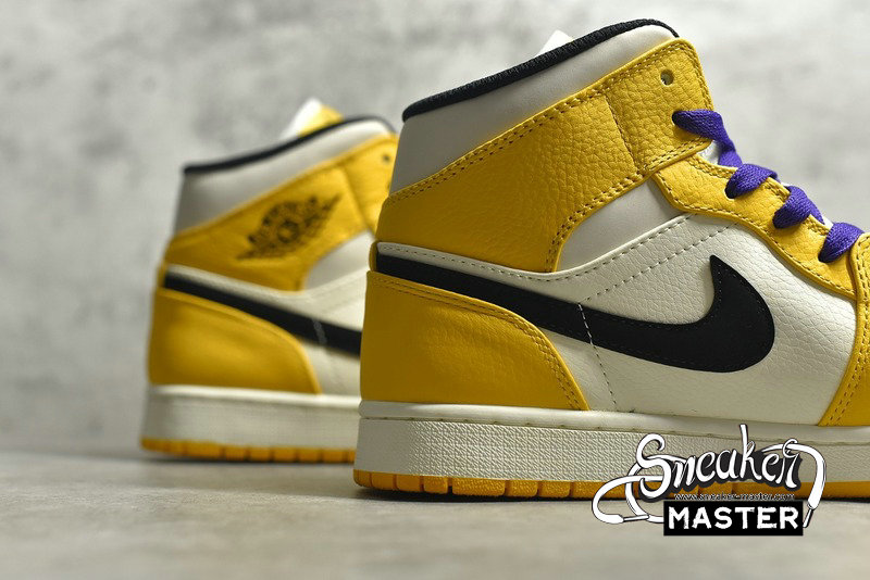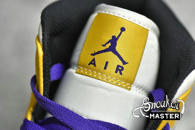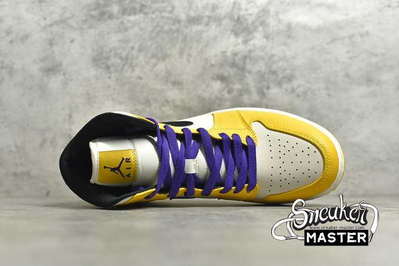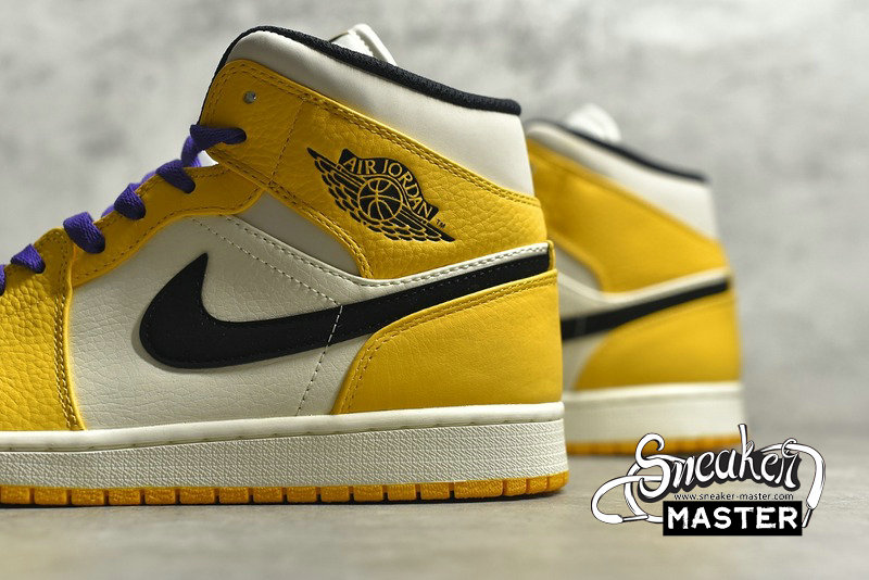 - The Air Jordan 1 Mid 'Lakers' pays tribute to Los Angeles' storied NBA team. The shoe's leather upper features a white base with University Gold tumbled overlays, contrasted by black on the Swoosh and 'Wings' logo. Court Purple laces complete the team look, while underfoot, a white Air midsole provides cushioning. A University Gold concentric outsole provides traction.
