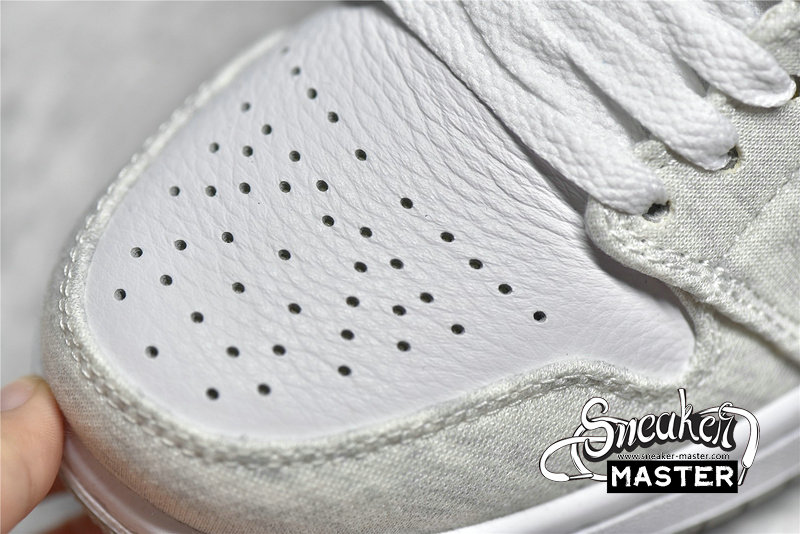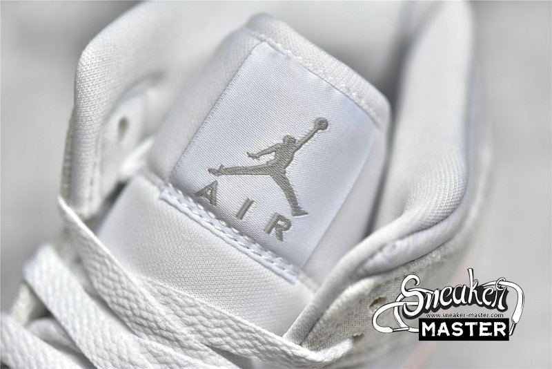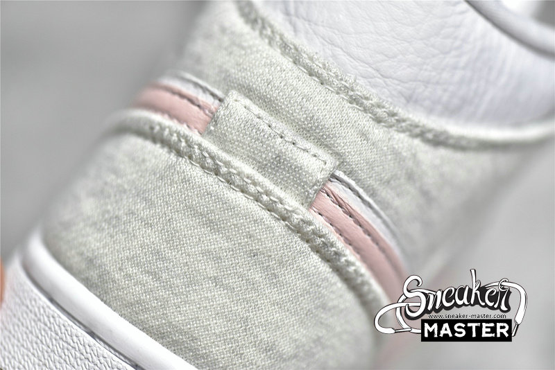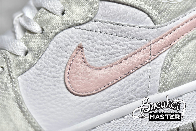 - This mid-top Air Jordan 1 features a leather build with a canvas-like fabric used on the overlays. Pink leather Swooshes atop a White midsole and Iron Ore rubber outsole completes the design.