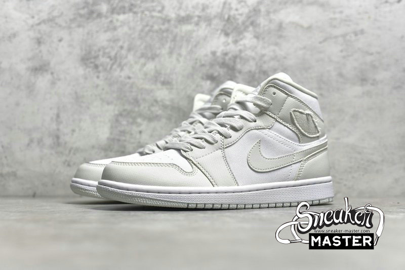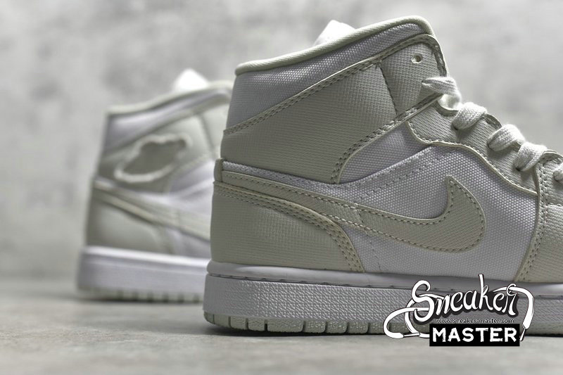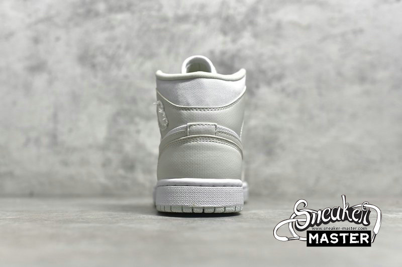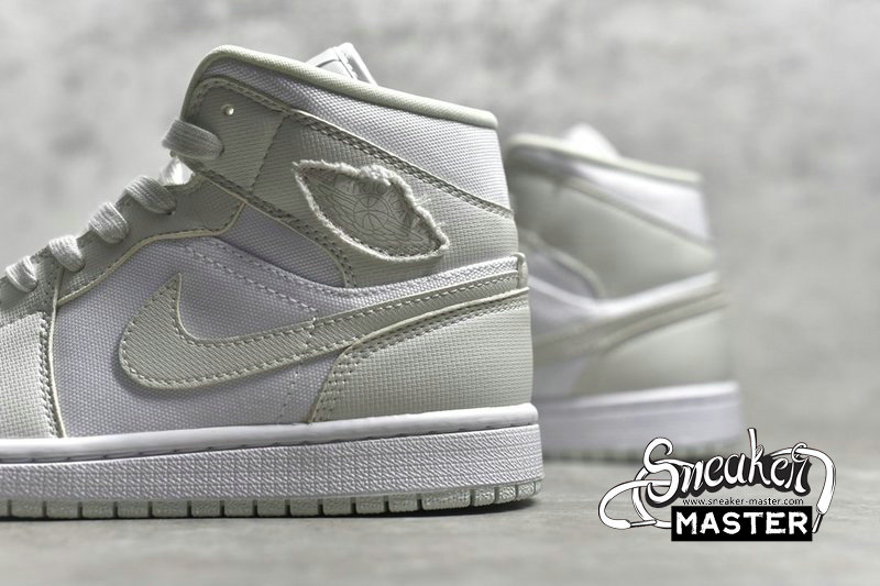 - This offering of the mid-top Air Jordan 1 comes constructed in a canvas upper with nylon tongues and a frayed Wings patch. It sports a White base with Spruce Aura overlays that expand onto the midsole and rubber outsole, respectively.