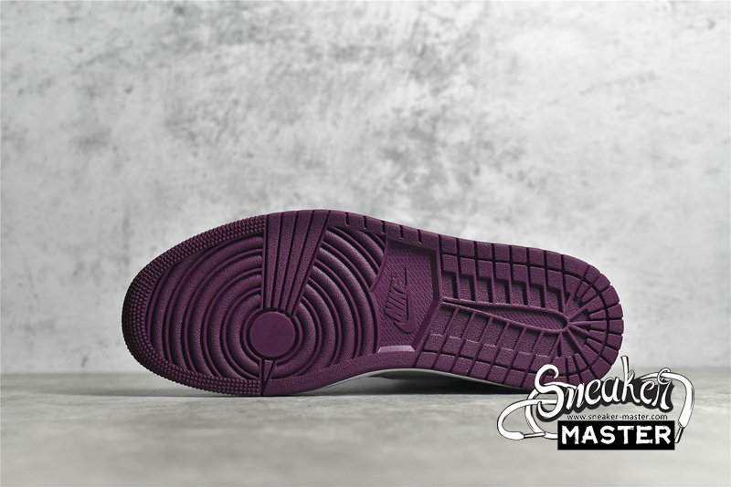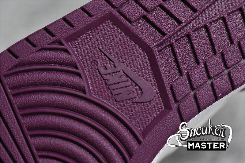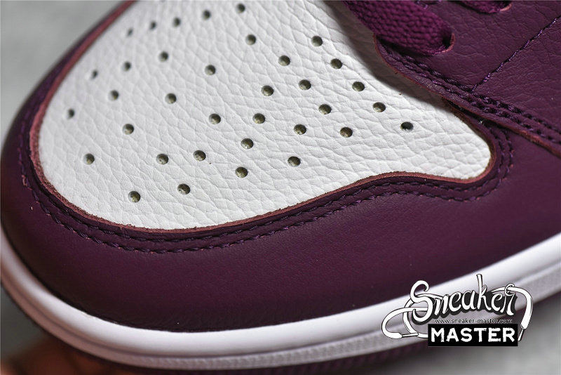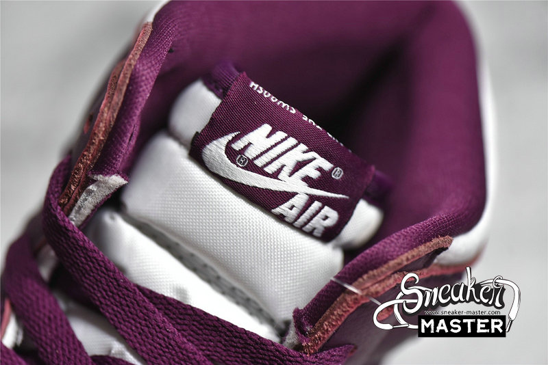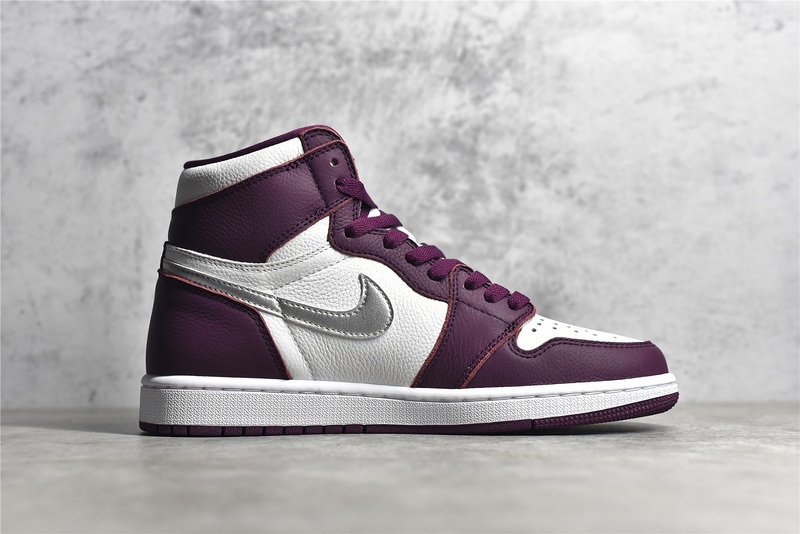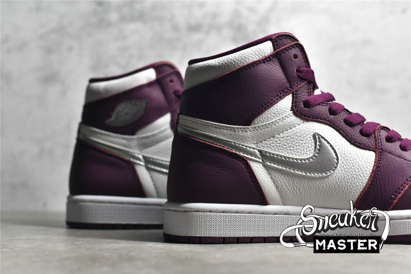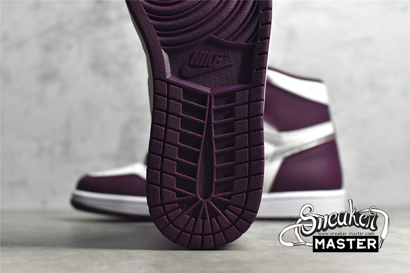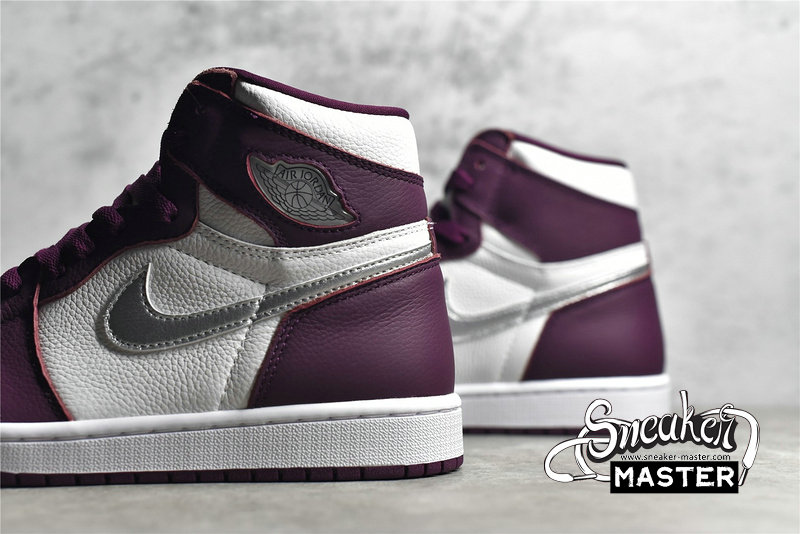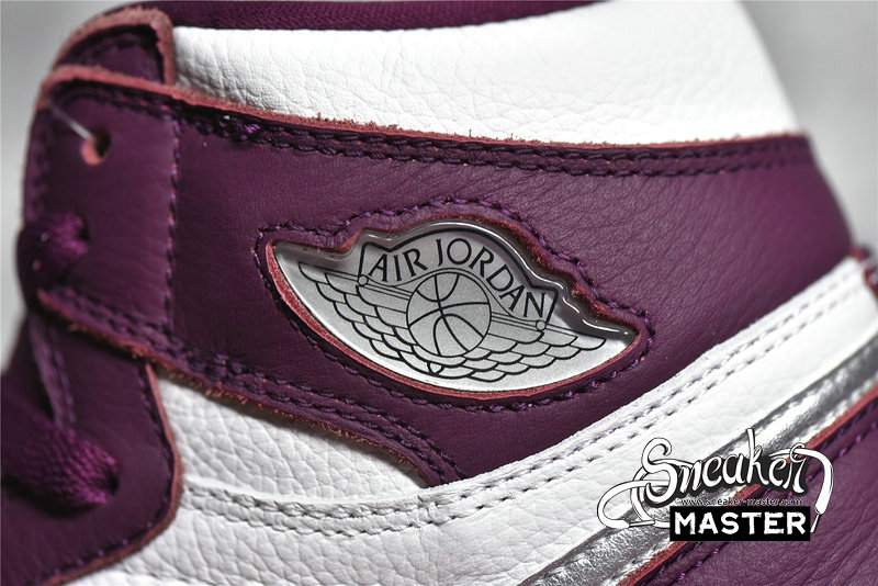 - The Air Jordan 1 Retro High OG 'Bordeaux' emerges with a rich colorway. The shoe's leather upper appears with a white base, overlaid by Bordeaux leather throughout. The Swoosh branding and jewel 'Wings' logo add metallic silver to the look, with a lightly padded nylon tongue supporting the fit. Underfoot, Air in the heel of the midsole offers cushioning, giving way to a concentric rubber outsole for traction.