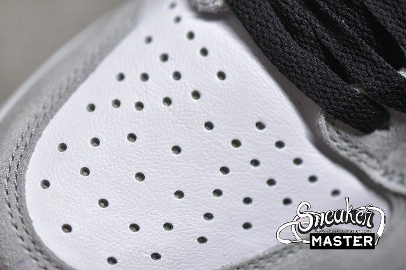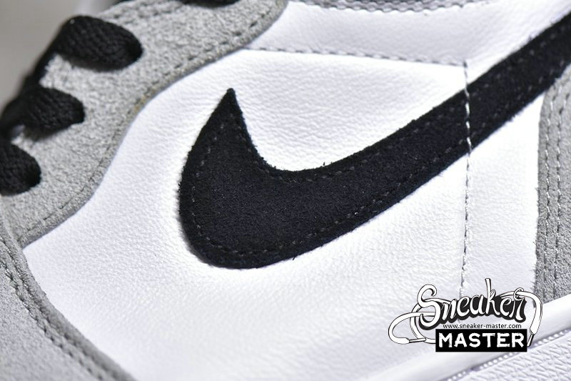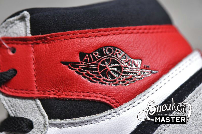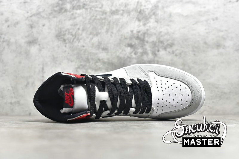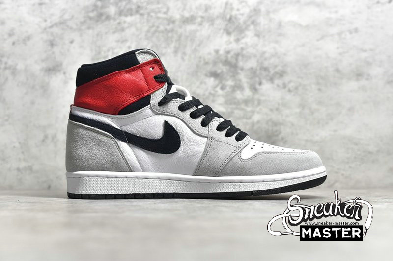- The Air Jordan 1 Retro High OG 'Light Smoke Grey' emerges with a neutral look and a vibrant accent. The shoe's upper features a white leather base overlaid by Light Smoke Grey suede, with black contrast on the Swoosh, collar, laces and tongue tag. The collar flap highlights the look in Varsity Red, matched by the tongue branding, while an Air midsole and concentric outsole support the fit underfoot.