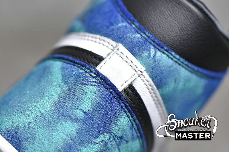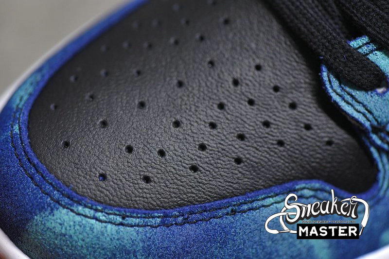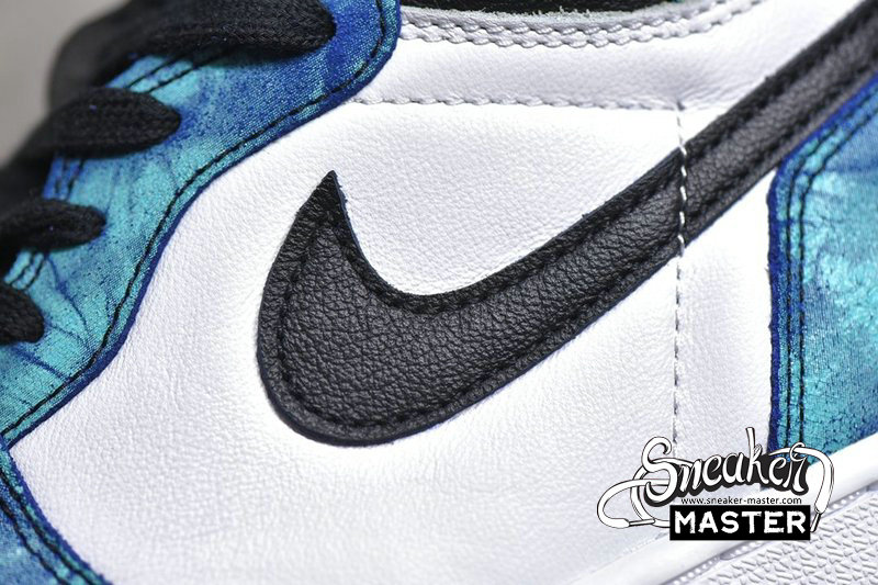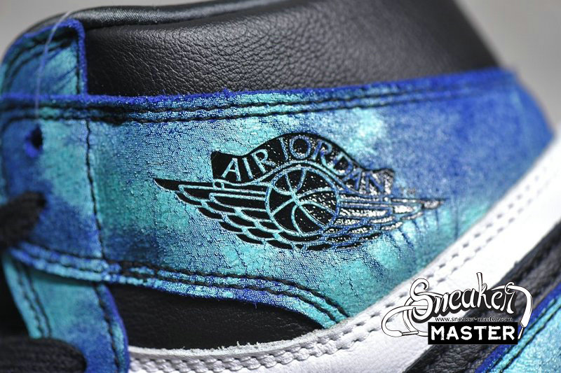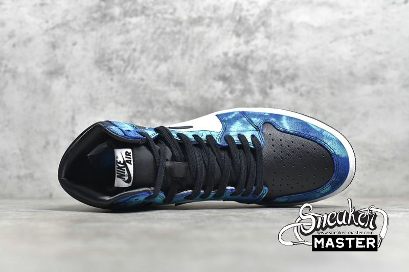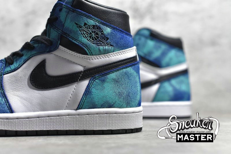 - This Air Jordan 1 features White leather on the sides with Black leather covering the toe, Swoosh logos, and ankle collar. Highlighting the shoe are tie-dye overlays completed with a White midsole and Black rubber outsole.