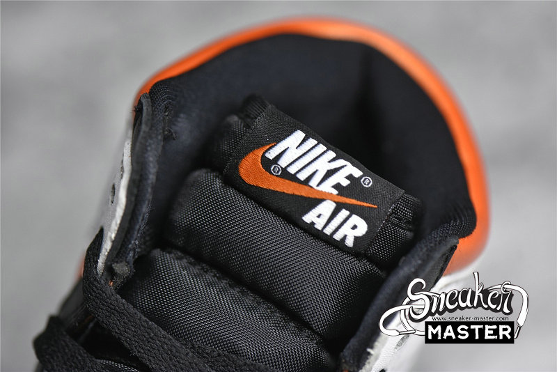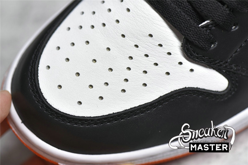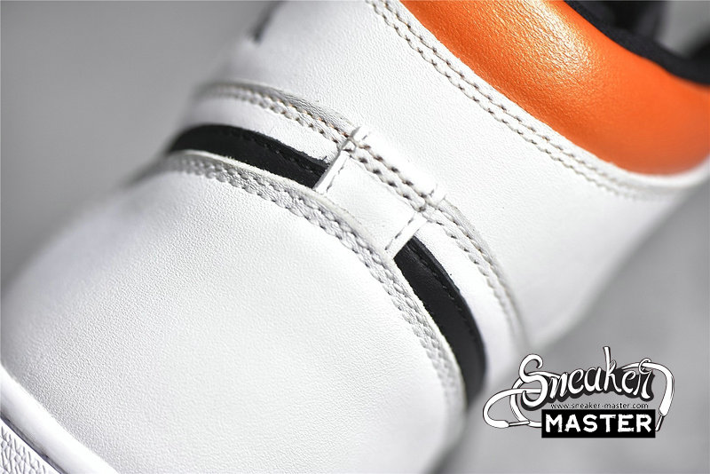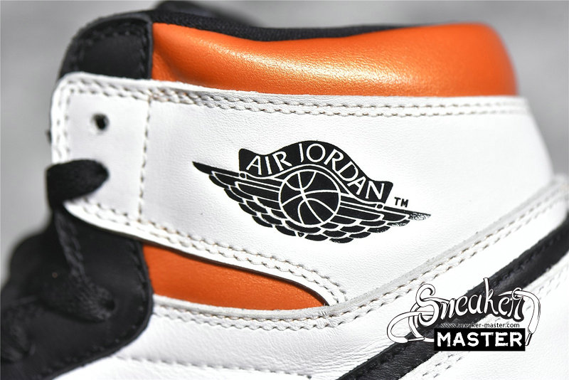 - This Air Jordan 1 features a White leather base with Black overlays at the at the forefoot, eyelets, and Swoosh. A Orange accents are applied on the collars, tongues, insole, and rubber outsole to complete the design.