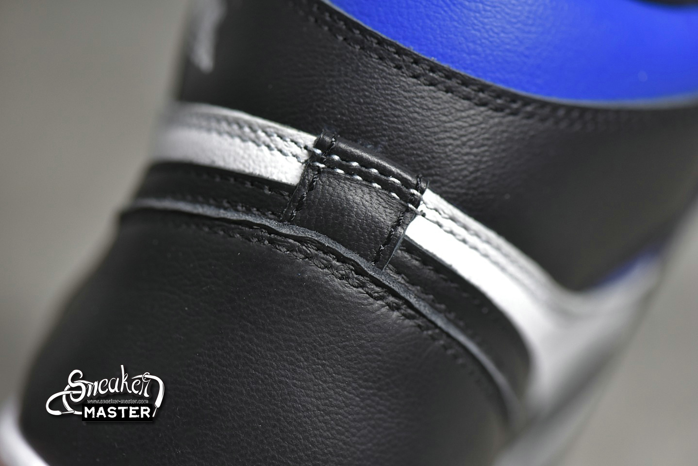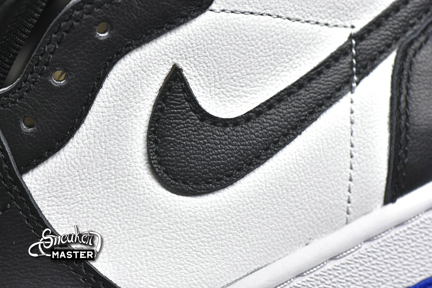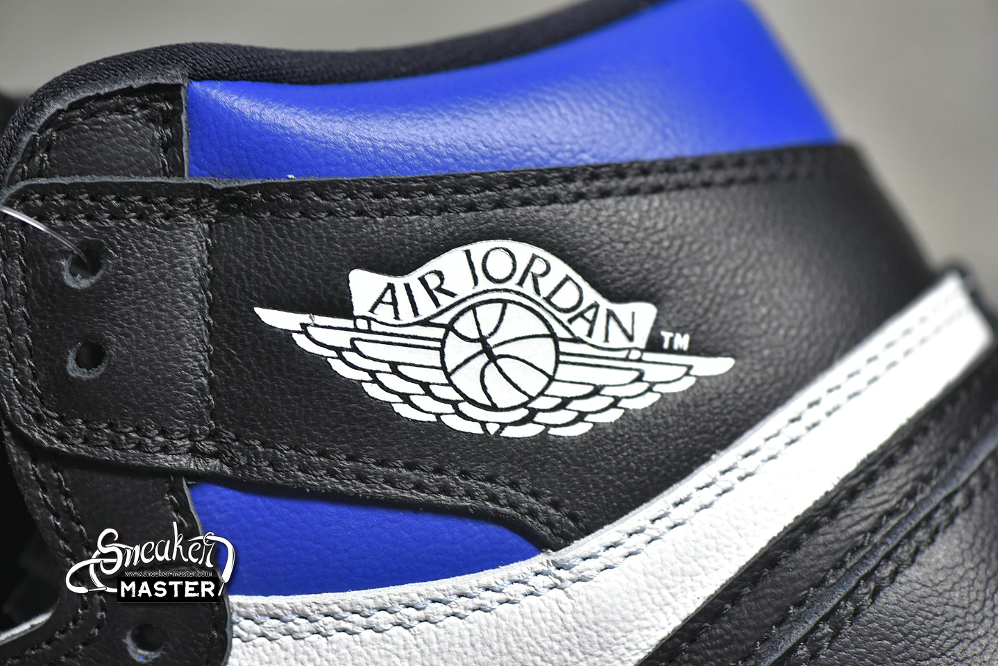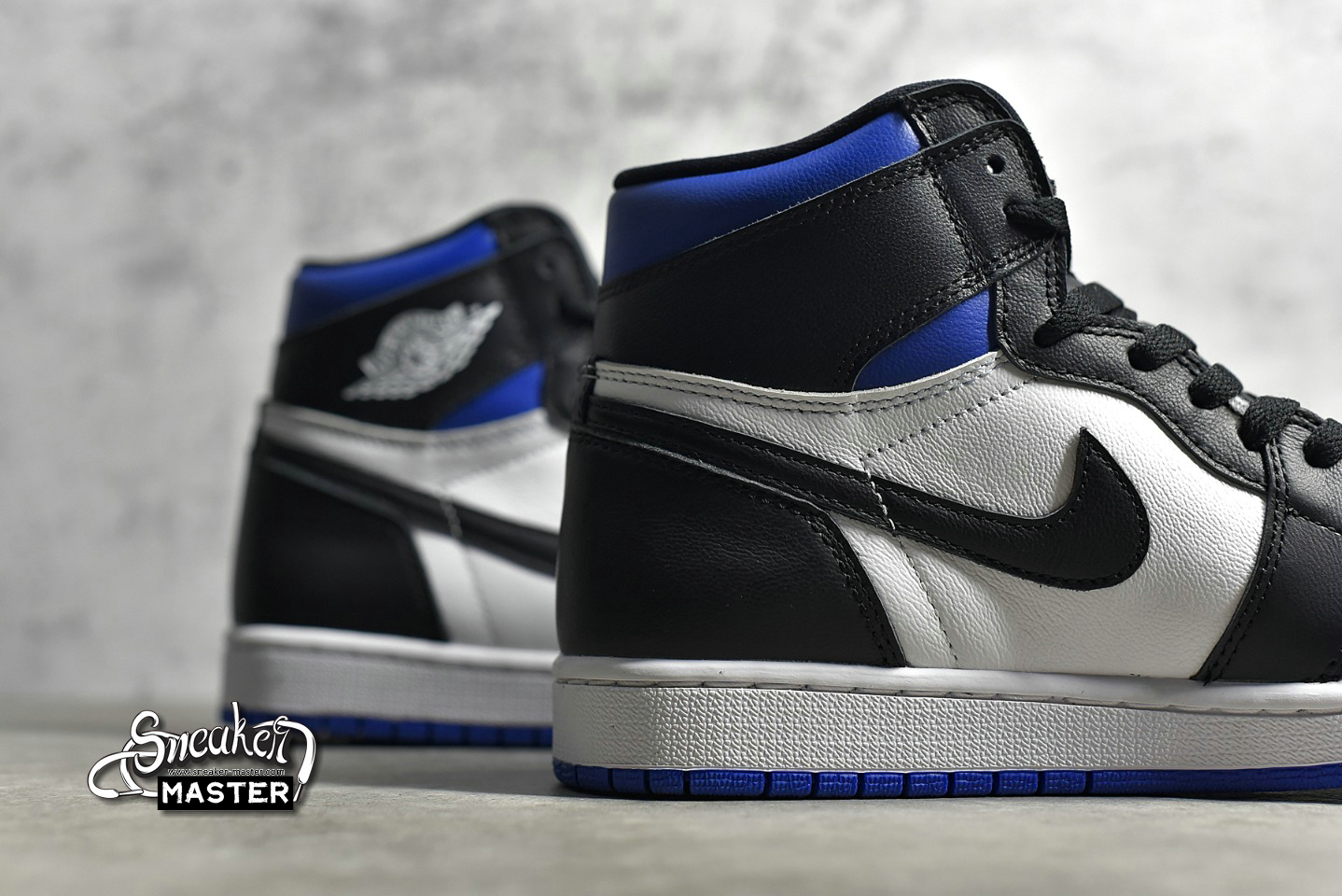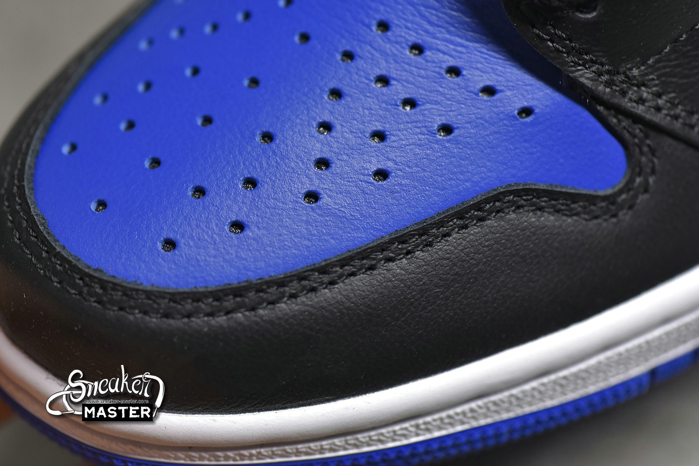 - The Air Jordan 1 Retro High OG 'Royal Toe' updates a classic colorway. Built with leather, the upper appears in white with black overlays, highlighted by hits of Game Royal on the collar and toe box. A lightly padded nylon tongue supports the fit, while underfoot, a white Air midsole gives way to more Game Royal on the circular outsole.