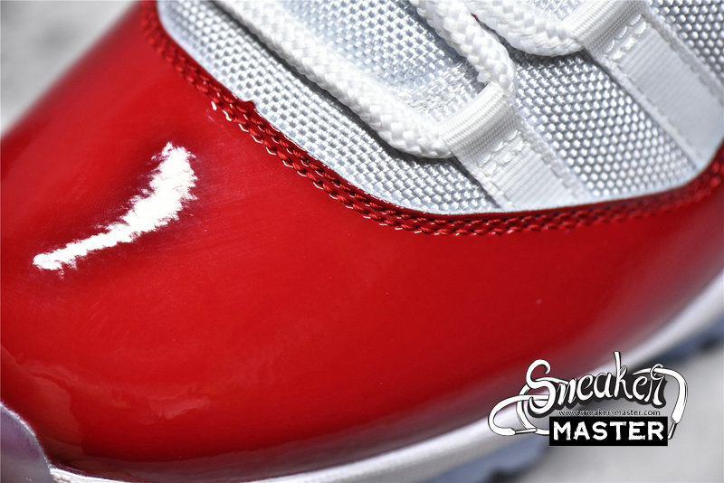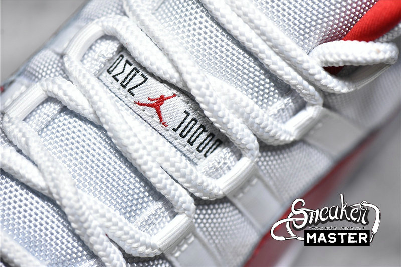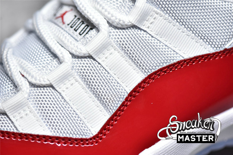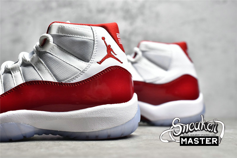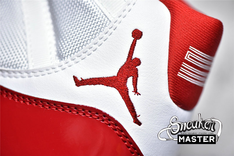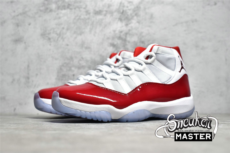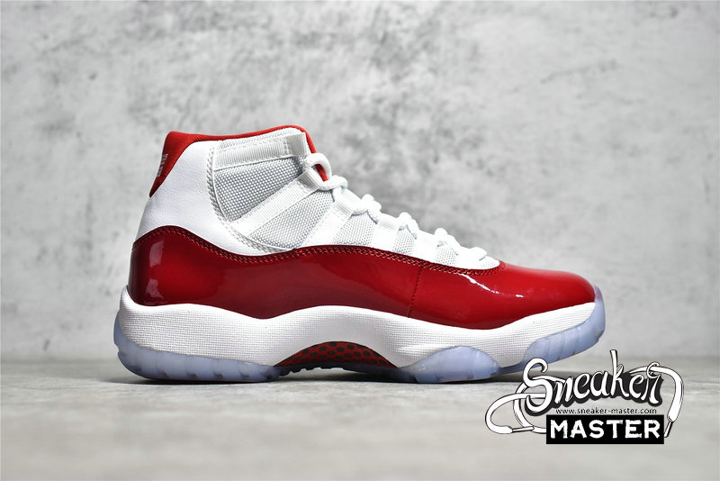 - Reminiscent of the “Cherry” Air Jordan 11 Low, this offering of the Air Jordan 11 features a White mesh base with leather heels and Varsity Red accents on the branded areas, lining as well as its shiny high-cut patent leather overlay. A White midsole atop a translucent outsole completes the design.
