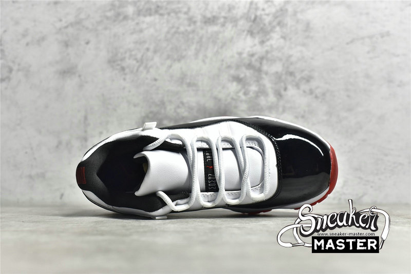 - A hybrid look, the Air Jordan 11 Retro Low 'Concord-Bred' combines elements of both of its namesake colorways. The 'Concord' influence becomes apparent on the shoe's white leather upper, which is overlaid by a black patent leather overlay. Underfoot, the tooling draws from the 'Bred' by combining a white Air midsole and a University Red rubber outsole.