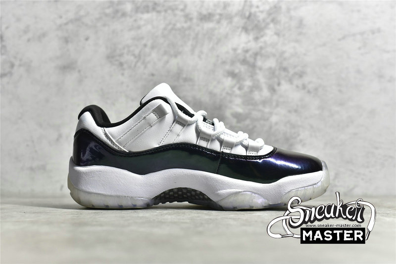 - The ‘Emerald’ edition of the Air Jordan 11 Retro Low sports a white premium leather upper with matching lace loops, and is accented by the silhouette’s defining patent leather rand in an iridescent green. Completing the look is an icy rubber outsole.