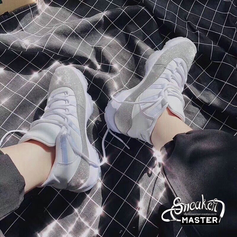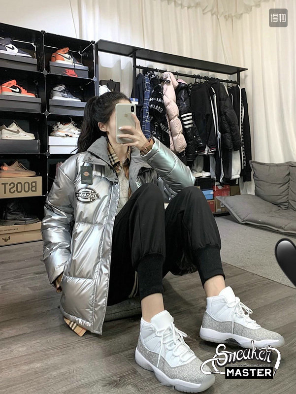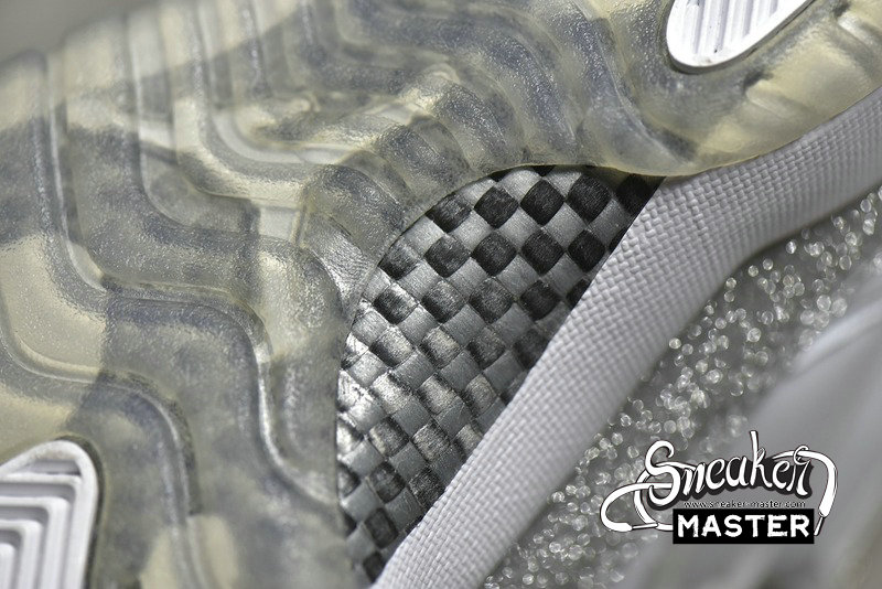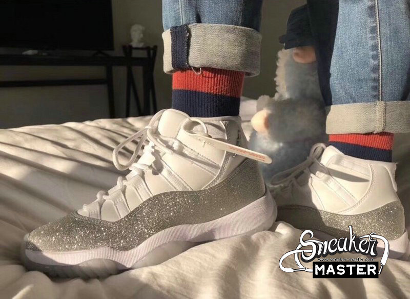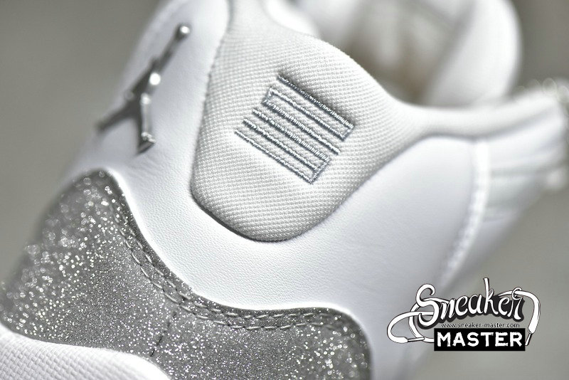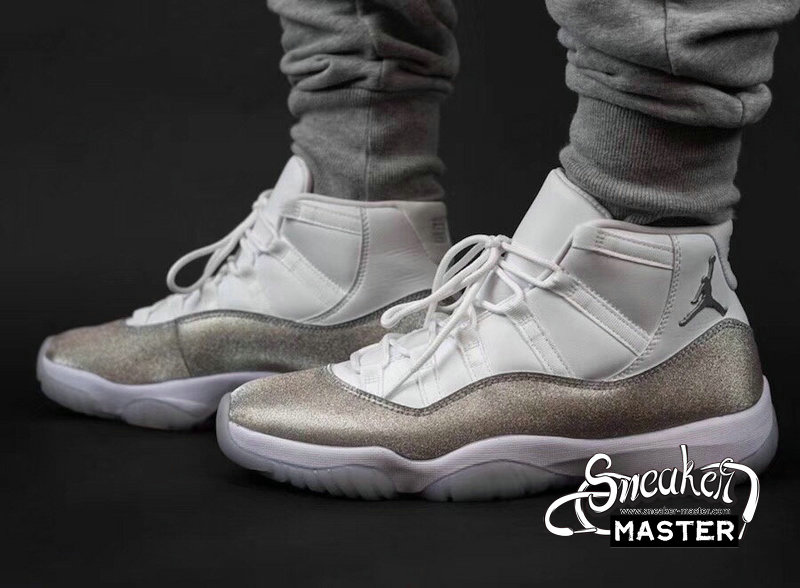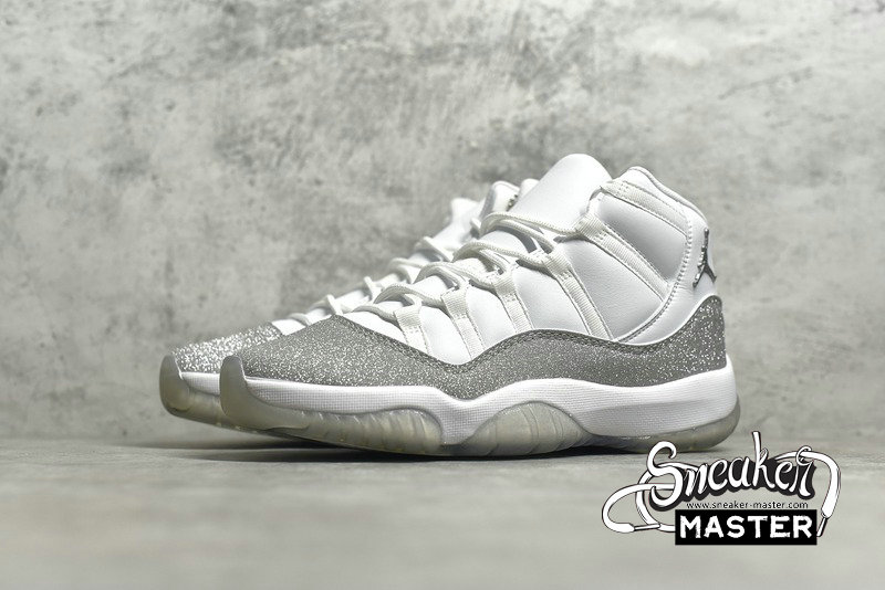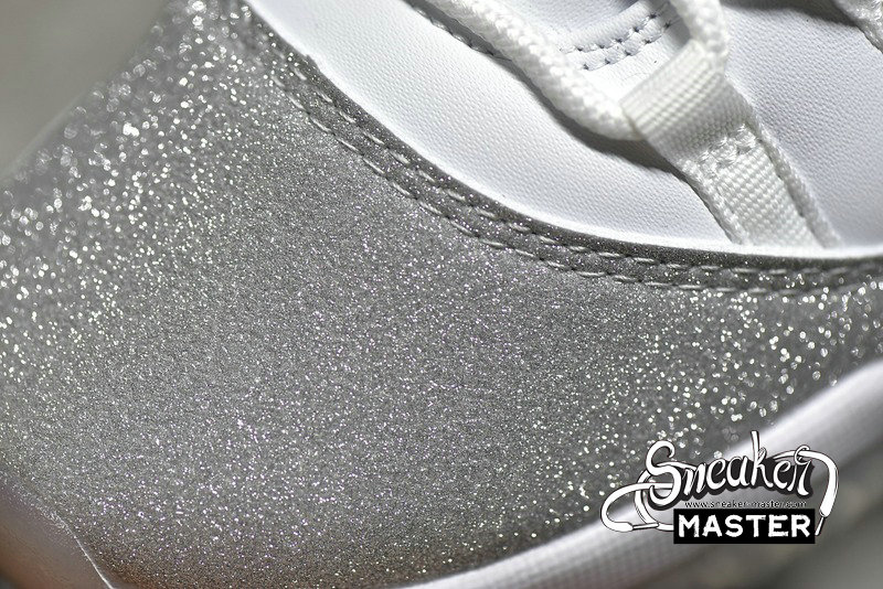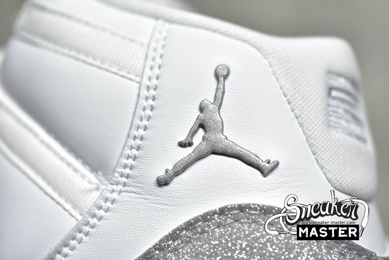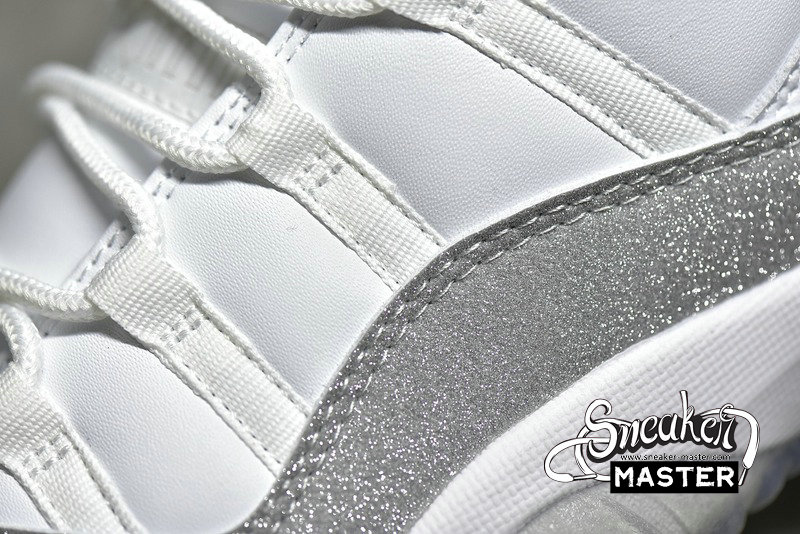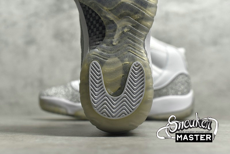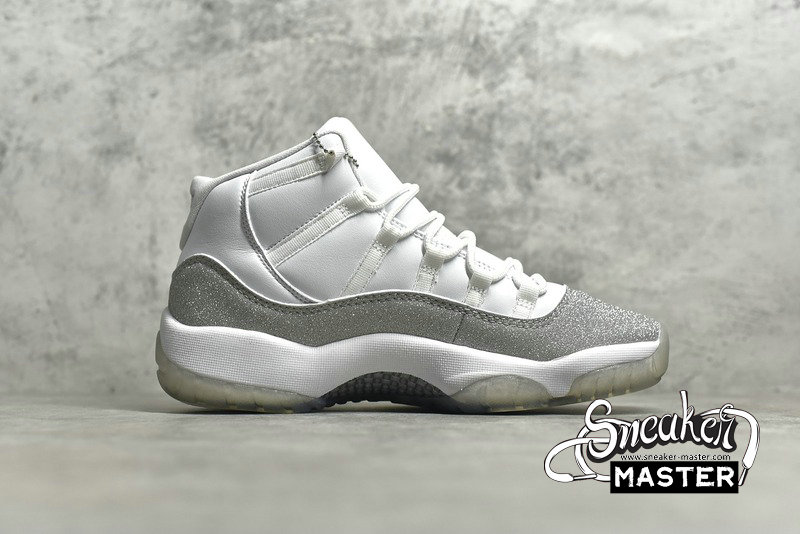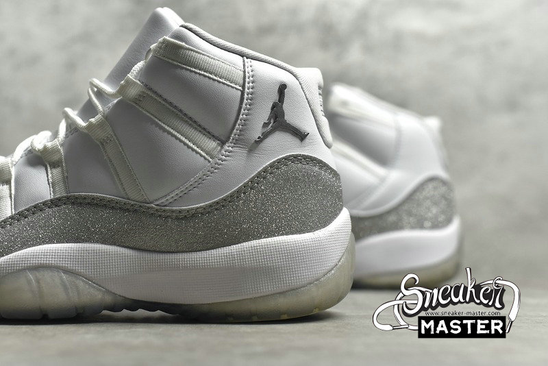 - The Air Jordan 11 Retro 'Vast Grey' swaps out the silhouette’s traditional patent leather overlay in favor of a glittery metallic silver finish. The rest of the upper is constructed from white leather, complete with matching white nylon lace loops and a metallic silver Jumpman on the lateral collar. A translucent rubber outsole delivers grippy traction underfoot.