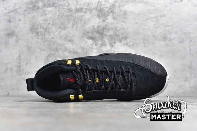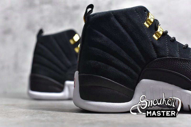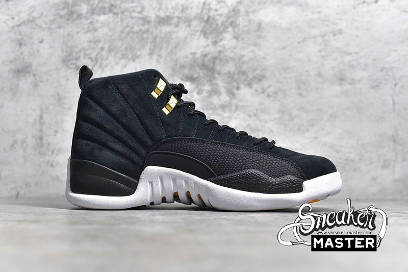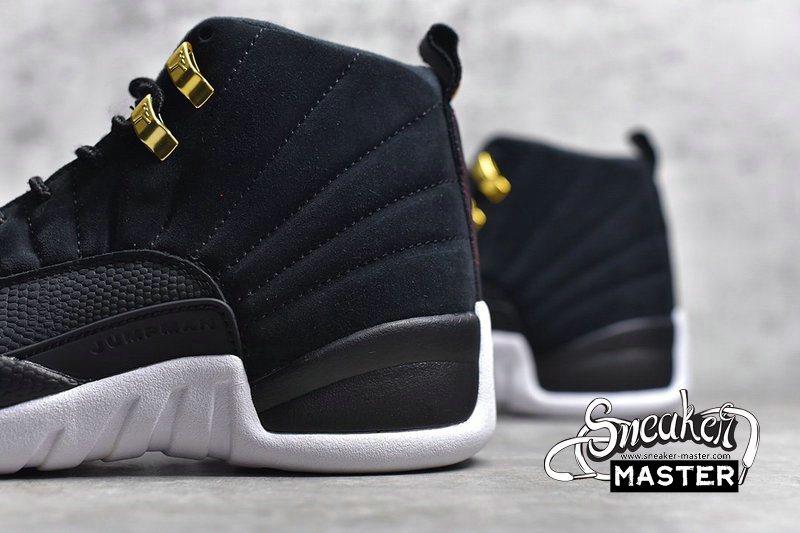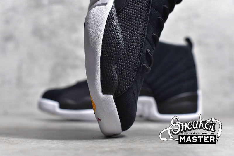- The Air Jordan 12 Retro 'Reverse Taxi' offers a design twist on the silhouette’s OG white and black colorway. The retro mid-top features stitched black suede on the upper, accented with metallic gold eyelets and a red embroidered Jumpman on the tongue. Matching black textured overlays give way to a contrasting white outsole, embellished with a red ‘23’ on the heel.