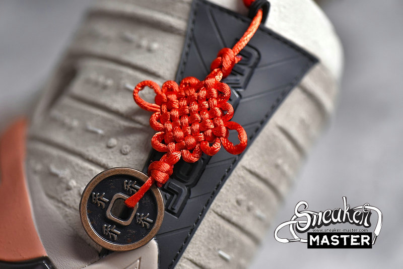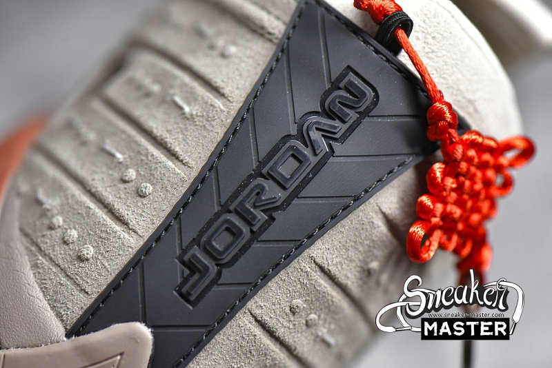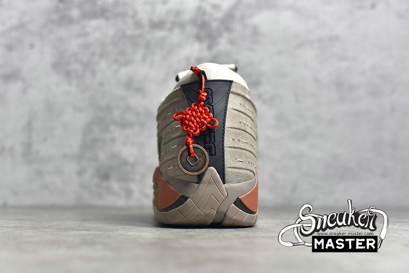 - The CLOT x Air Jordan 14 Retro 'Terracotta' released as part of a collaboration with Edison Chen's streetwear brand. A follow-up to a 2018 Air Jordan 13 Low, the shoe features a tan suede construction on the upper, highlighted by embossed detailing modeled after protective armor—drawn from the Terracotta Army. The tongues include mismatched co-branding, while the heel includes a red Chinese knot worked through a coin that sports a Chinese idiom for prosperity and happiness.