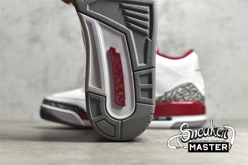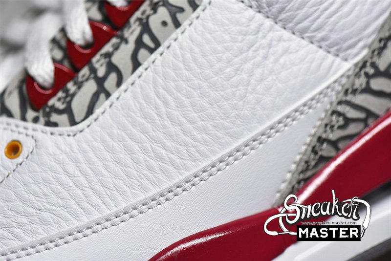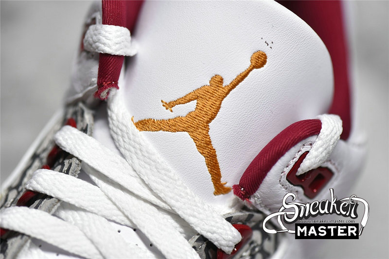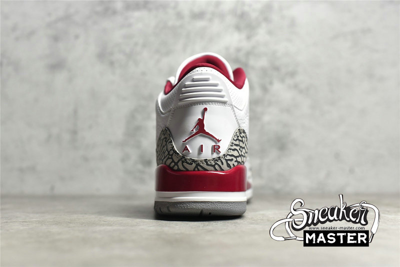 - The Air Jordan 3 Retro 'Cardinal Red' features a palette inspired by an iconic colorway of the Air Jordan 7. The sneaker pairs a white tumbled leather upper with Cardinal Red accents on the collar lining, molded eyelets and raised Jumpman branding at the heel. A Jumpman logo embroidered in orange appears on the tongue, with signature elephant print overlays positioned on the forefoot and heel. A two-tone polyurethane midsole with visible Air arrives underfoot.