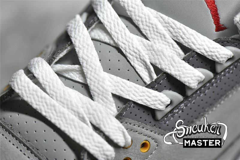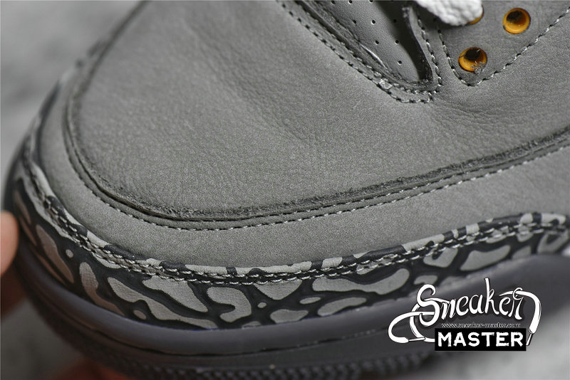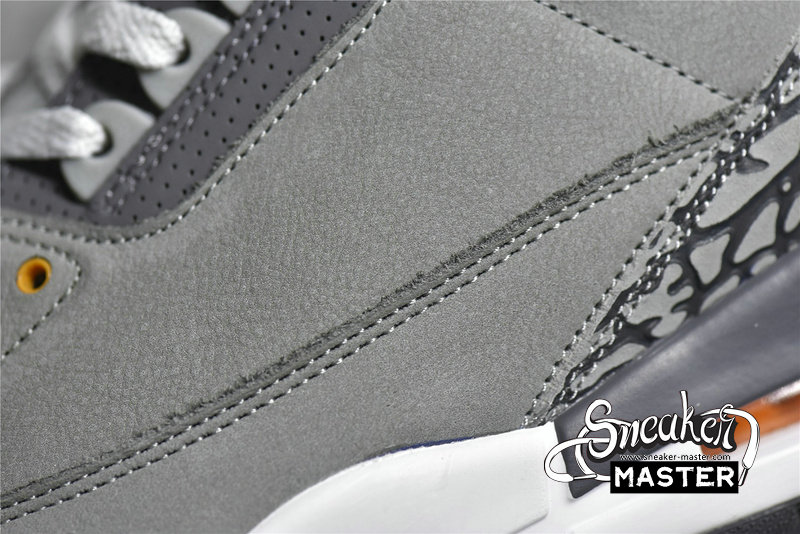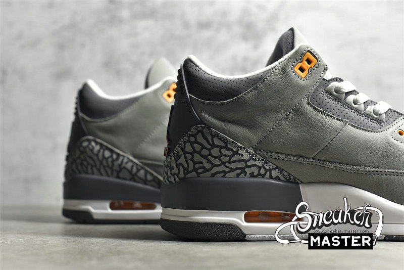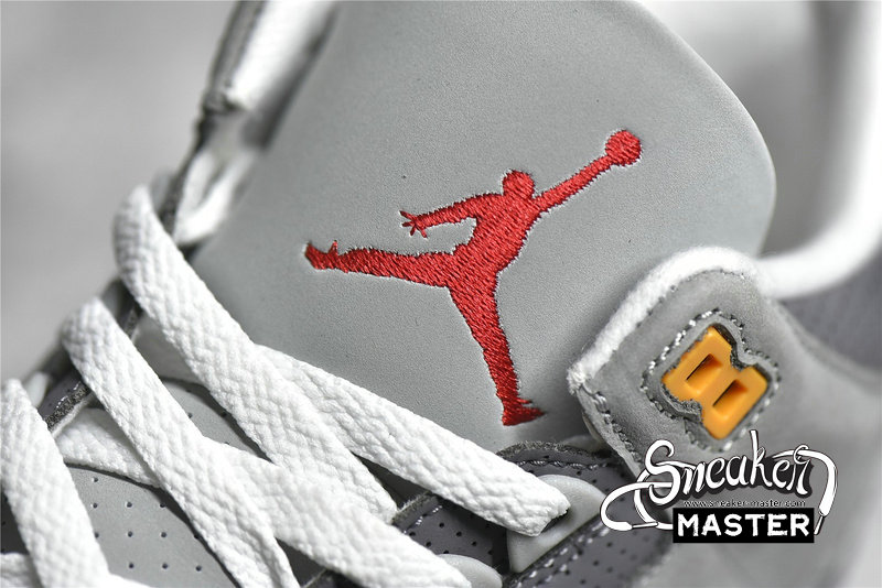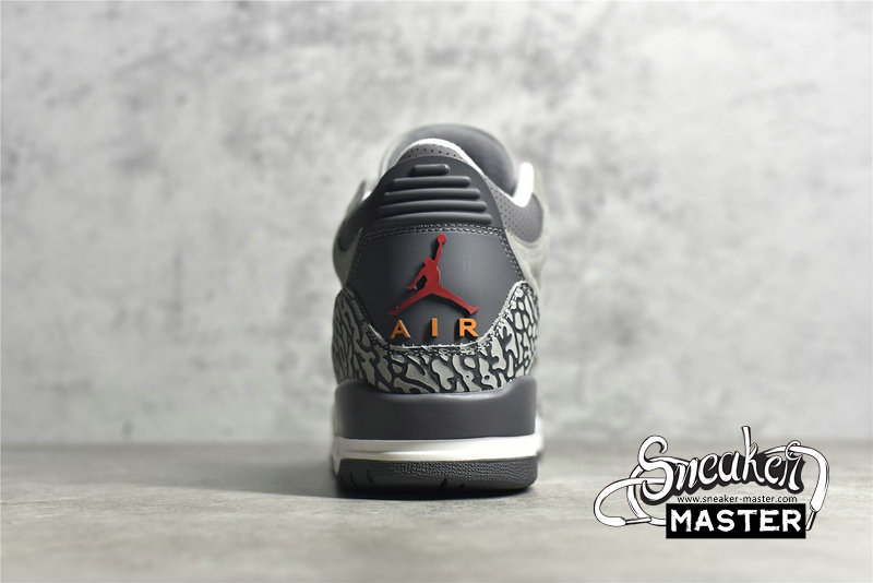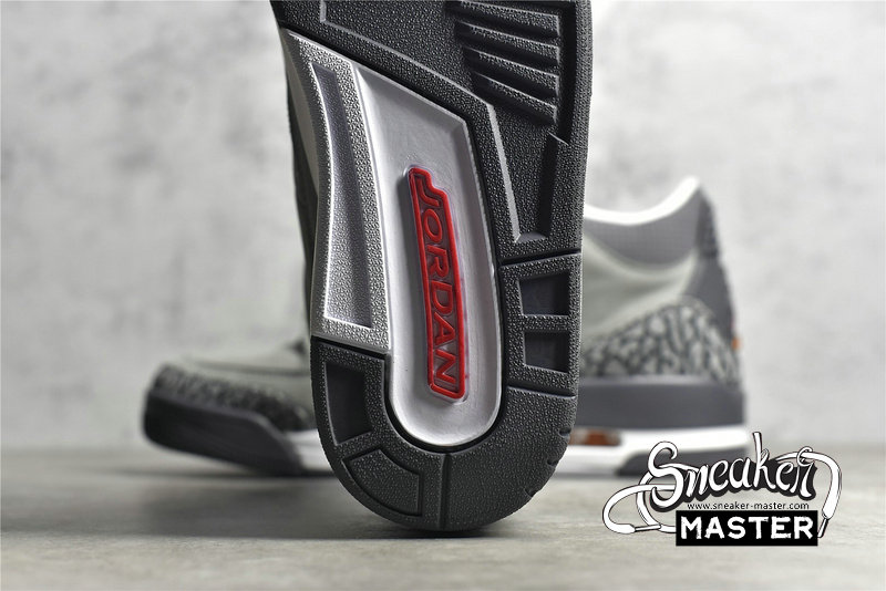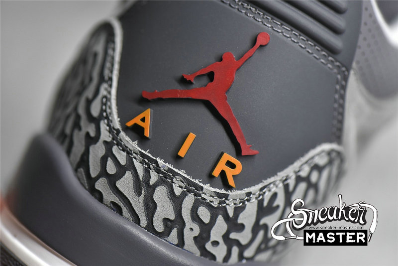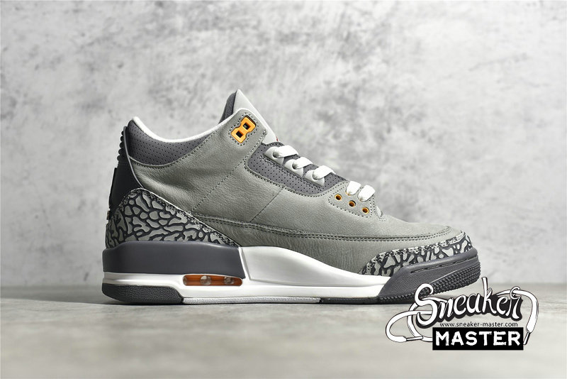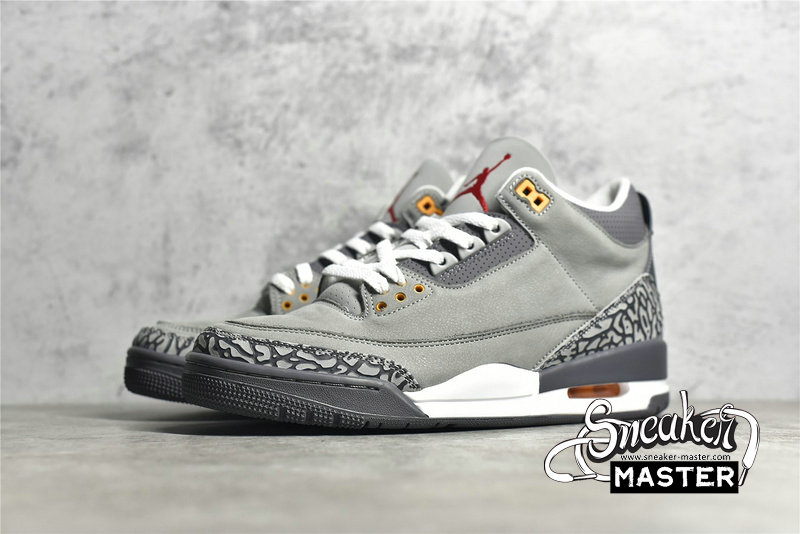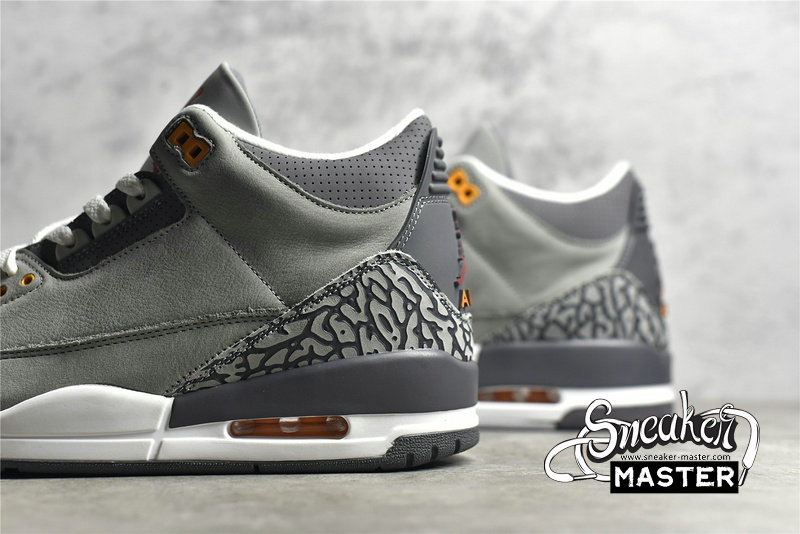 - Air Jordans 3 Cool Grey showcases a sleeking pair of leather sneakers with iconic print overlays. These sneakers feature a clean upper with detailed embroidered. Grey-cement overlays are added in the forefoot and heel side panels to upgrade the shoes look on your feet. Bring you extra appeal is the iconic Jumpman on tongue tab in a red tone. Moreover, eye-catching neon orange eyelets are added to the style. Jordans 3 Cool Grey is completed with visible Air sole features in white midsoles and cool grey outsoles.