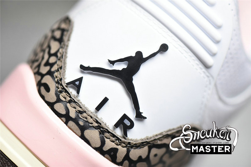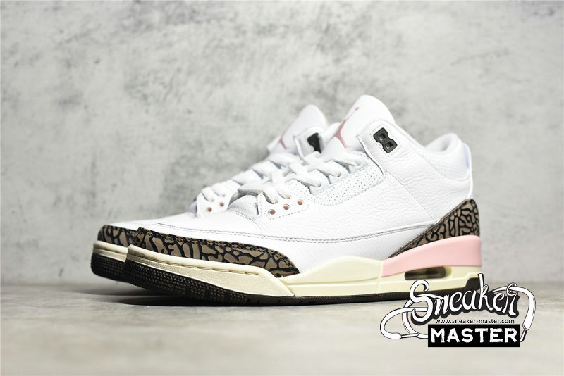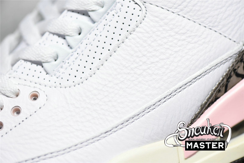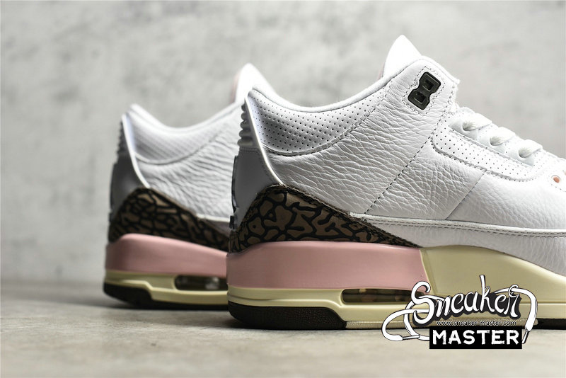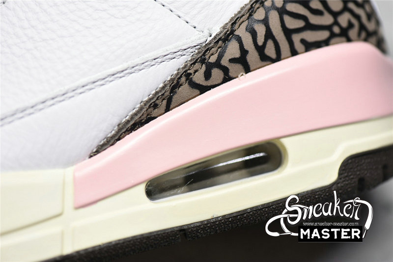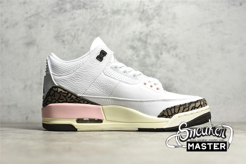 - The Air Jordan 3 Retro showcases a distinctive ice cream-inspired palette. 'Neapolitan' features a white tumbled leather upper, paired with the AJ3's signature elephant-print overlays in Dark Mocha. Hits of pale pink arrive on an embroidered Jumpman on the tongue, eyelets and midsole. A visible Air-sole unit appears under the heel, with a rubber outsole underfoot.