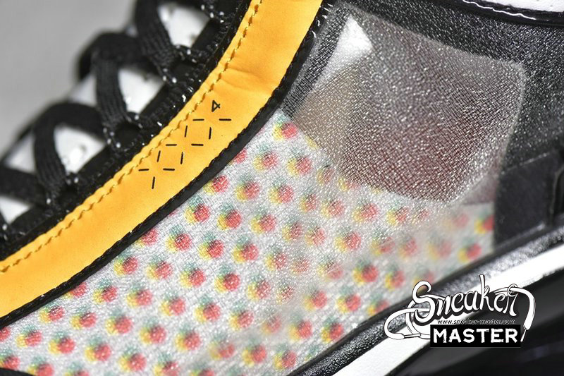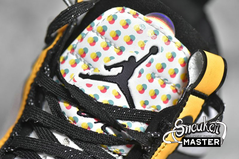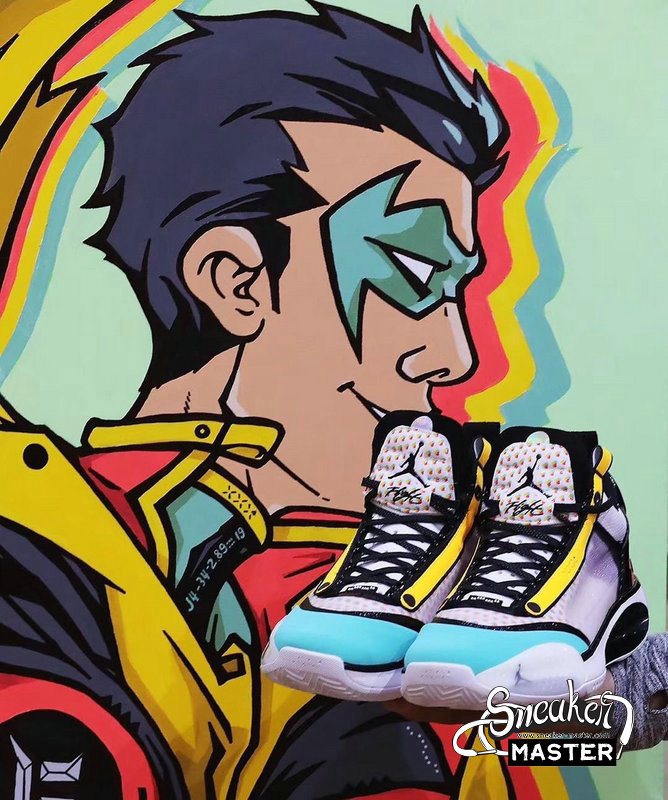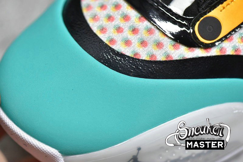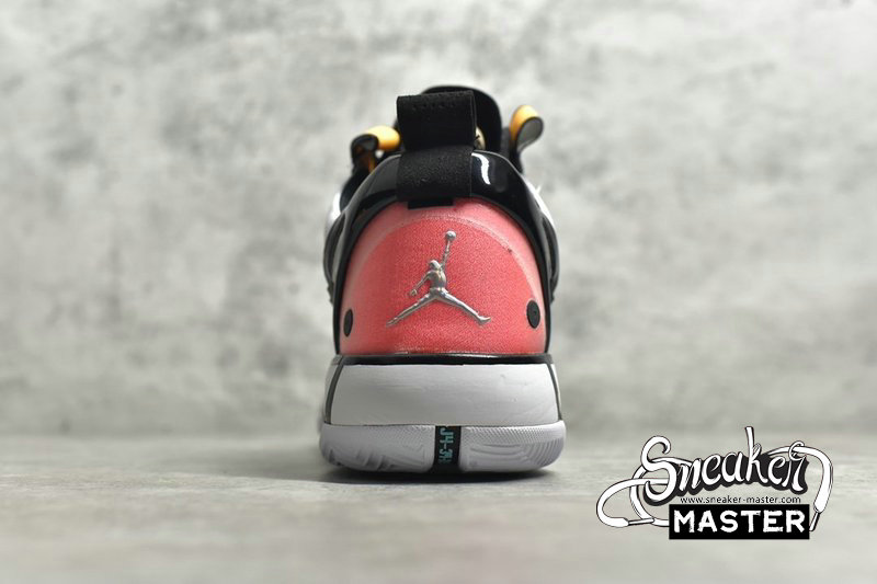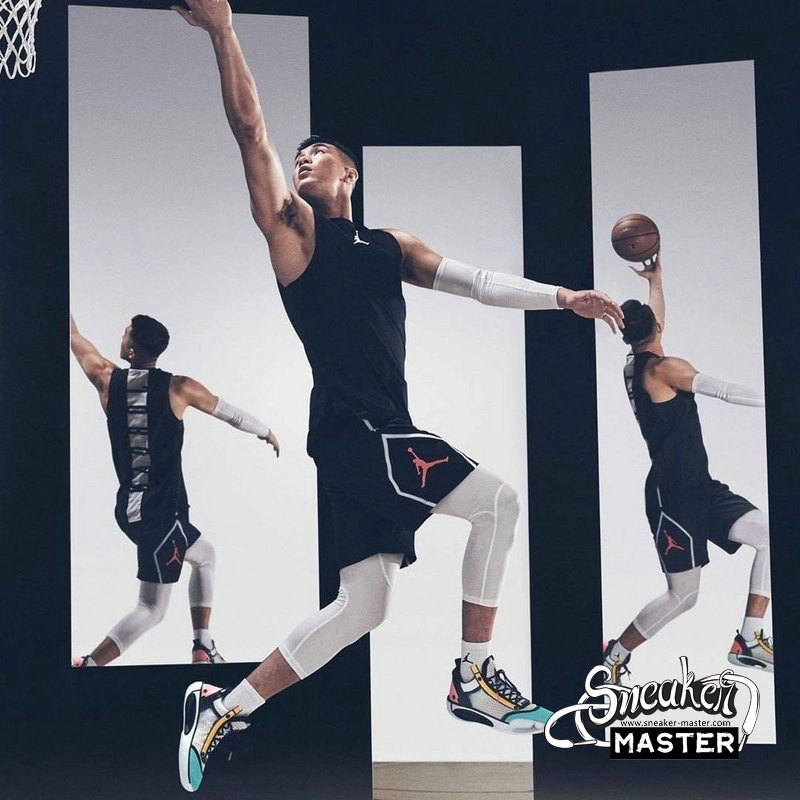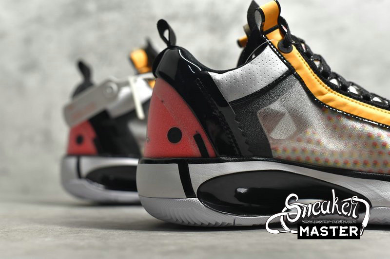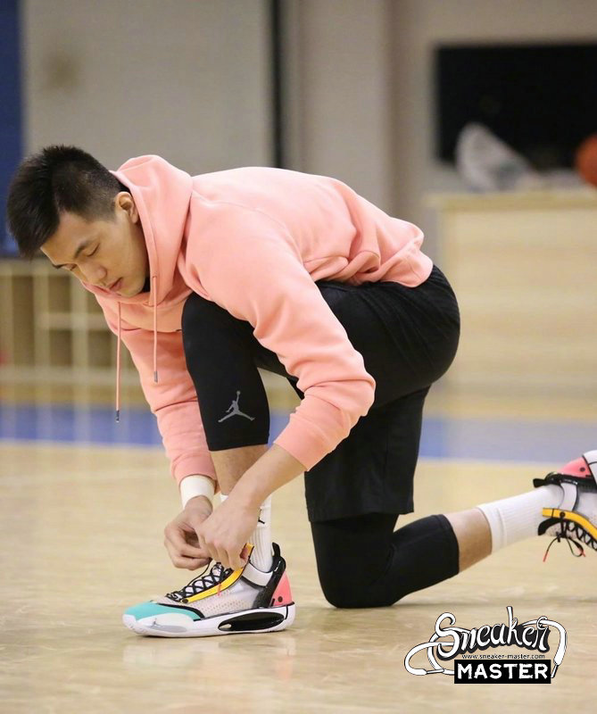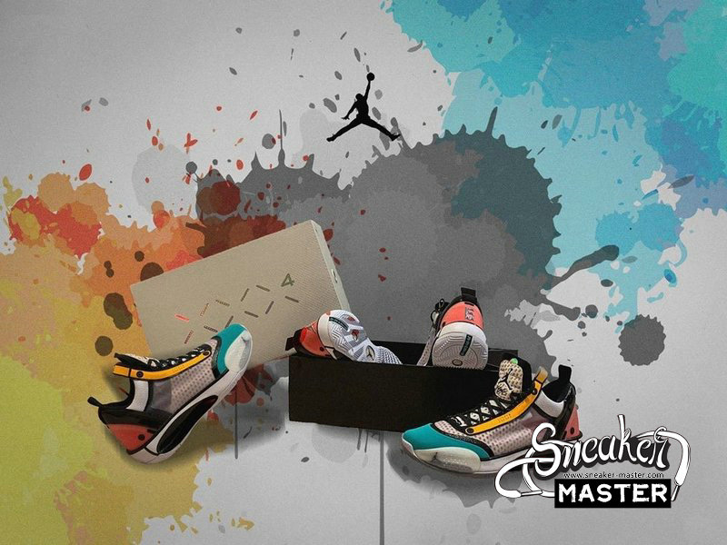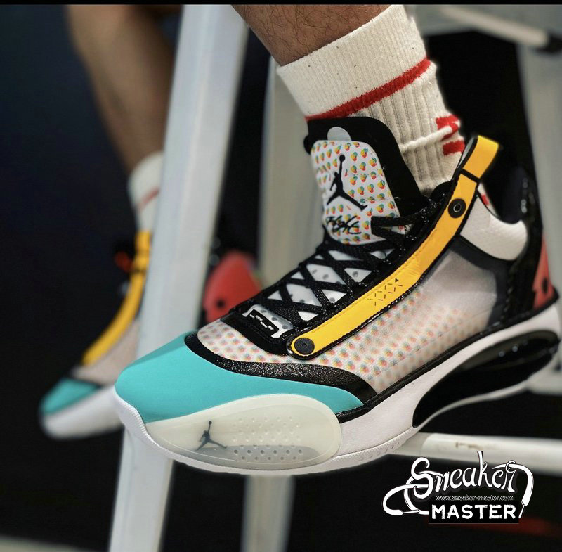 - This offering of the low-top Air Jordan XXXIV sports a colorful color blocking with special characters appearing on the inner tongues. Additional details includes Guo’s logo on the right heel in Silver completed with a White rubber sole.