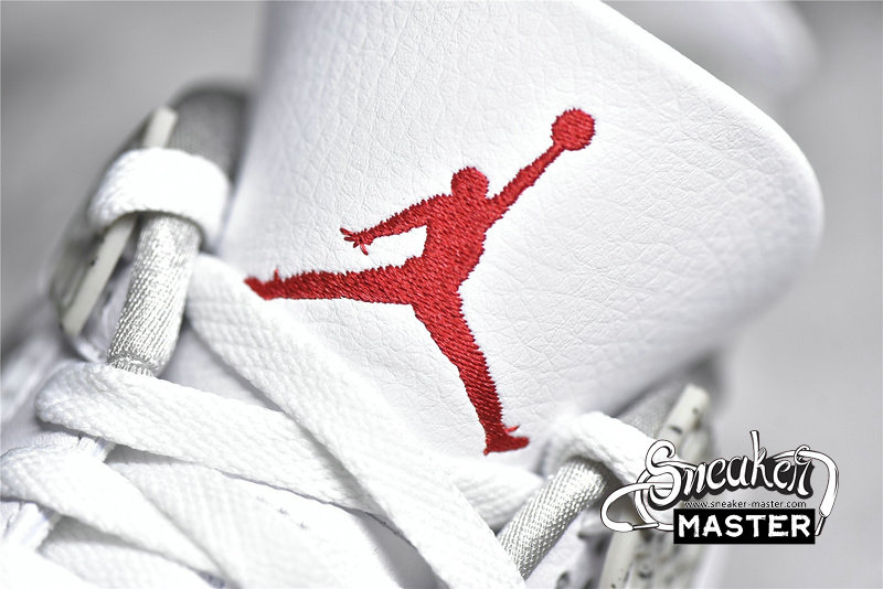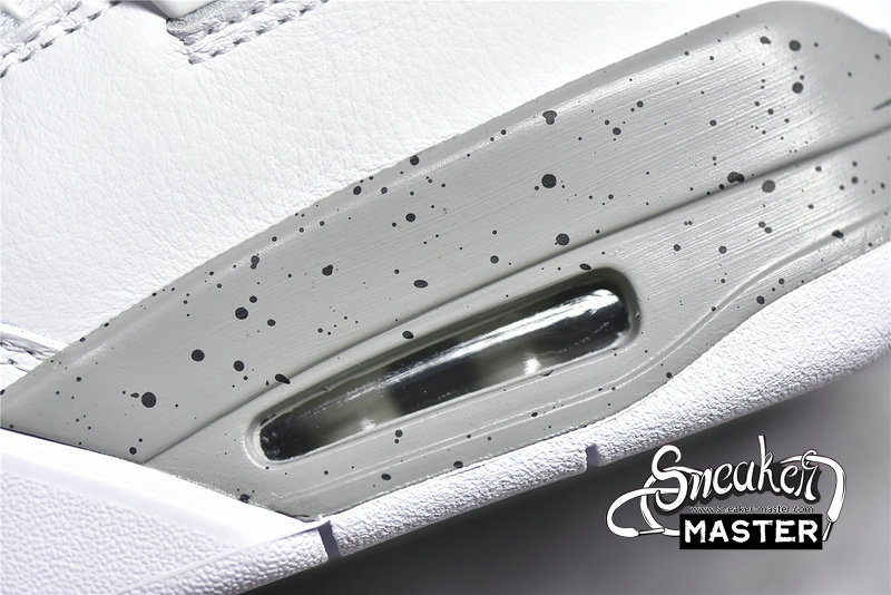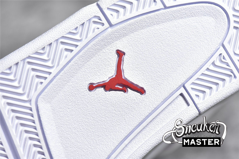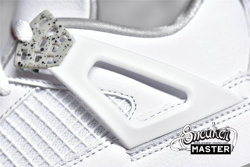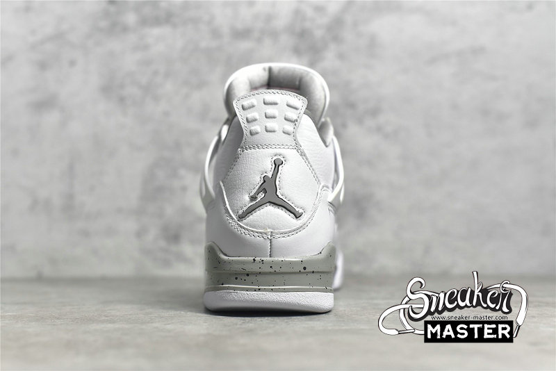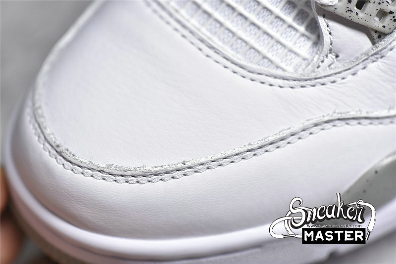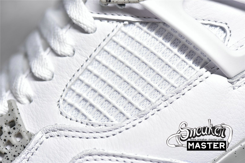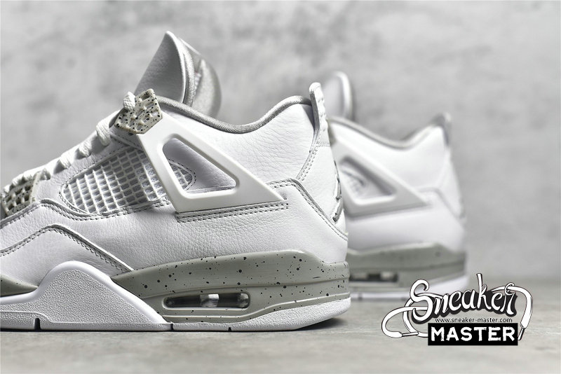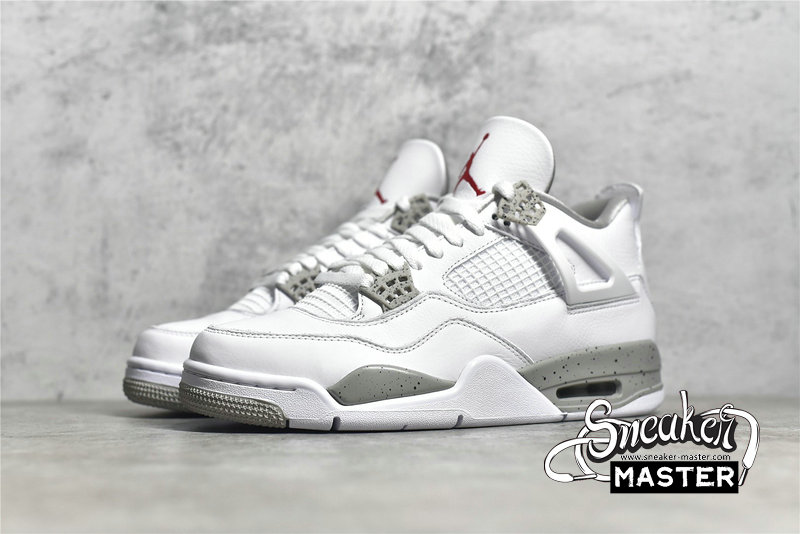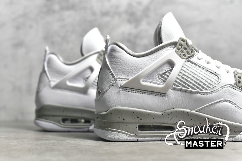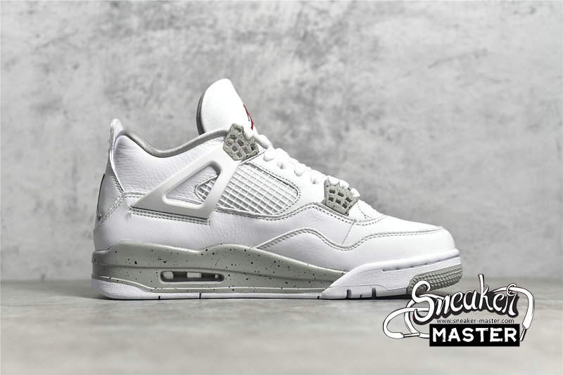 - The Air Jordan 4 Retro GS 'White Oreo' is a grade-school iteration of the shoe known for 'The Shot.' Appearing here in a neutral colorway, the shoe's upper is built with tumbled leather, finished in white and complemented by Tech Grey throughout, including on the speckled, molded eyelets. The usual mesh inserts mark the quarter panel and vamp, while the tongue adds Fire Red via the Jumpman branding. Underfoot, visible Air in the heel of the midsole provides cushioning.
