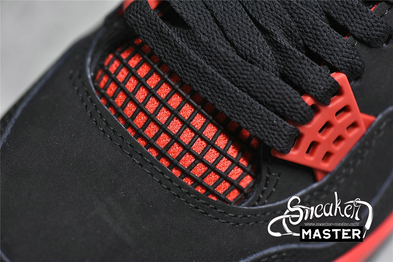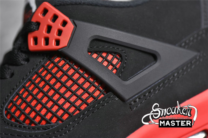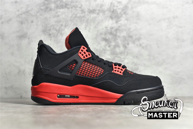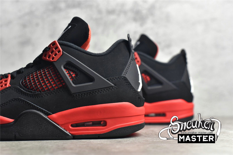 - Recalling the 'Thunder' colorway, the Air Jordan 4 Retro 'Red Thunder' emerges with similar color-blocking, albeit in a different mix of hues. The shoe's upper is built with a black nubuck base, highlighted by red throughout, including on the molded eyelets and quarter panel. More red marks the midsole, which includes visible Air for cushioning, while a two-tone rubber outsole is included for traction.