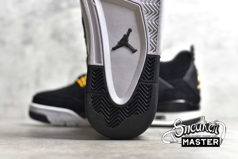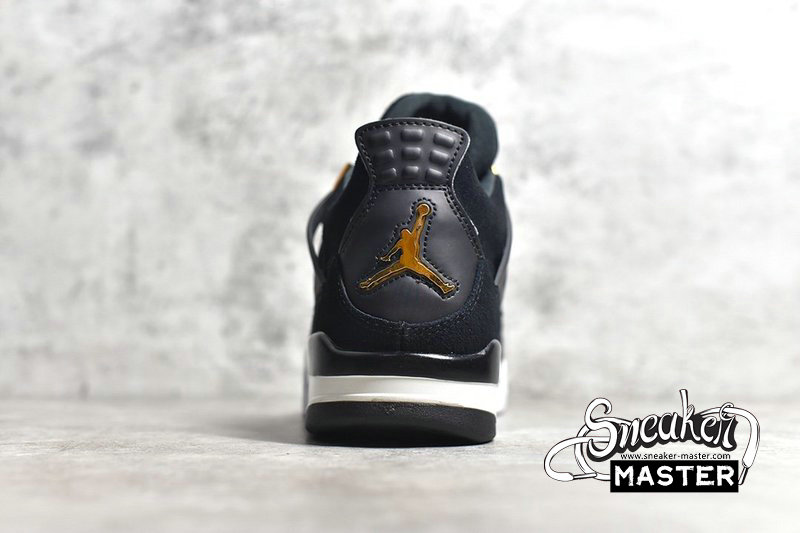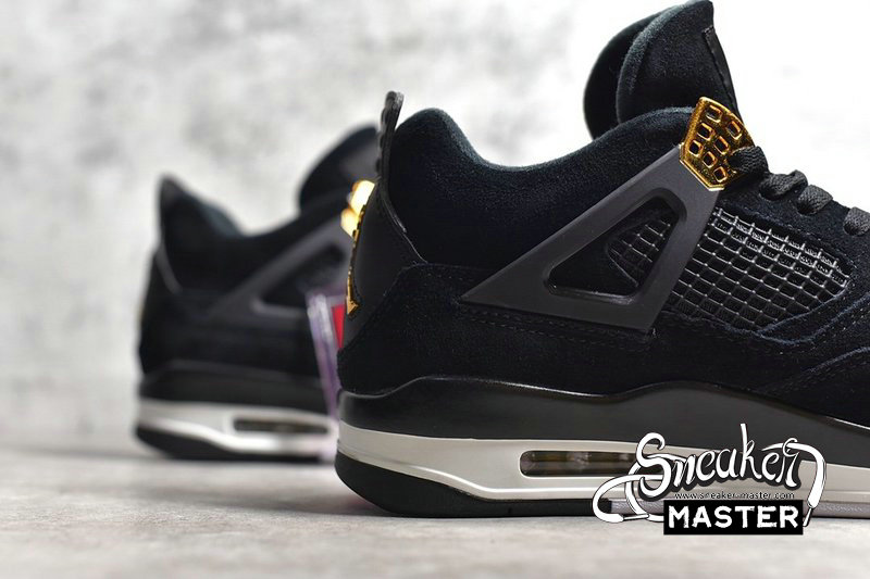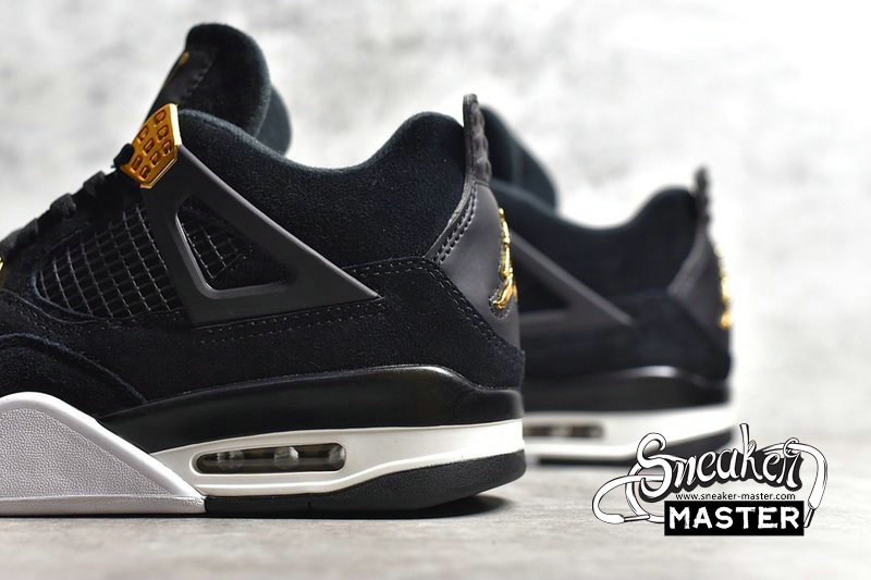 - The Air Jordan 4 Retro 'Royalty' brings elevated accents and an elevated construction to the classic basketball silhouette. Built with suede, the shoe's upper appears in black, overlaid by synthetic leather on the heel and highlighted by metallic gold on the signature eyelets and heel branding. Underfoot, visible Air in the heel of the contrasting polyurethane midsole provides cushioning, giving way to a herringbone rubber outsole for traction.