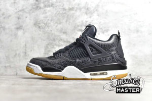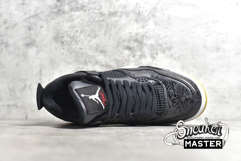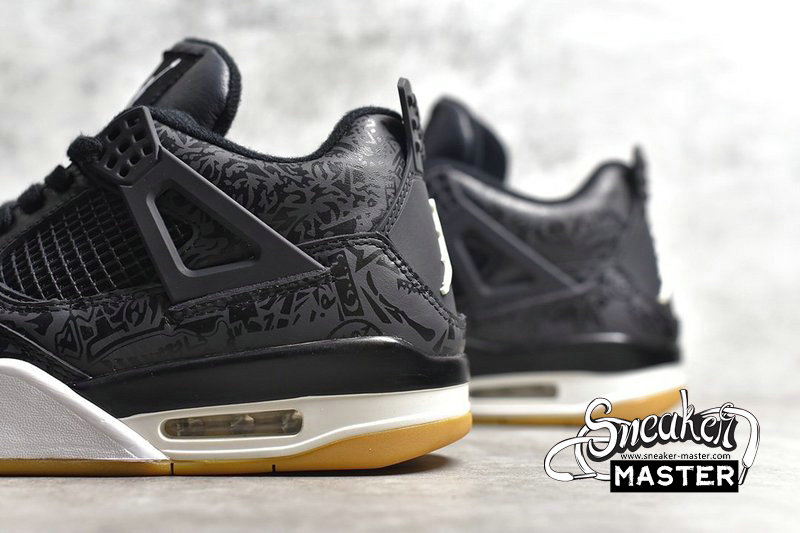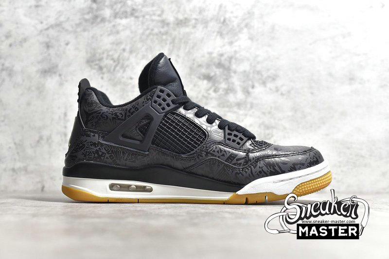 - Introduced in January 2019, the Air Jordan 4 Retro ‘Laser’ commemorates the iconic silhouette’s 30th anniversary. Laser-etched designs return on this iteration, which features the adornments in subdued tonal style on a full-grain black leather upper. Eye-catching white contrasts appear on the Jumpman emblems that decorate the heel and tongue tag, while a gum rubber outsole promises superior traction.