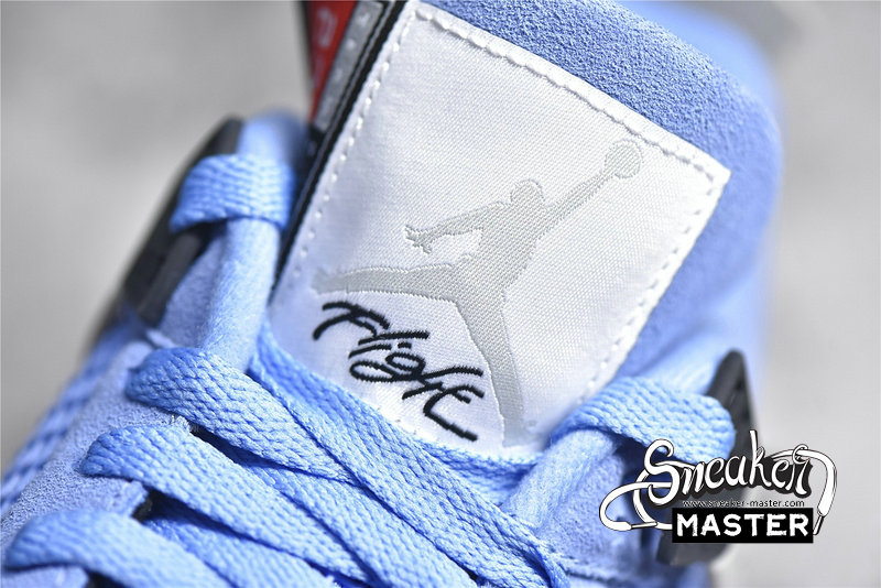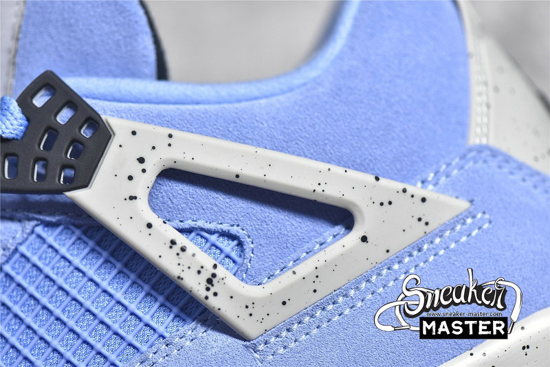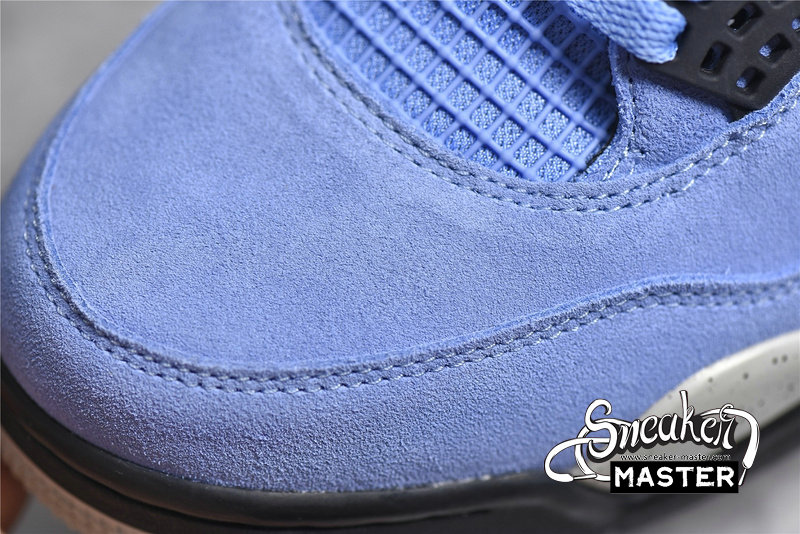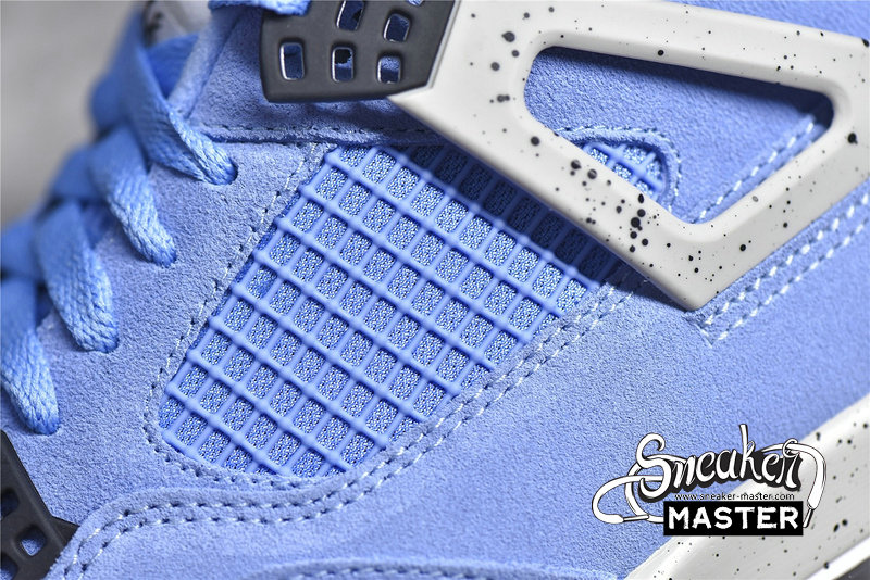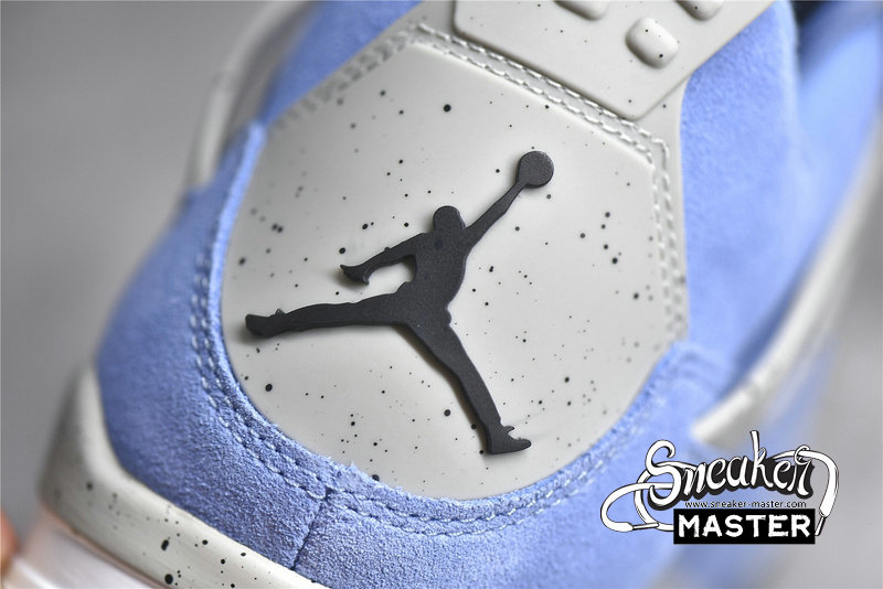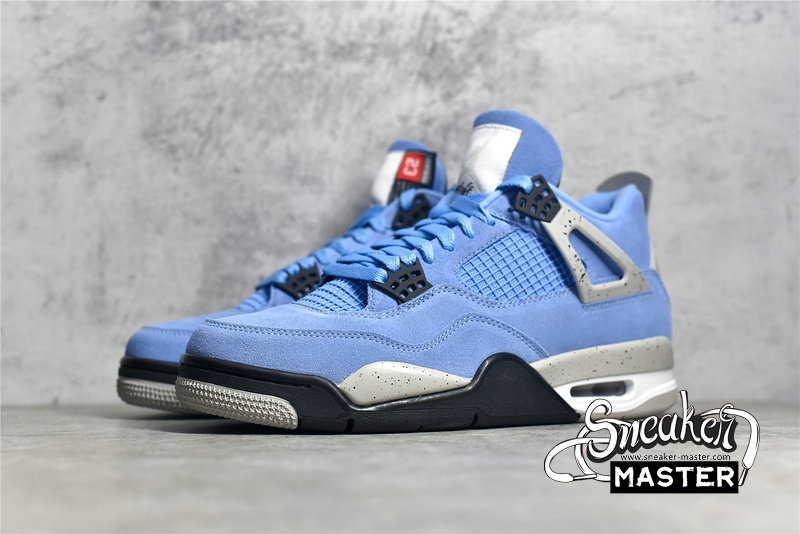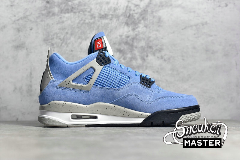 - The Air Jordan 4 Retro 'University Blue' looks to Michael Jordan's college days to inform its classic look. Built with suede, the shoe's upper appears primarily in University Blue, with cement detailing on the classic wings and heel overlay. Tonal mesh inserts emerge at the vamp and quarter panel, while the tongue tag is designed to look like a jock tag on the bottom hem of Jordan jerseys. Visible Air in the heel of the speckled midsole provides cushioning.