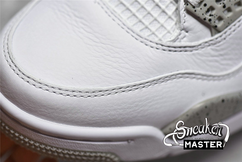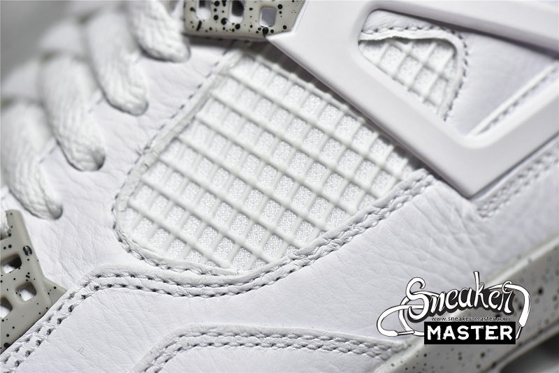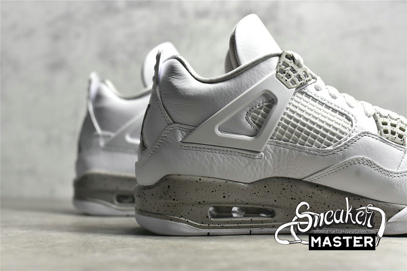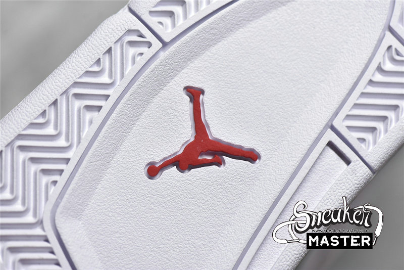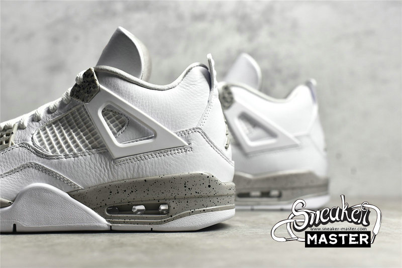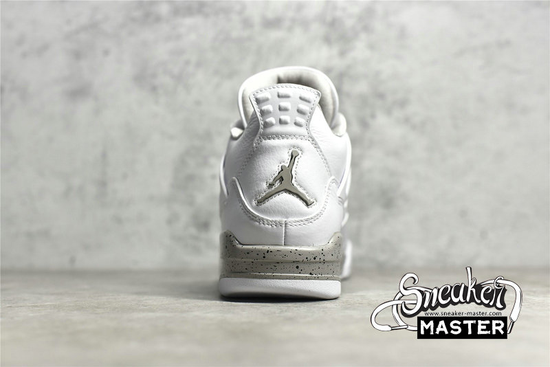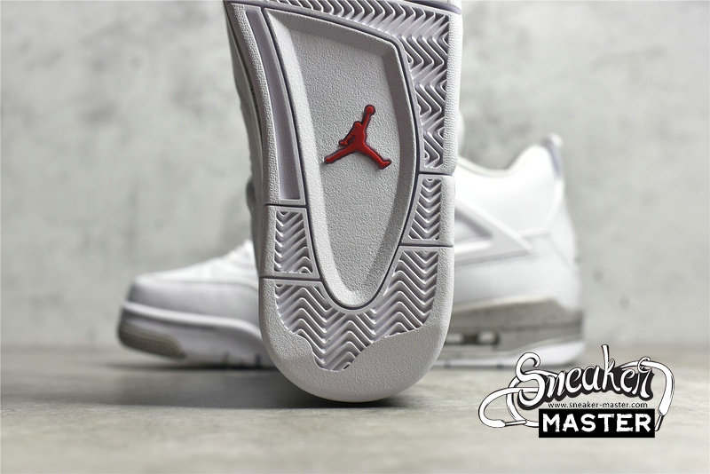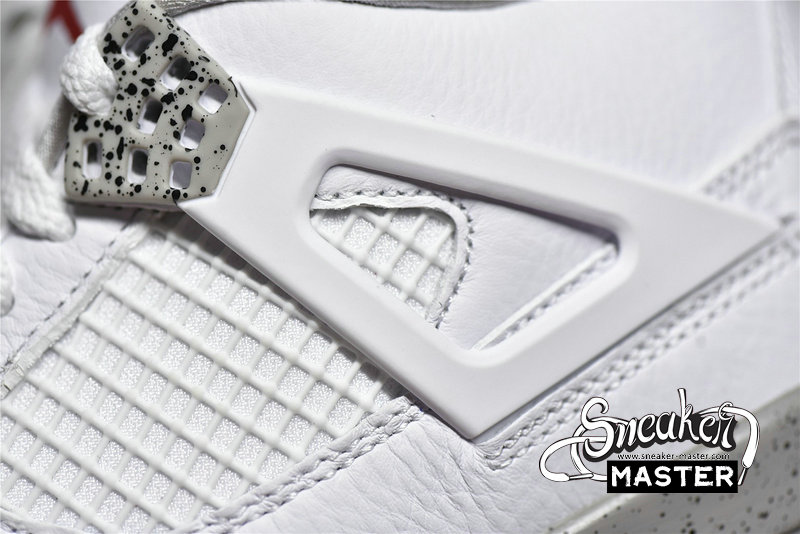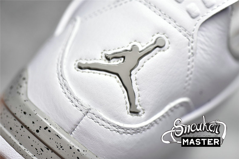 - This Air Jordan 4 features an all-White tumbled leather upper detailed with speckled Cement Grey on the plastic eyelets and midsole. A solid Grey Jumpman on the heel, Red Jumpman logos on the tongues, insole and outsole atop a White rubber sole completes the design.