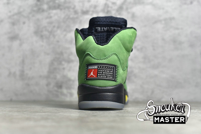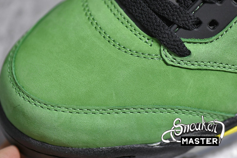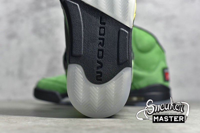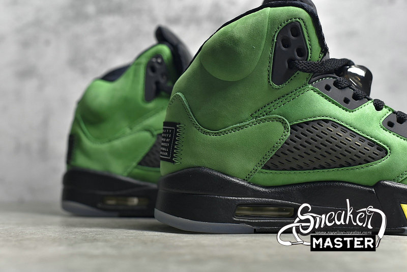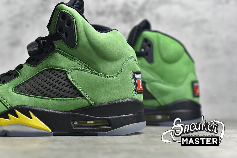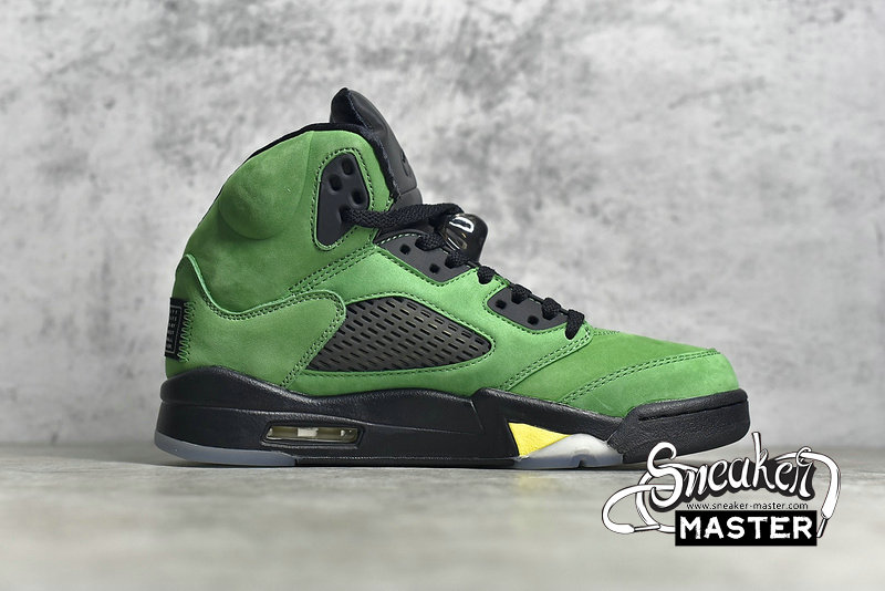 - Giving the nod to the University of Oregon, the Air Jordan 5 Retro SE 'Oregon' emerges with the school's colors on its classic basketball construction. Built with suede, the upper appears in Apple Green, with black constrast on the eyelets, tongue and mesh inserts. Underfoot, more black emerges on the Air midsole, which is accented by Yellow Strike on the signature shark-tooth detailing.