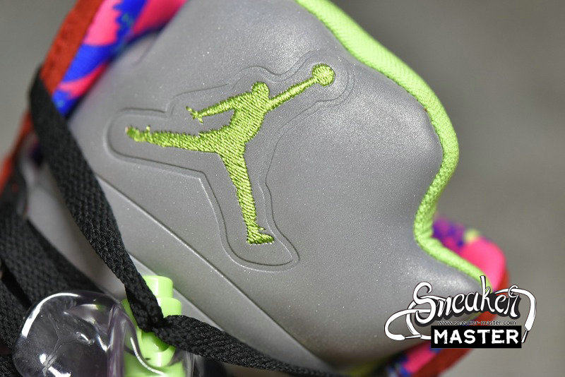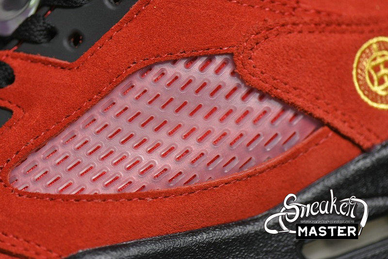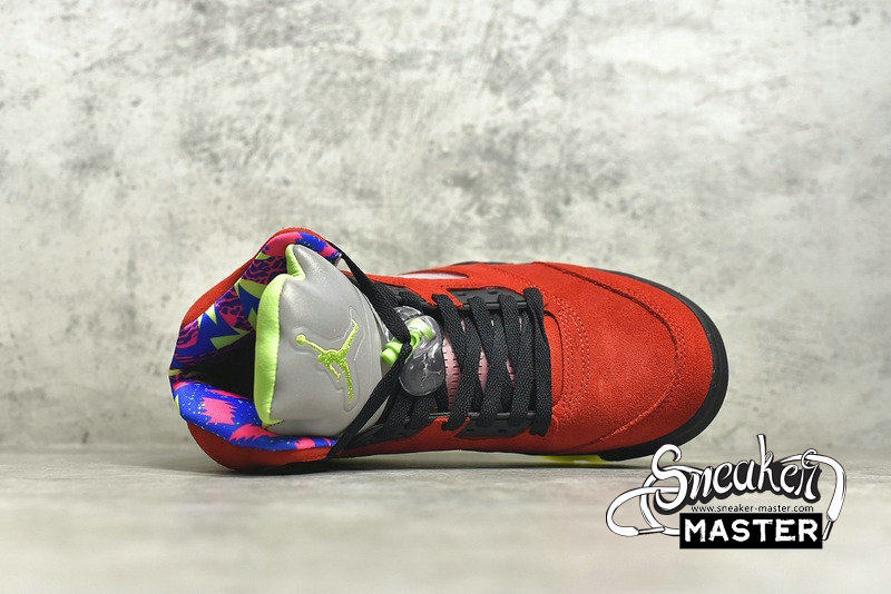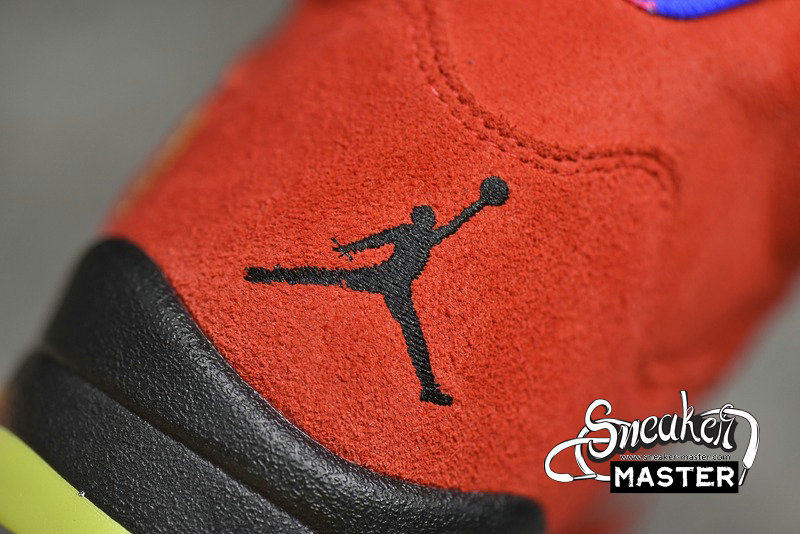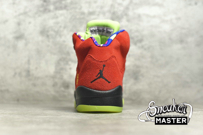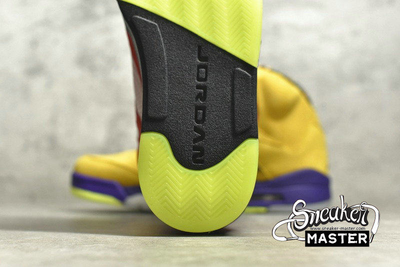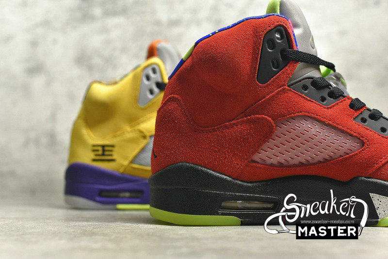 - Celebrating 30 years of the silhouette, the Air Jordan 5 Retro SE 'What The' brings together elements of various Air Jordan 5 models. The right shoe's yellow suede upper draws from the 'Tokyo,' with a stylized '23' on the heel. The left shoe incorporates the Raging Bull pack, with red suede accented by a 'Shanghai' heel emblem. Underfoot, both midsoles house visible Air in the heel for cushioning, while elements of the 'Bel-Air,' 'Laser' and 'Quai 54' are also included.