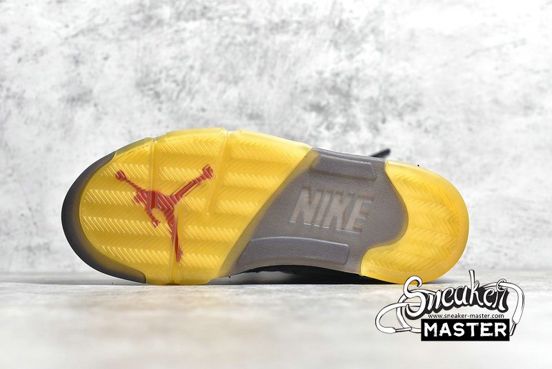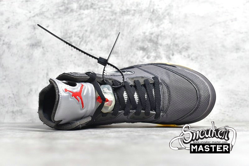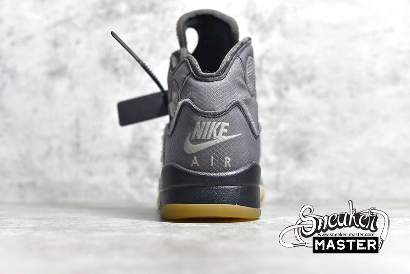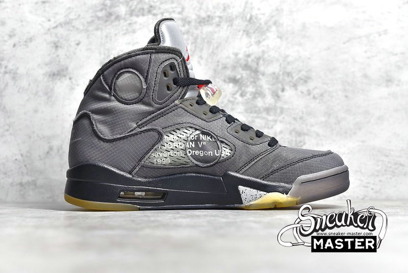 - A collaboration between Virgil Abloh and Jordan Brand, the OFF-WHITE x Air Jordan 5 SP 'Muslin' is a stylized take on the silhouette. Built with faded black textile, the upper includes reflective silver detailing on the tongue. The laces and medial side sport Abloh's signature text, while underfoot, the outsole sports a pre-yellowed aesthetic.