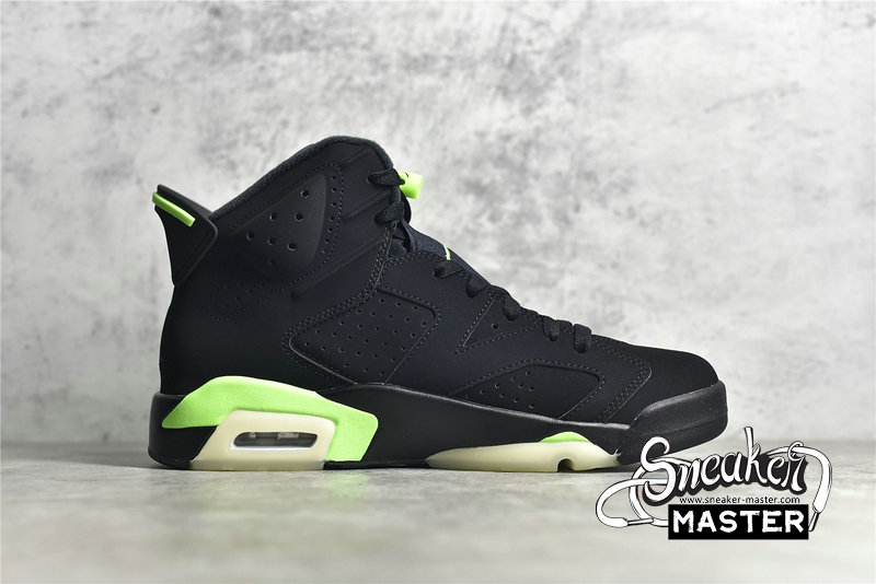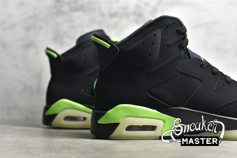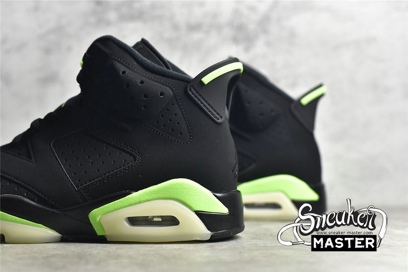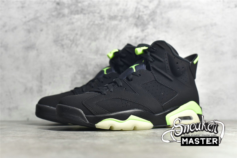 - The Air Jordan 6 Retro ‘Electric Green’ is defined by a two-tone color scheme that recalls an Oregon PE colorway first seen online in 2018. The classic hoops style features a black nubuck upper with pops of neon green on the tongue and pull tab. An embroidered Jumpman logo appears on the sneaker’s back heel. A polyurethane sole provides lightweight cushioning, fitted with a visible Air sole unit and additional green hits. Underfoot, the semi-translucent rubber outsole is finished in a glow-in-the-dark treatment.