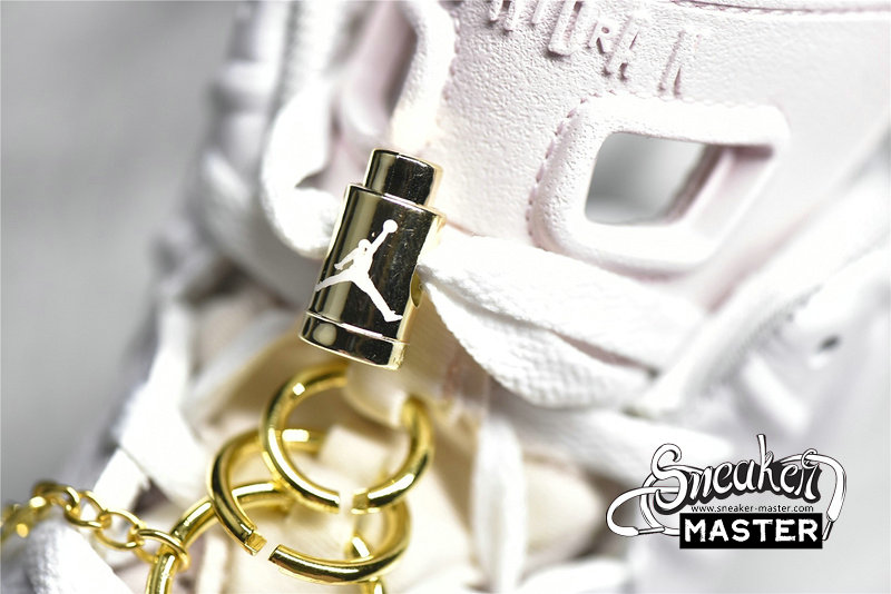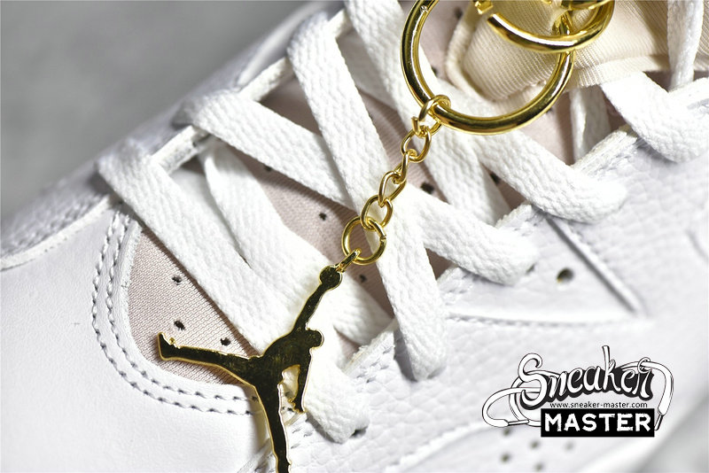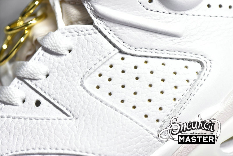 - The Air Jordan 6 Retro 'Gold Hoops' brings elevated hits fit for its championship pedigree. Built with tumbled leather, the shoe's upper appears in white, complemented by Barely Rose on the tongue and heel pull-loop. A metallic gold lace lock and earring-inspired gold hoops highlight the design, matched by the attached Jumpman charm. Underfoot, a two-tone midsole houses visible Air in the heel for cushioning, giving way to a milky rubber outsole for traction.