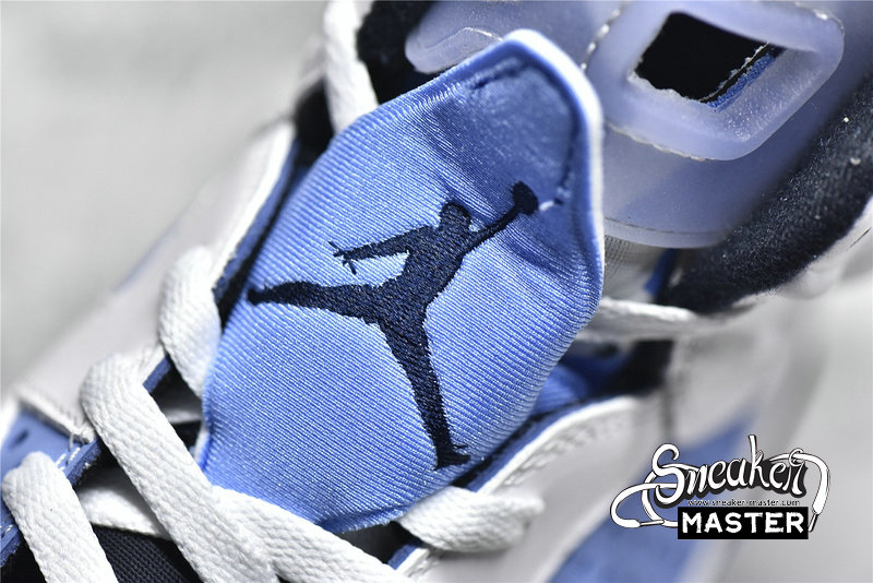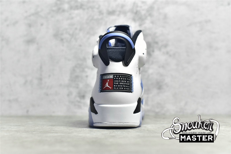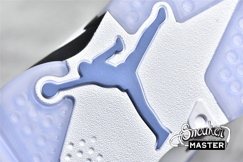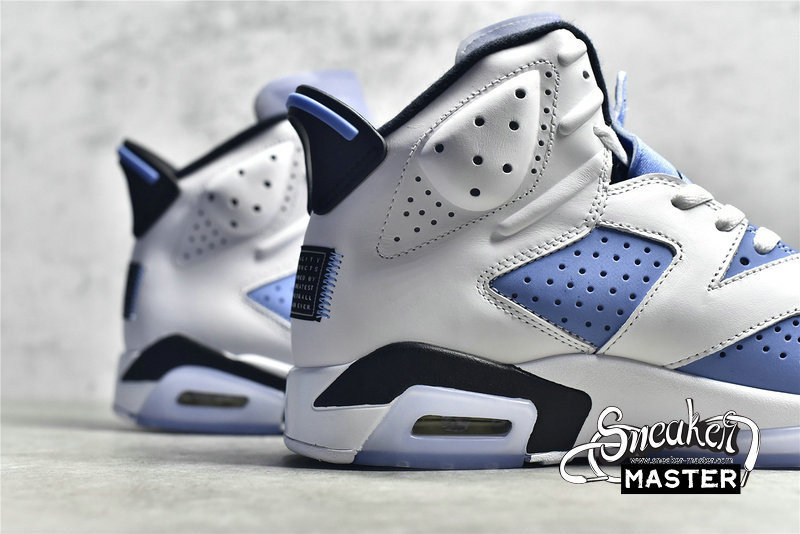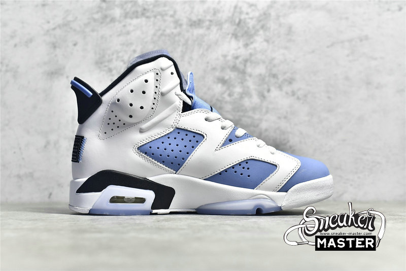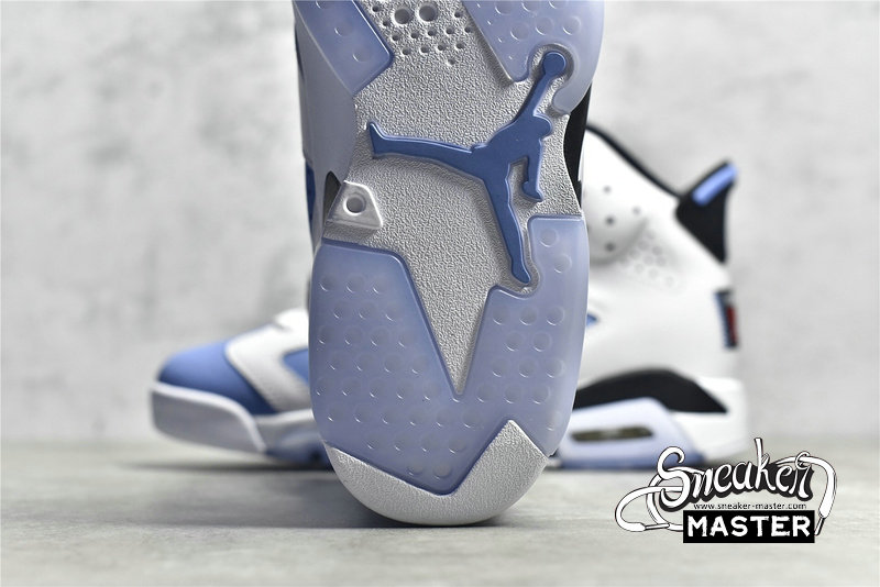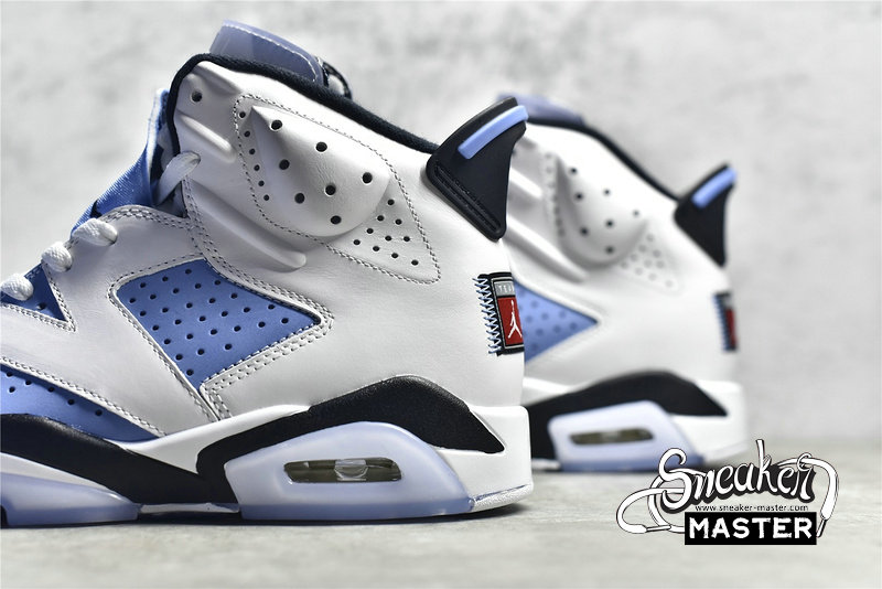 - The Air Jordan 6 Retro 'UNC Home' pays homage to Michael Jordan’s alma mater, bearing a colorway reminiscent of the University of North Carolina. The classic hoops sneakers feature a white leather upper set against University Blue nubuck underlays. Hits of navy appear on the molded TPU heel tab and collar lining. Navy repeats on the midsole, which houses visible Air-sole cushioning. The jock tag on the heel reinforces the shoe’s varsity athletics theme.