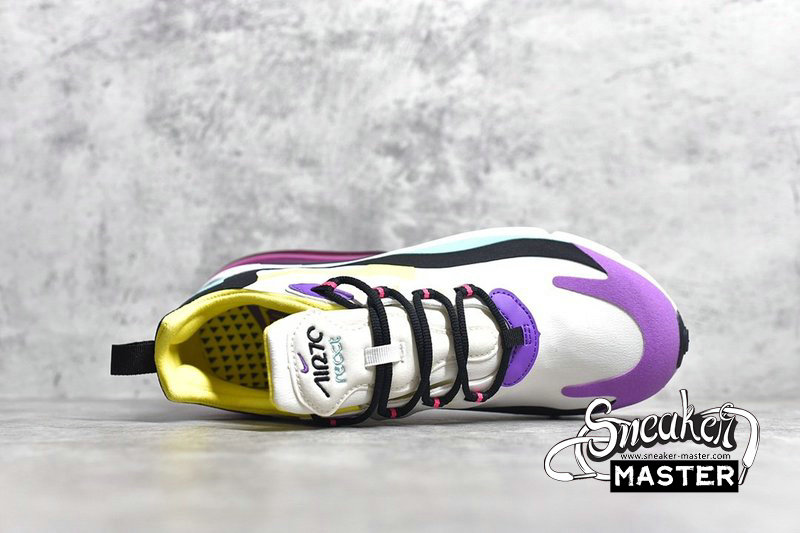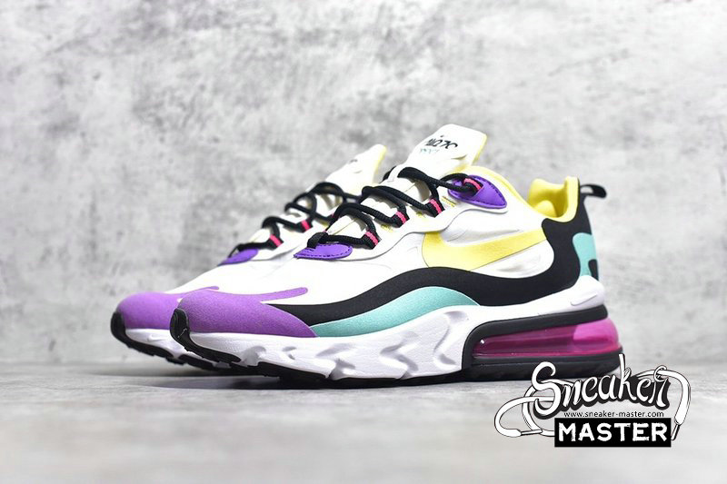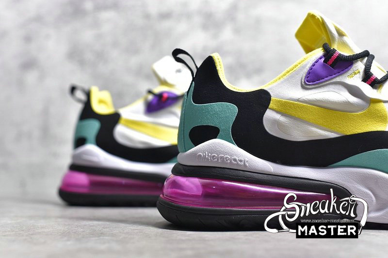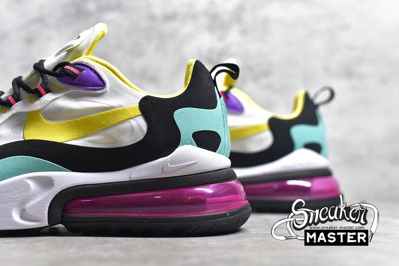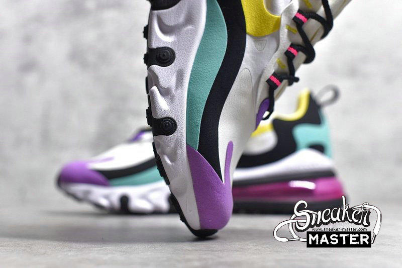 - The Air Max 270 React 'Geometric Abstract' features a vibrant mix of colors, creating a retro-style look on the August 2019 release. The shoe's white base is overlaid by multicolor suede, including Dynamic Yellow, Bright Violet and teal, with black contrasting the design. Underfoot, the hybrid midsole includes React foam at the forefoot and a pink 270 Max Air unit in the heel.