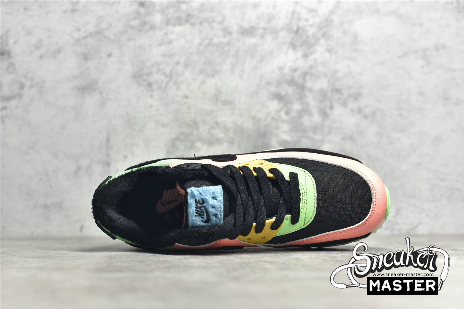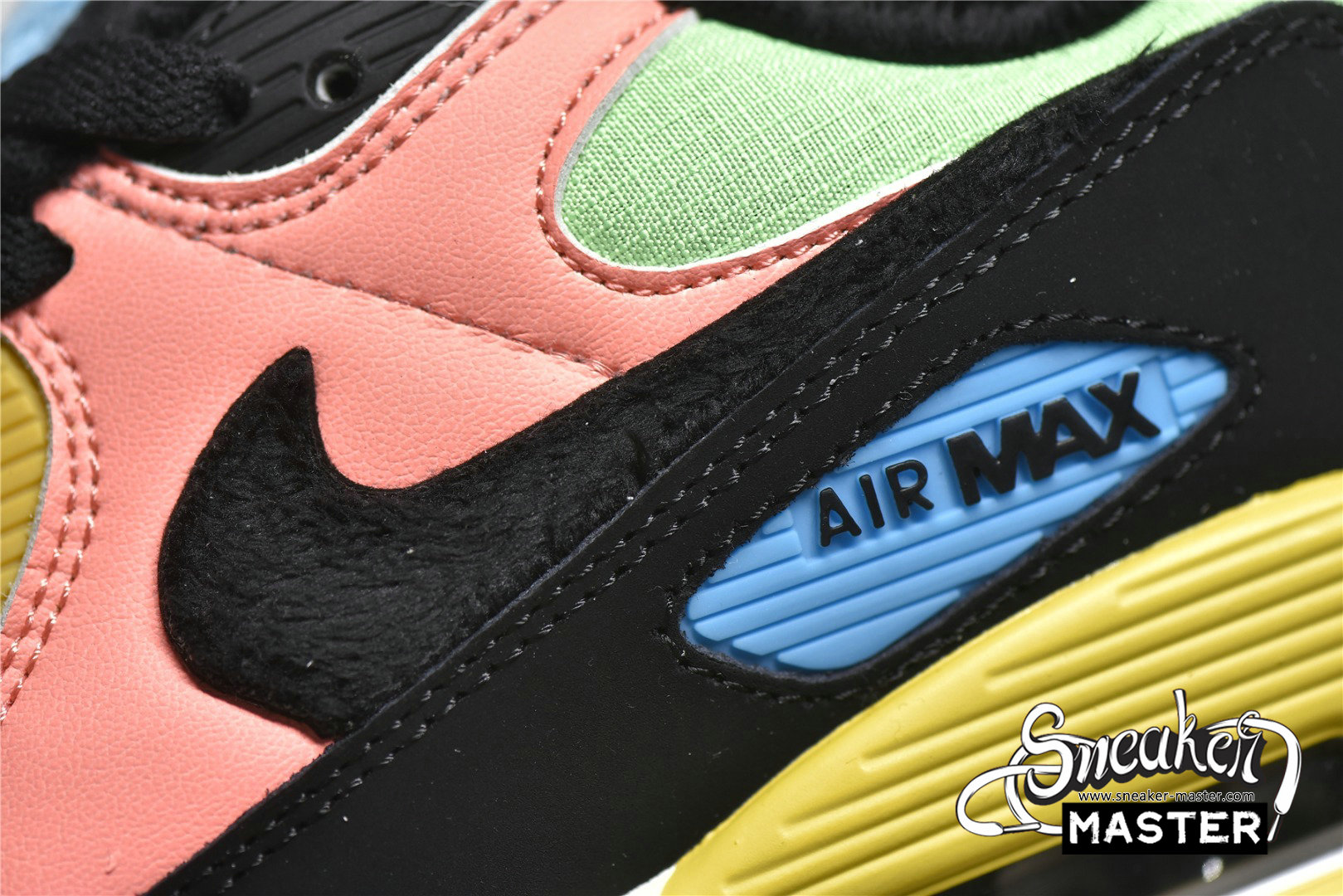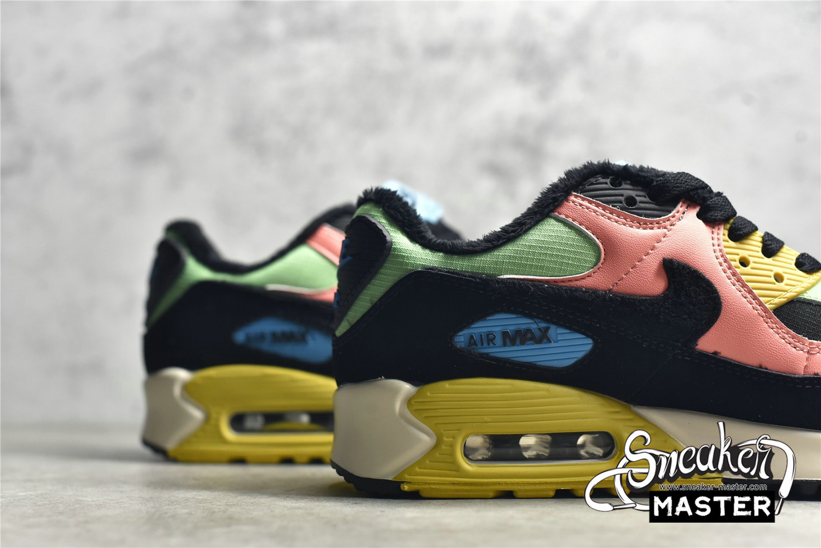 - The Air Max 90 'Fur - Multi-Color' brings a vibrant look to its classic running construction. The shoe's upper incorporates a mix of textile and leather, finished in a vibrant mix of hues and overlaid by a black mudguard. The Swoosh, tongue tag and inner lining all sport a furry texture, while underfoot, the midsole houses visible Air in the heel to provide cushioning. A tritone rubber waffle outsole provides traction.