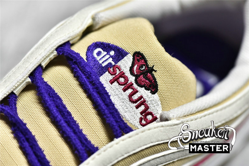 - Showcasing a more playful take on the retro running shoe, the Air Max 97 'Cream' is part of Nike's 'Air Sprung' collection. It features purple rope laces that secure the tan textile upper with a series of wavy synthetic suede overlays in a subtle cream hue and a single textile overlay in fuchsia. Each webbing heel tab is inscribed with 'Air Sprung' with the tongue featuring a butterfly graphic on the left shoe and a caterpillar graphic on the right. The caterpillar is repeated on the embroidered Swoosh on the lateral quarter panel, while lightweight cushioning is offered from a purple-tinged full-length Max Air unit.