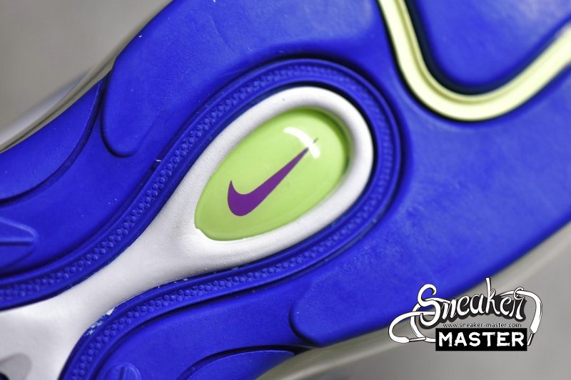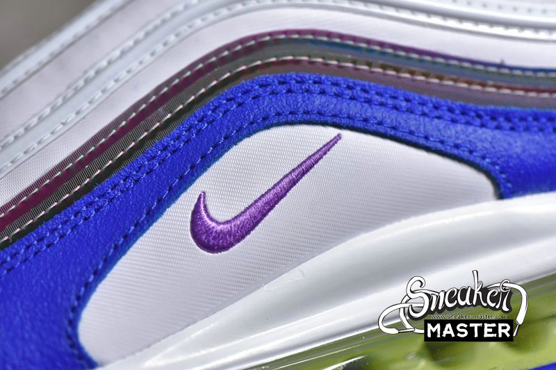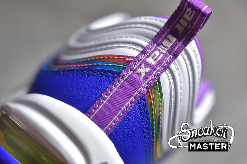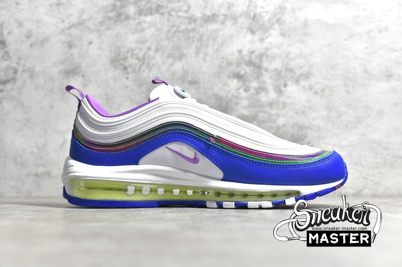- The Air Max 97 'Easter' emerges with a vibrant colorway. The shoe's wavy upper includes an iridescent overlay around the midfoot, while Purple Nebula marks the inner lining and pull-loops, with Hyper Blue accenting the mudguard. The tongue sports a removable Velcro patch that reveals a broken-egg graphic, while underfoot, a Volt Max Air unit provides cushioning.