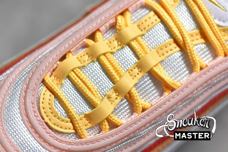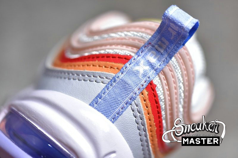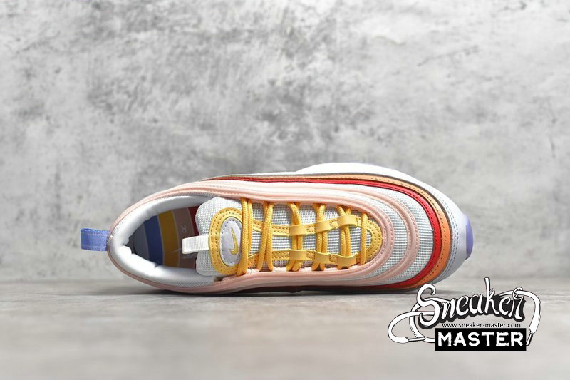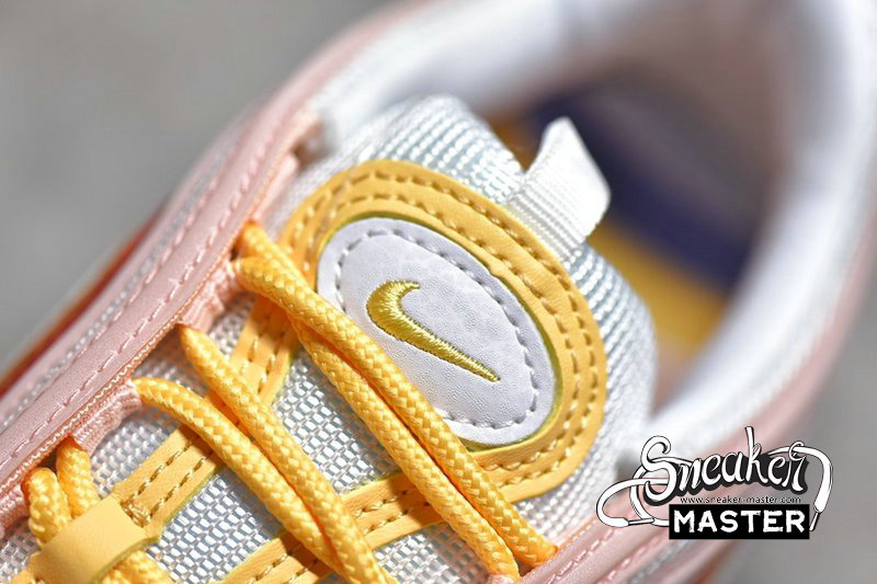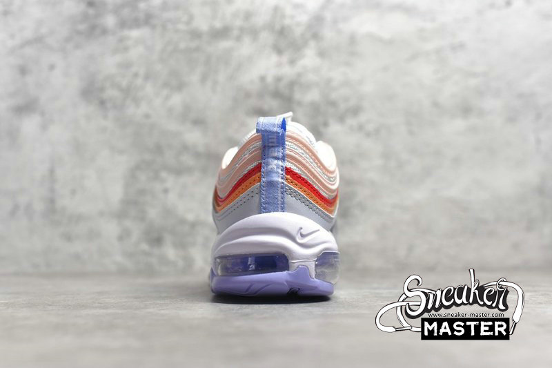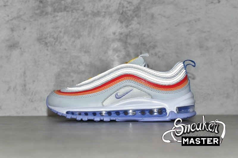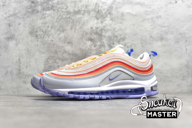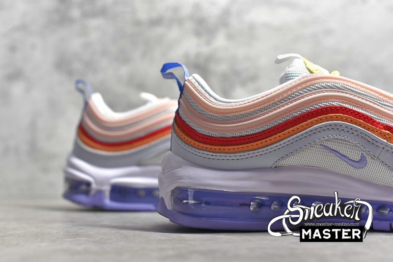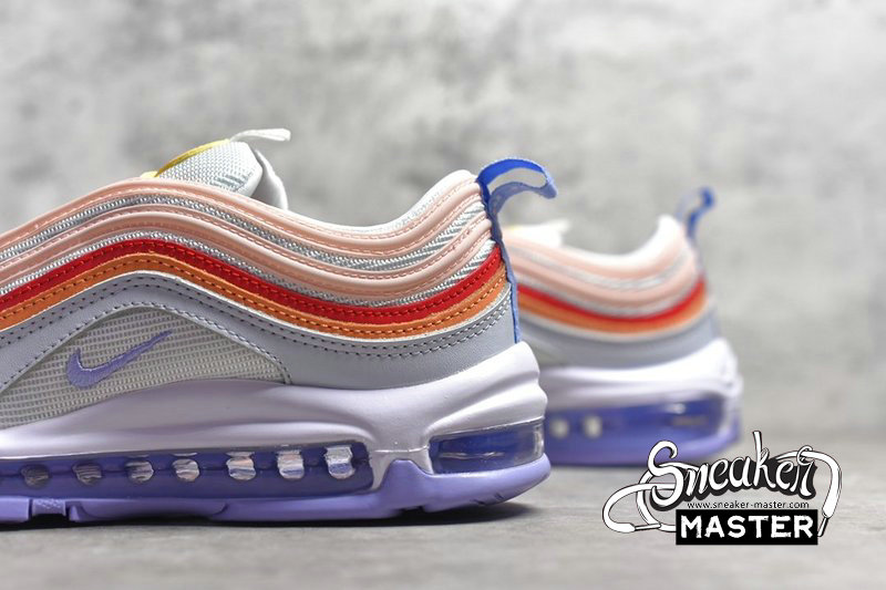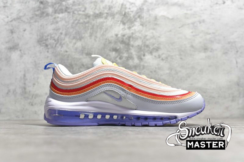 - This offering of the Nike Air Max 97 features a White mesh base highlighted with Red, Orange, and Sunny Yellow hues. The shoe also comes equipped with Lavender accents on the heel pull tab, Swoosh logos, and rubber outsole.