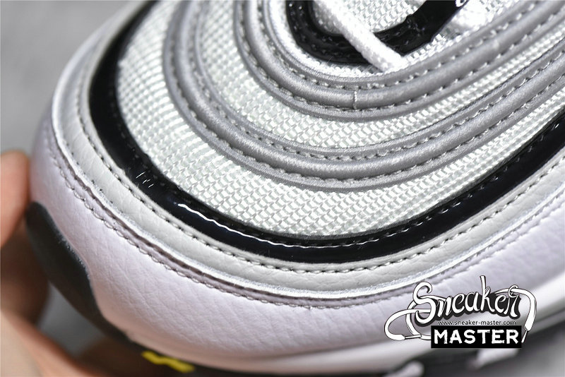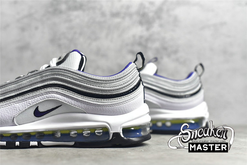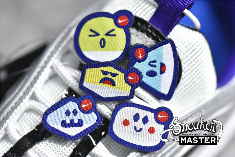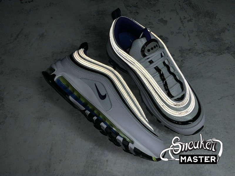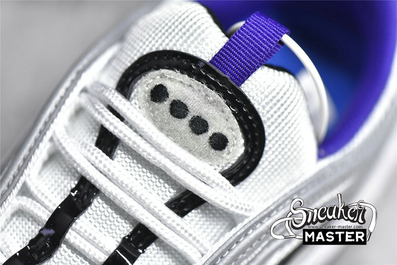 - This edition of the Nike Air Max 97 features a White mesh upper with Reflect Silver, Black patent, and White leather overlays. Other details includes Purple inner lining and embroidered mini Swooshes, Volt and Blue contrasting accents throughout as well as on its Air support units atop a White midsole and Black rubber outsole. Finishing off the design are velcro Japanese emojis with speech bubble graphic insoles completes the design.