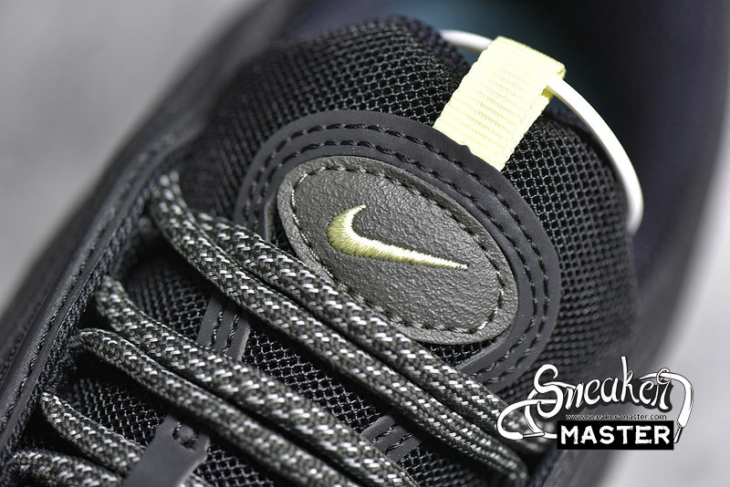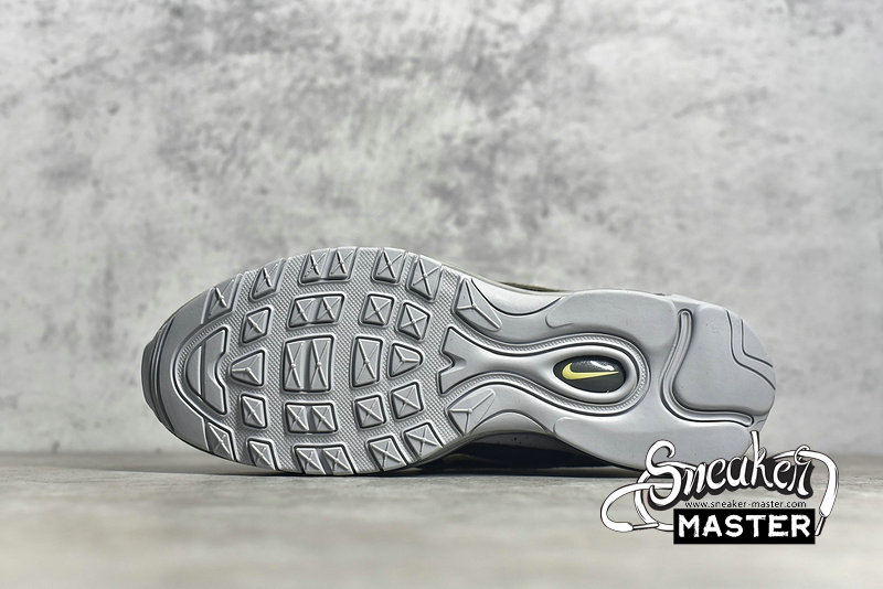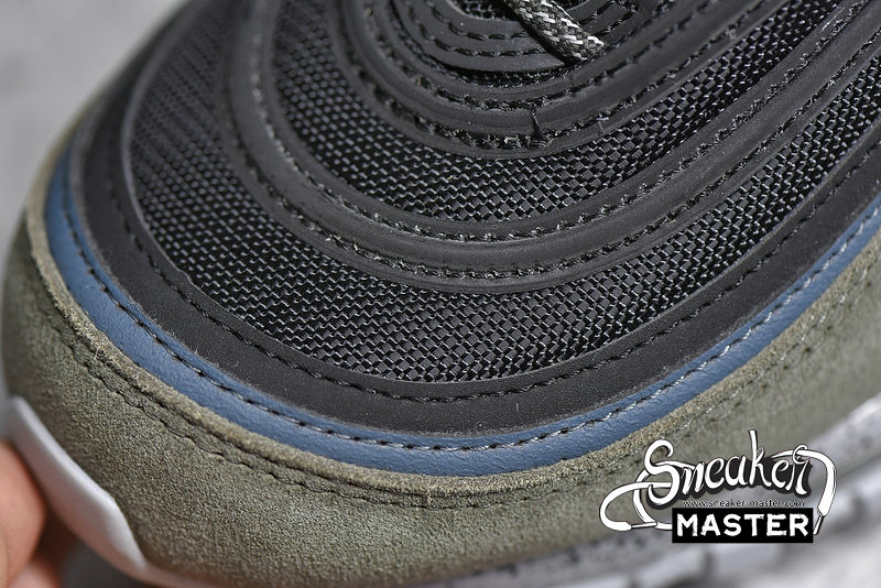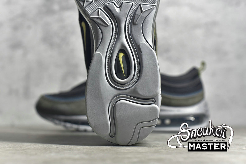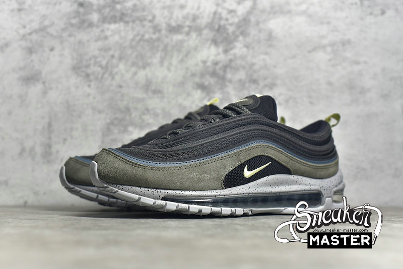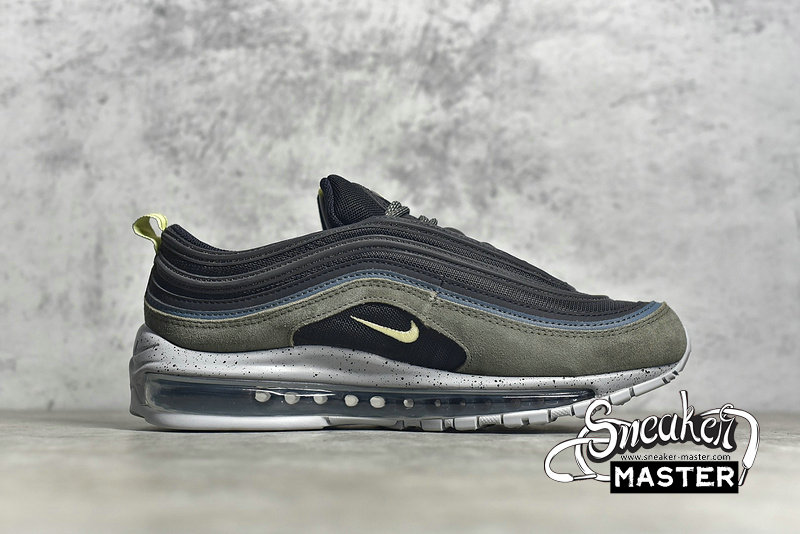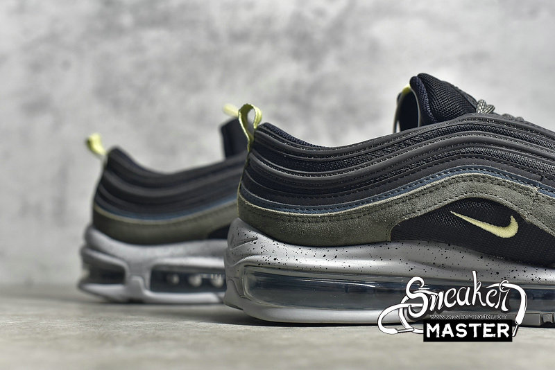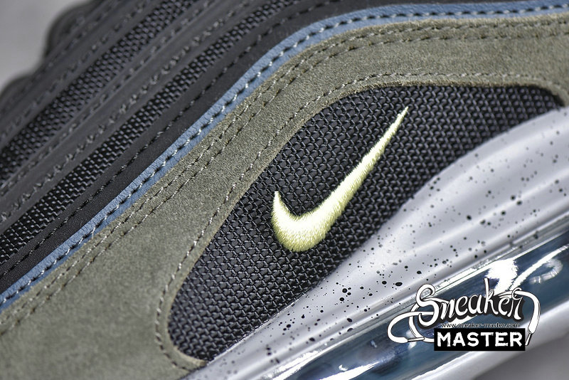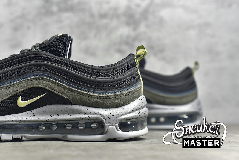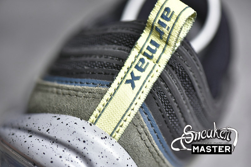 - This Nike Air Max 97 comes constructed with Black mesh on the base while leather and suede is applied to the overlays in Slate Blue and an Olive like shade. A shade of Yellow is seen on the pull tabs and Swoosh, 3M accents are spread throughout while a Grey speckled midsole finishes the look.