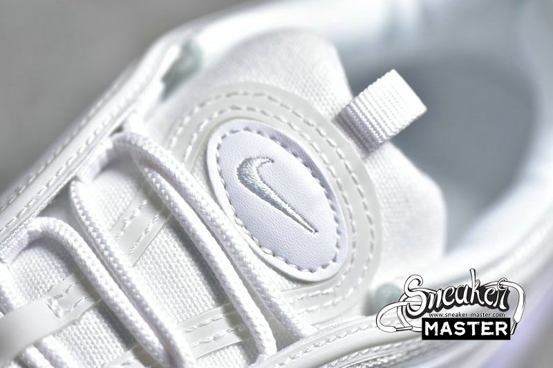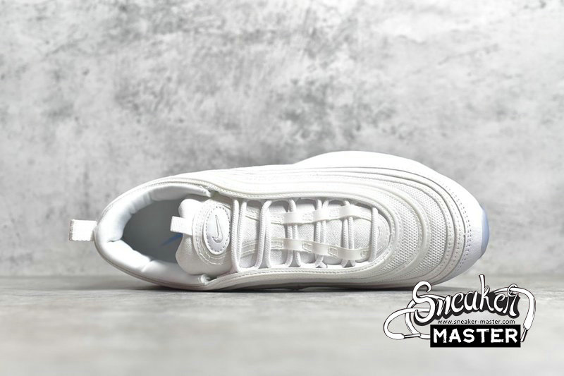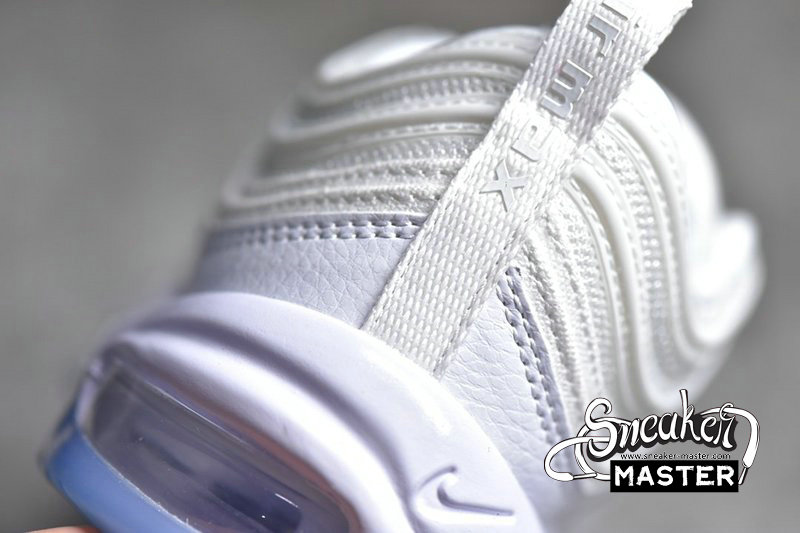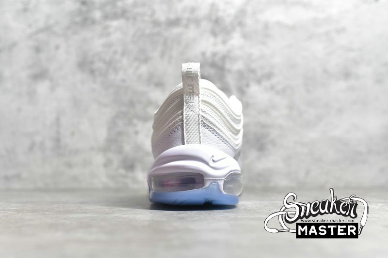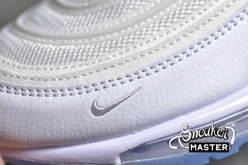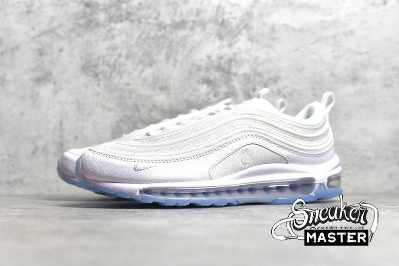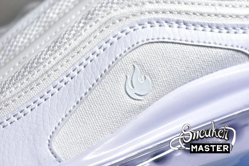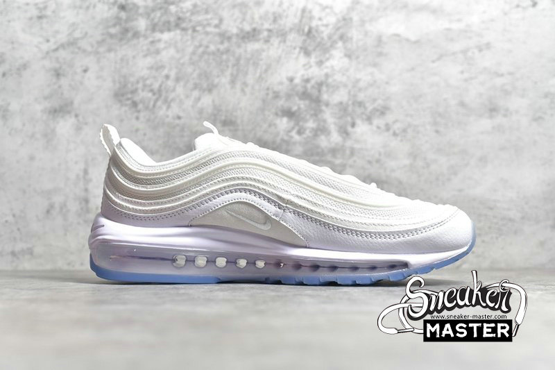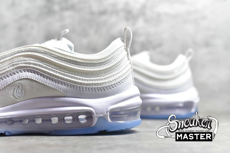 - This offering of the classic Nike Air Max 97 features a White mesh upper with matching tumbled leather overlays. Highlighting the shoe is a White flame emoji etched onto the mid-panel. 3M reflective overlays, tonal branding throughout atop an icy Blue translucent outsole completes the design.