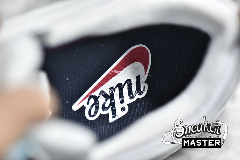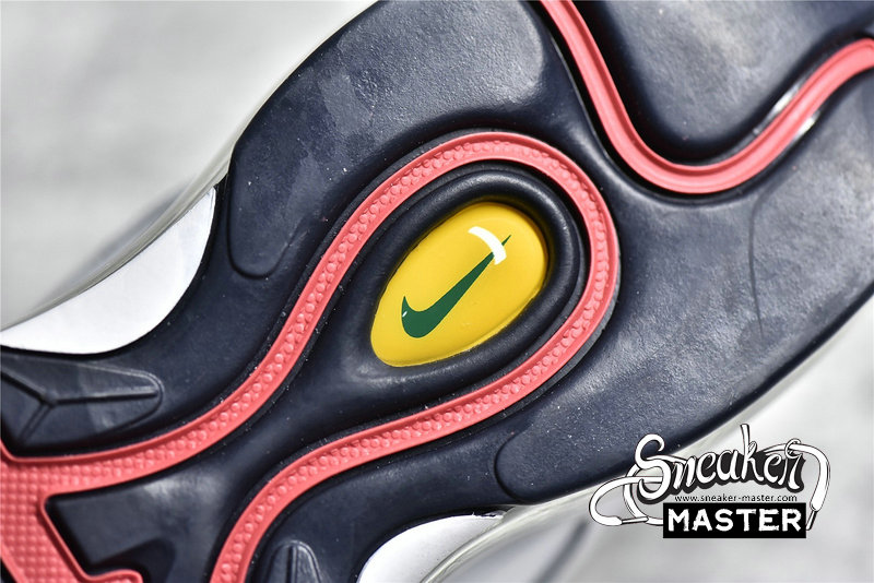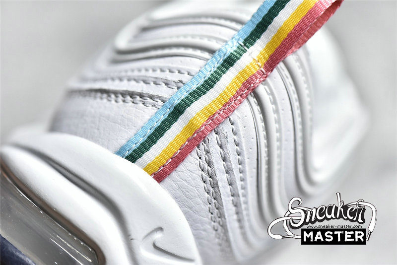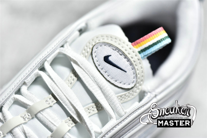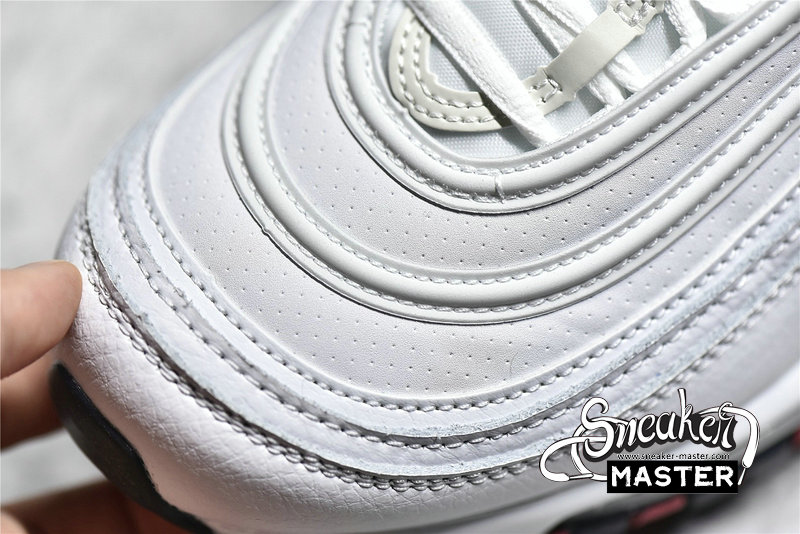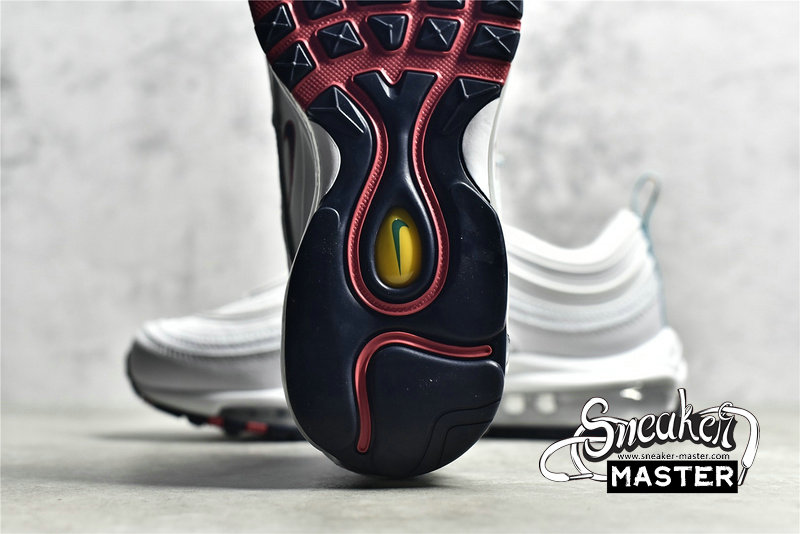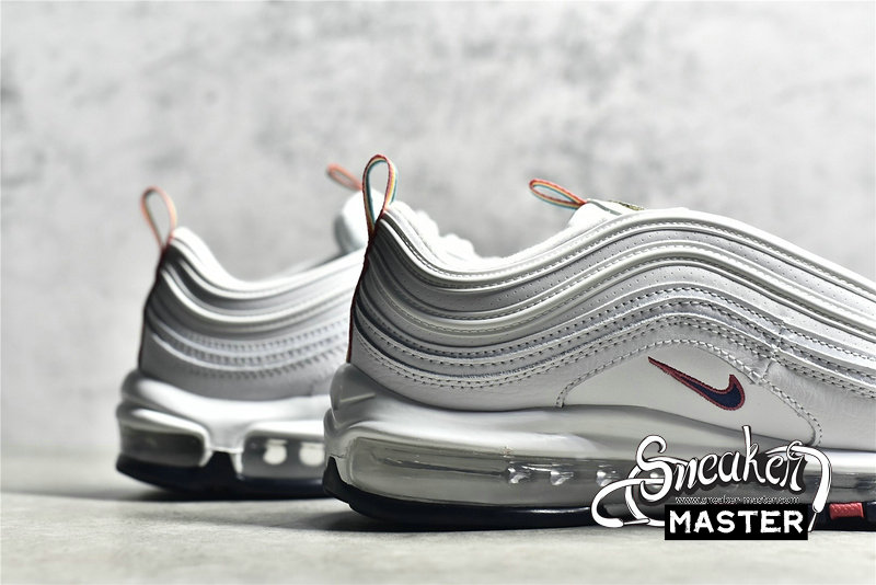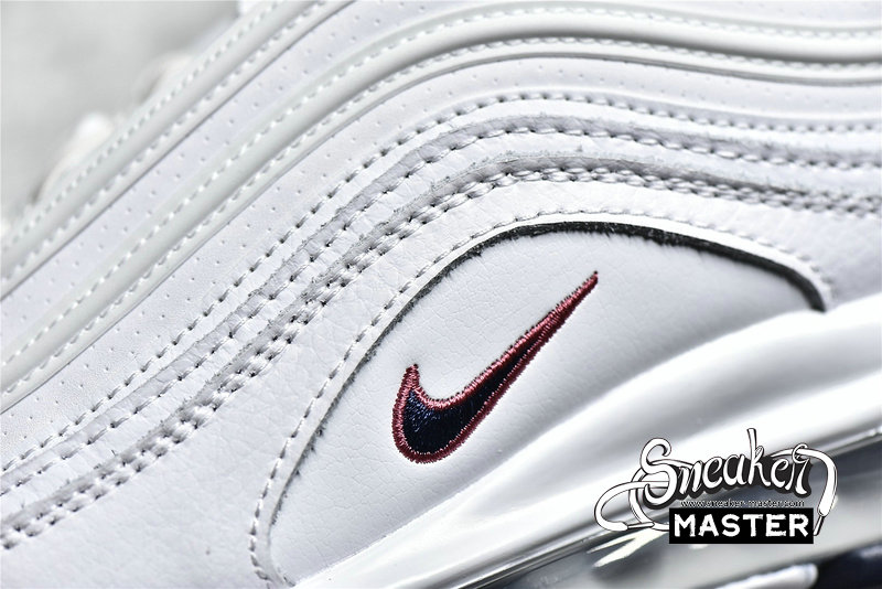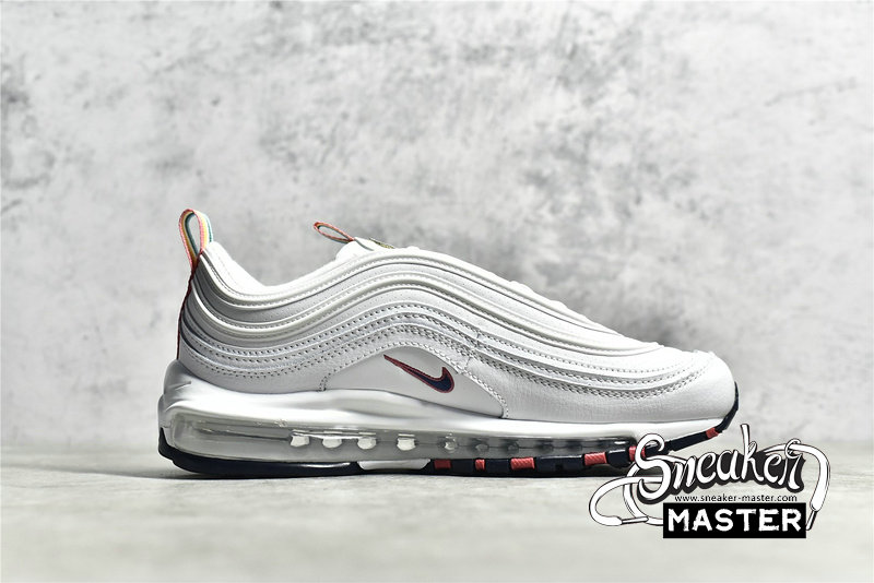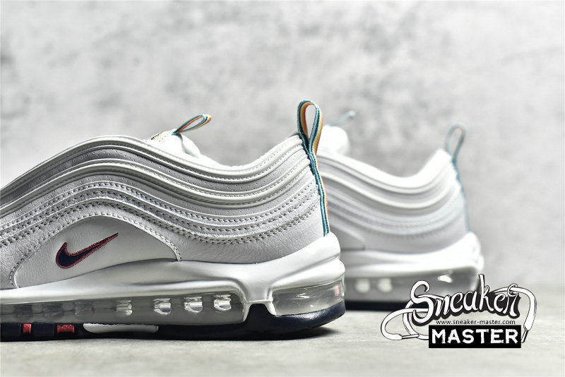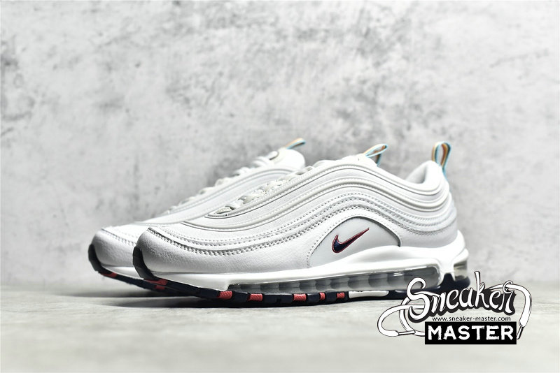 - This offering of the Air Max 97 features an all-White leather base with Navy embroidered Swooshes that are outlined in Red on both lateral and medial sides. Multi-Color pull tabs on the tongues and heels atop a Navy and Red rubber outsole completes the design.